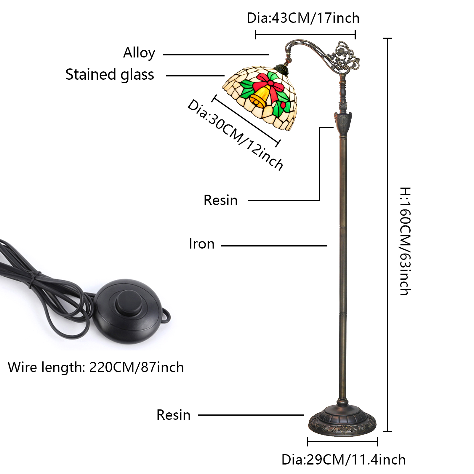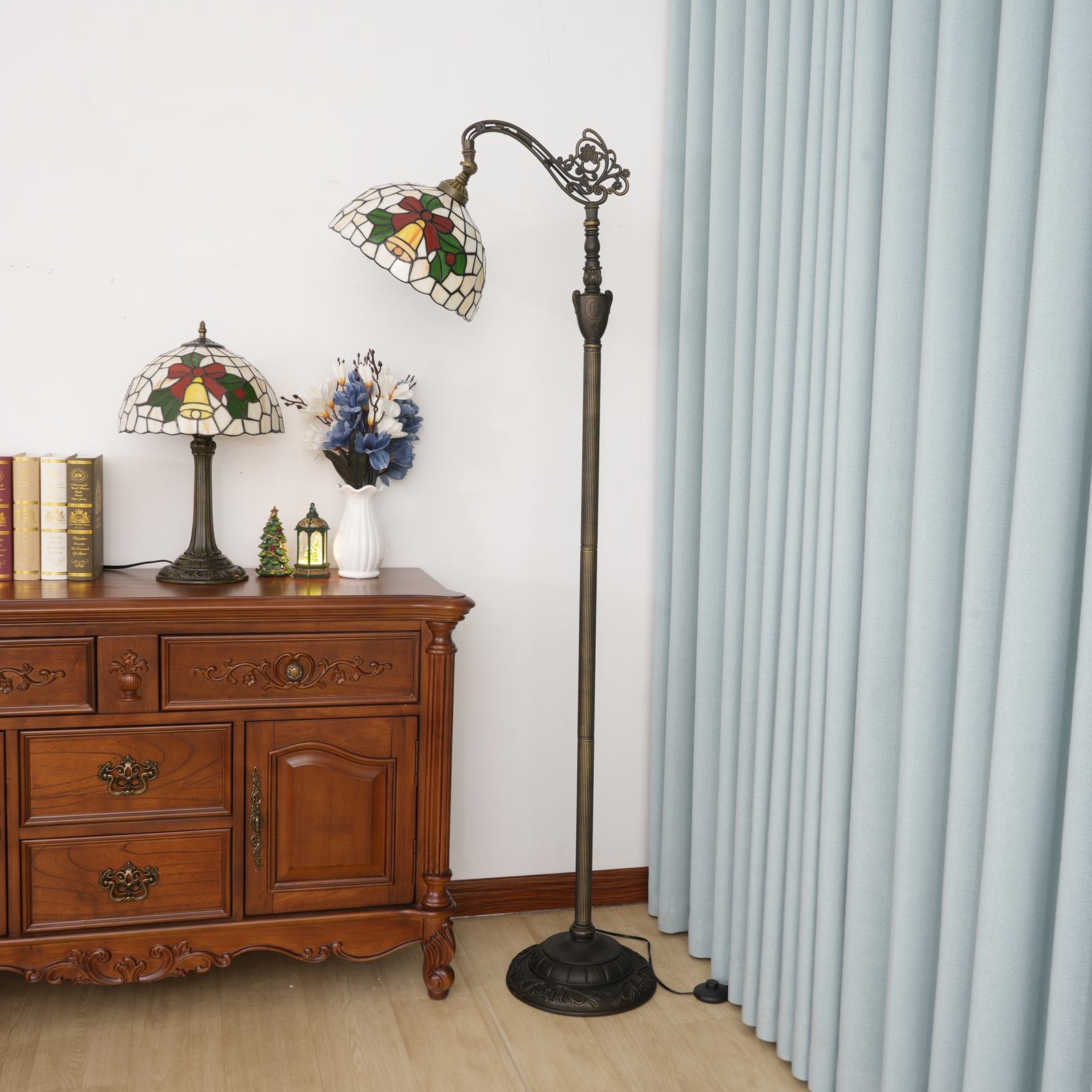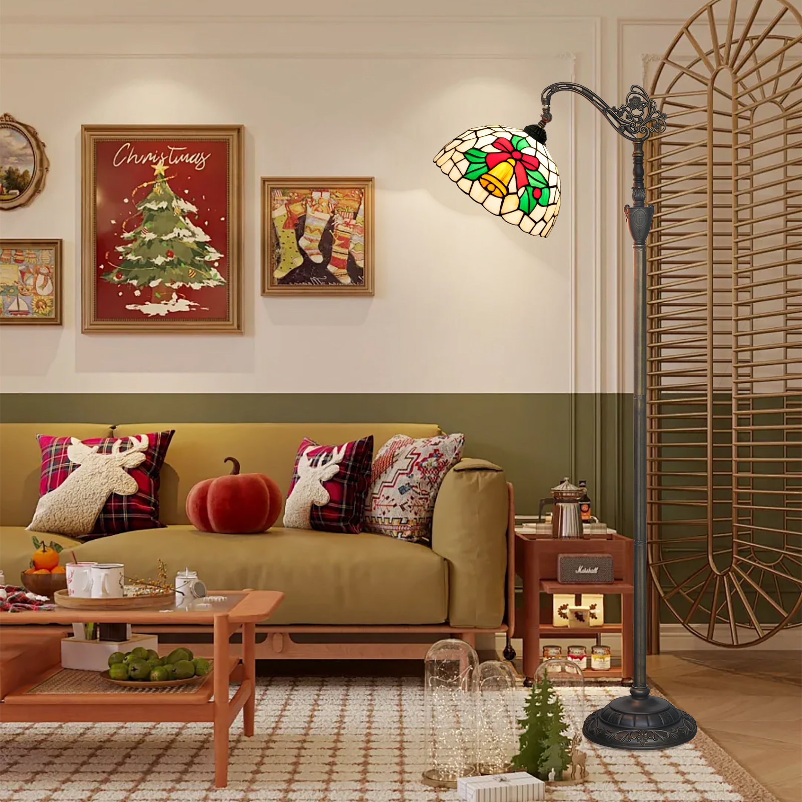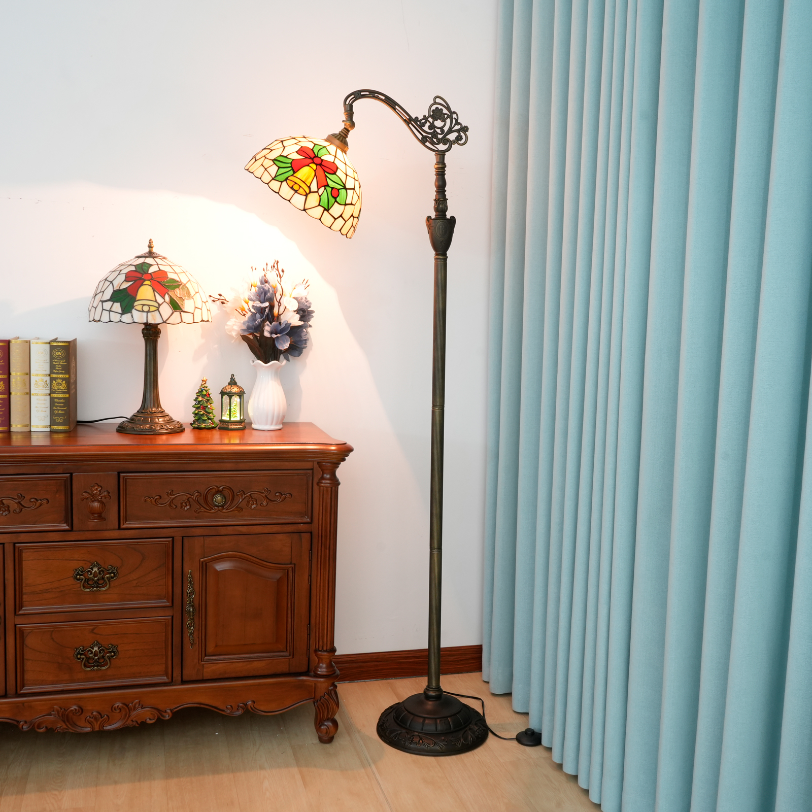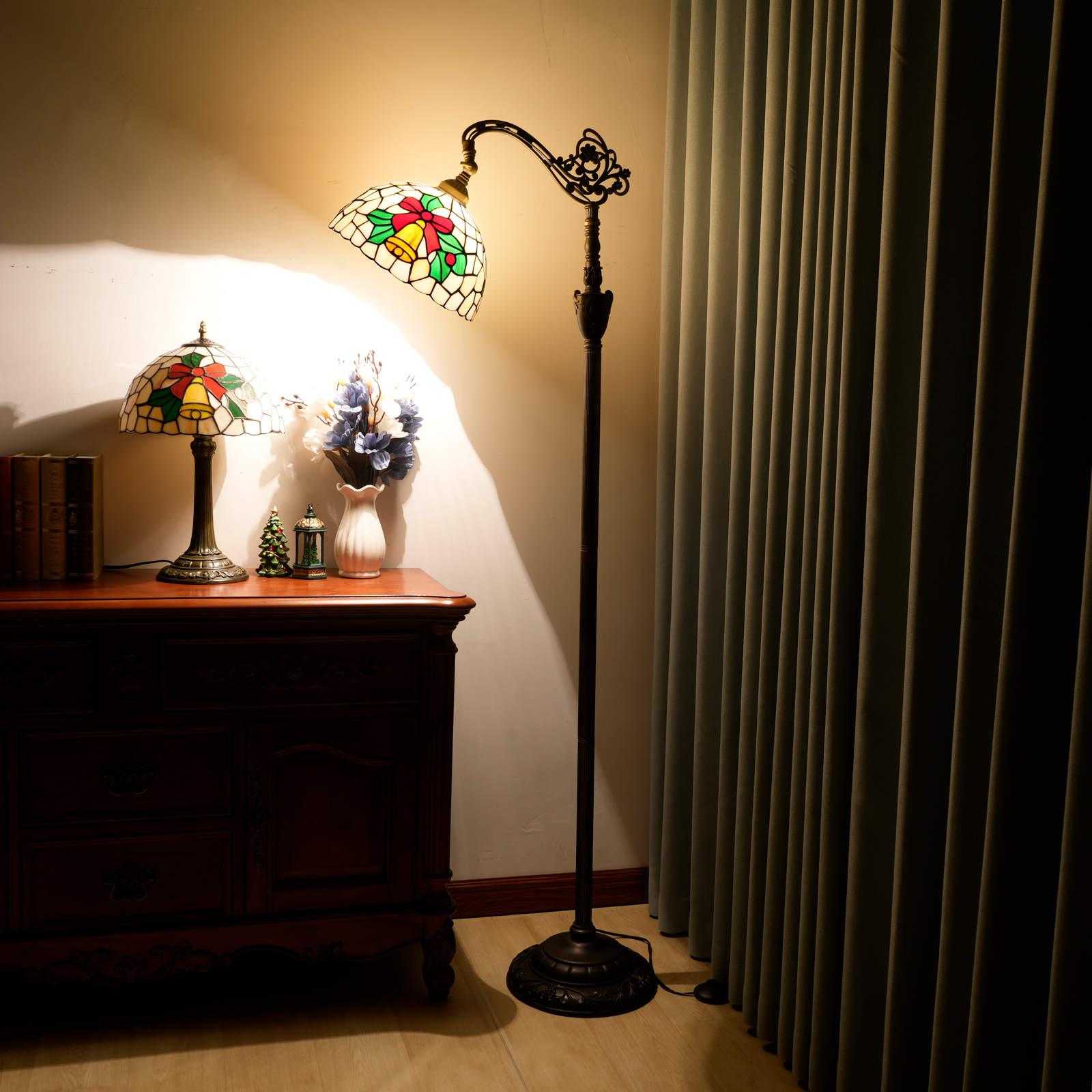 It was only when I got closer that I was astonished: the lampshade was not a cheap printed pattern, but a hand-painted glass Mosaic in Tiffany style - the small yellow bells had a metallic luster, the edge of the red bow could still feel the texture of the glass, the green branches and leaves were transparent and saturated, and even the lead wires between the glasses were made very delicately, not the crude plastic edge.