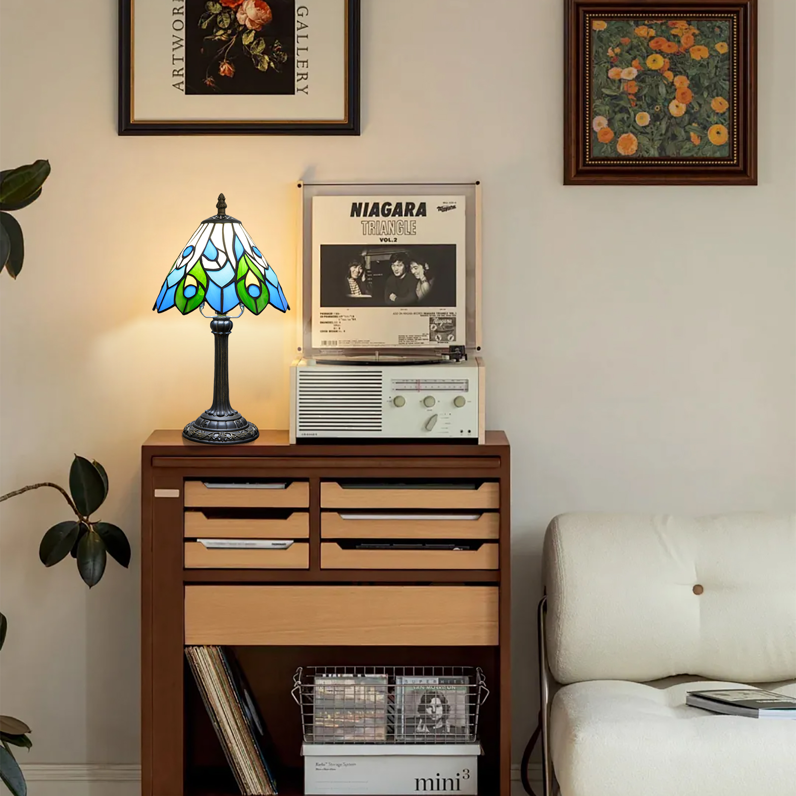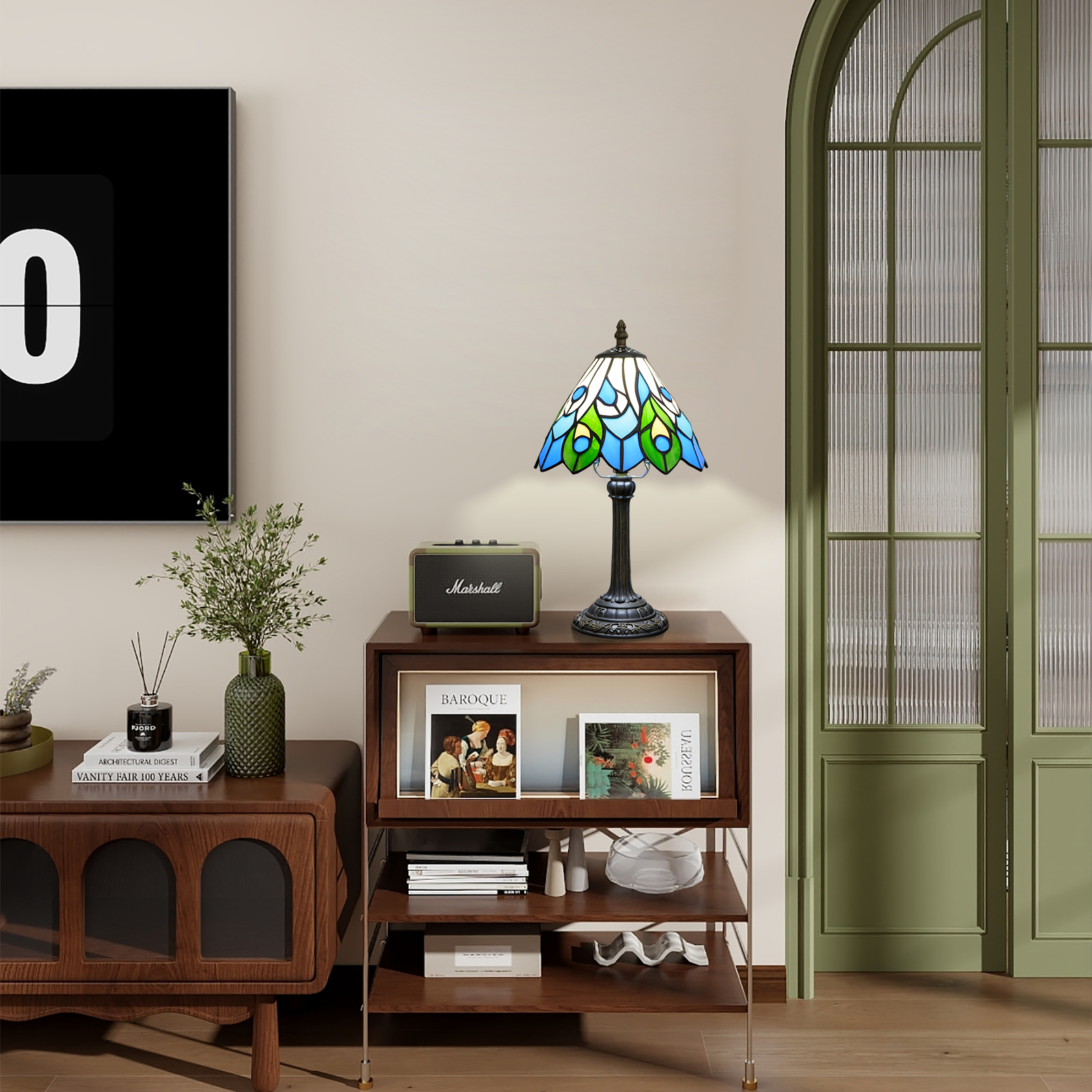 The Tiffany style originated in the United States at the end of the 19th century and was named after its founder, Louis Comford Tiffany. This style, in the design of lighting fixtures, brings the art of colored glass to the extreme, breaking the traditional glass-making techniques. Through dyeing, cutting and splicing the glass, it creates a dreamy, magnificent and artistic light and shadow effect. Our 8-inch Tiffany style polka dot peacock tail table lamp deeply draws on the essence of the Tiffany style and continues its persistent pursuit of colored glass art, bringing classic art back to life in modern home Settings.