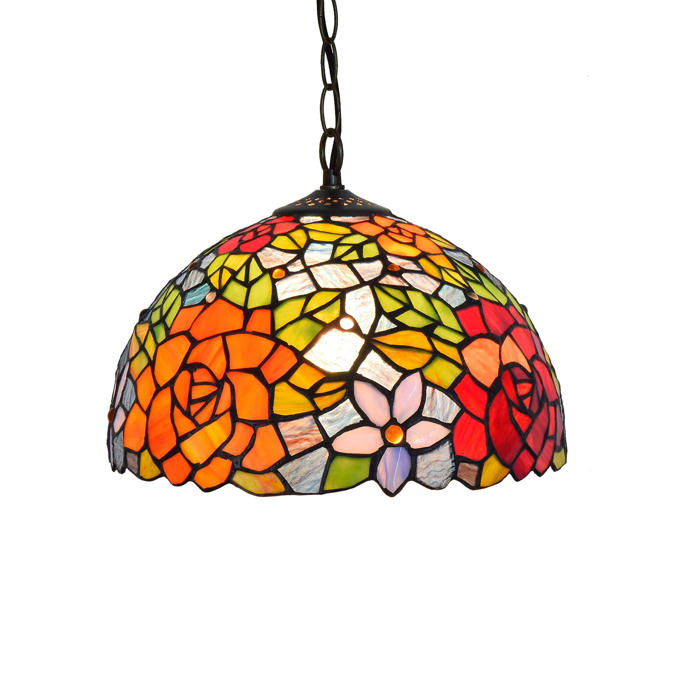 Blivuself Tiffany Style Stained Glass 12-Inch Orange Red Rose Pattern Chandelier European And American Retro Garden Style Suitable For Living Room, Dining Room, Bedroom, Bar And Other Indoor Home Decoration 12-Inch Gorgeous Rose - Conventional Single Chain Chandelier OFP1052