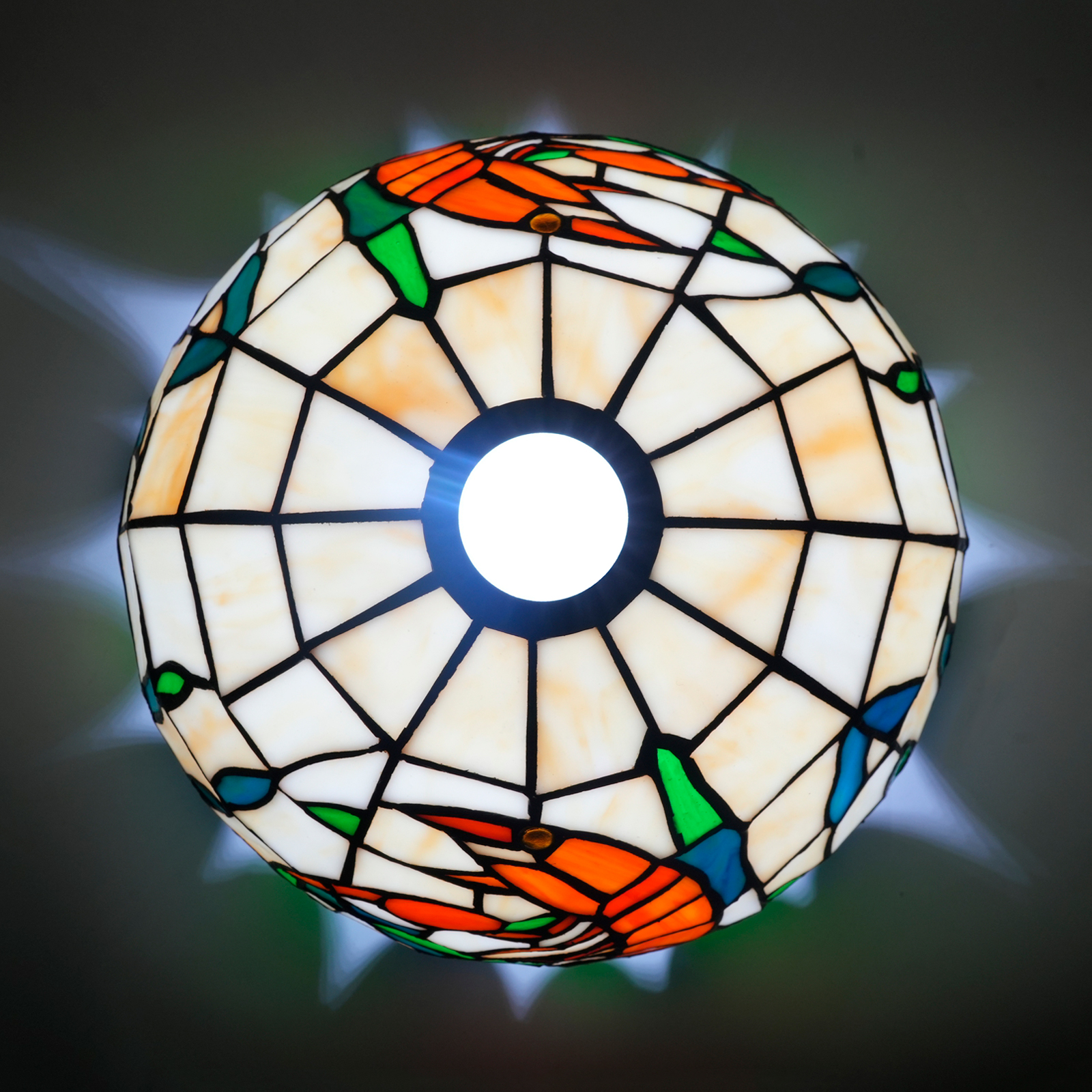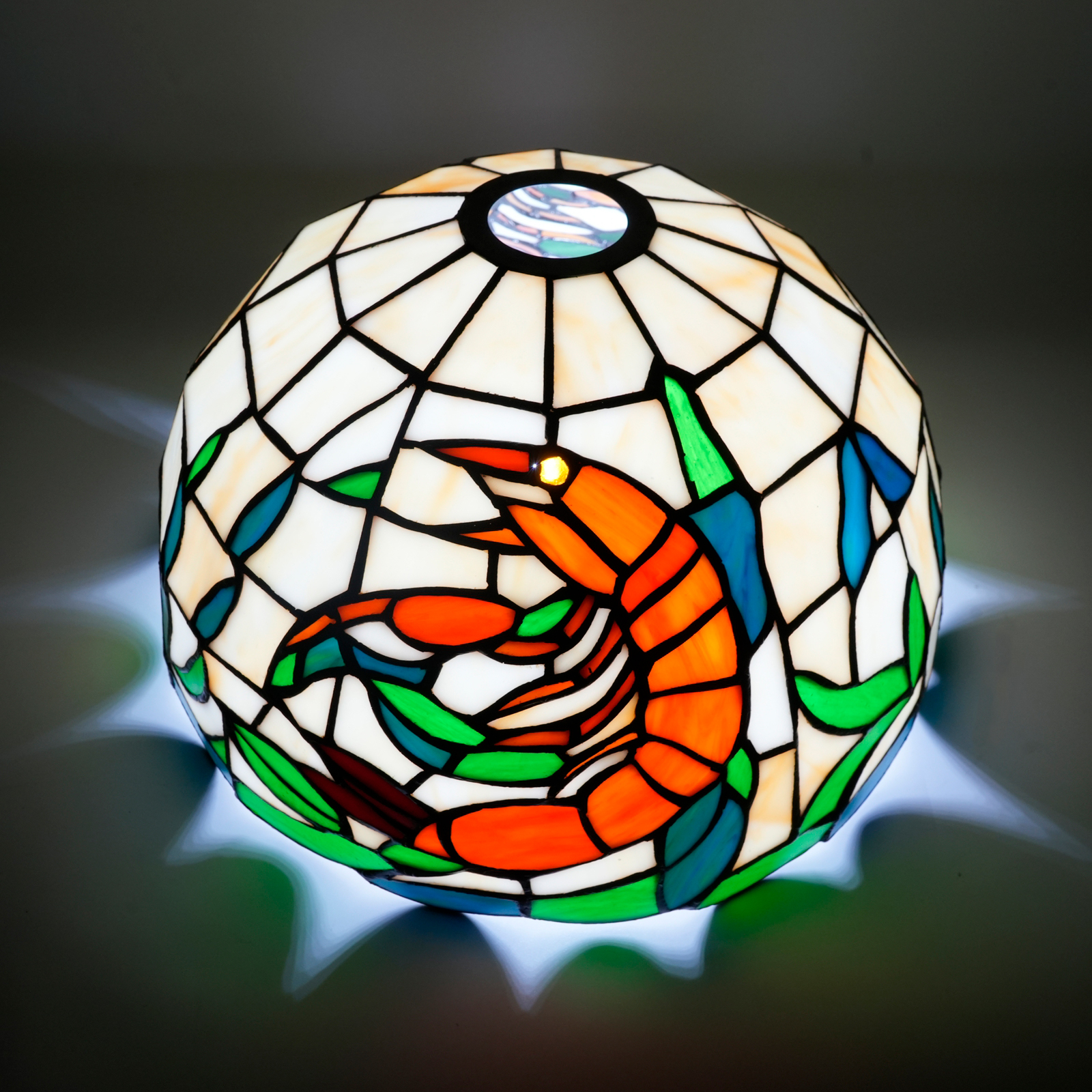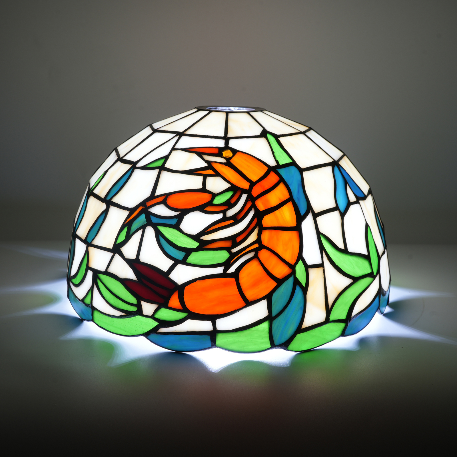 When this lampshade is installed on the floor lamp, it can instantly become the finishing touch in a warm corner of the room. For instance, placed by the window in the bedroom, during the day, it is a beautiful decoration. The orange shrimp pattern shows the brilliant texture of the colored glass under natural light. At night, the light filters through the glass, and the orange shrimp on the lampshade seems to be given life, leaping and dancing in the play of light and shadow, creating a warm, comfortable and artistic resting space, allowing you to immerse yourself in the soft light and beautiful patterns before going to bed.