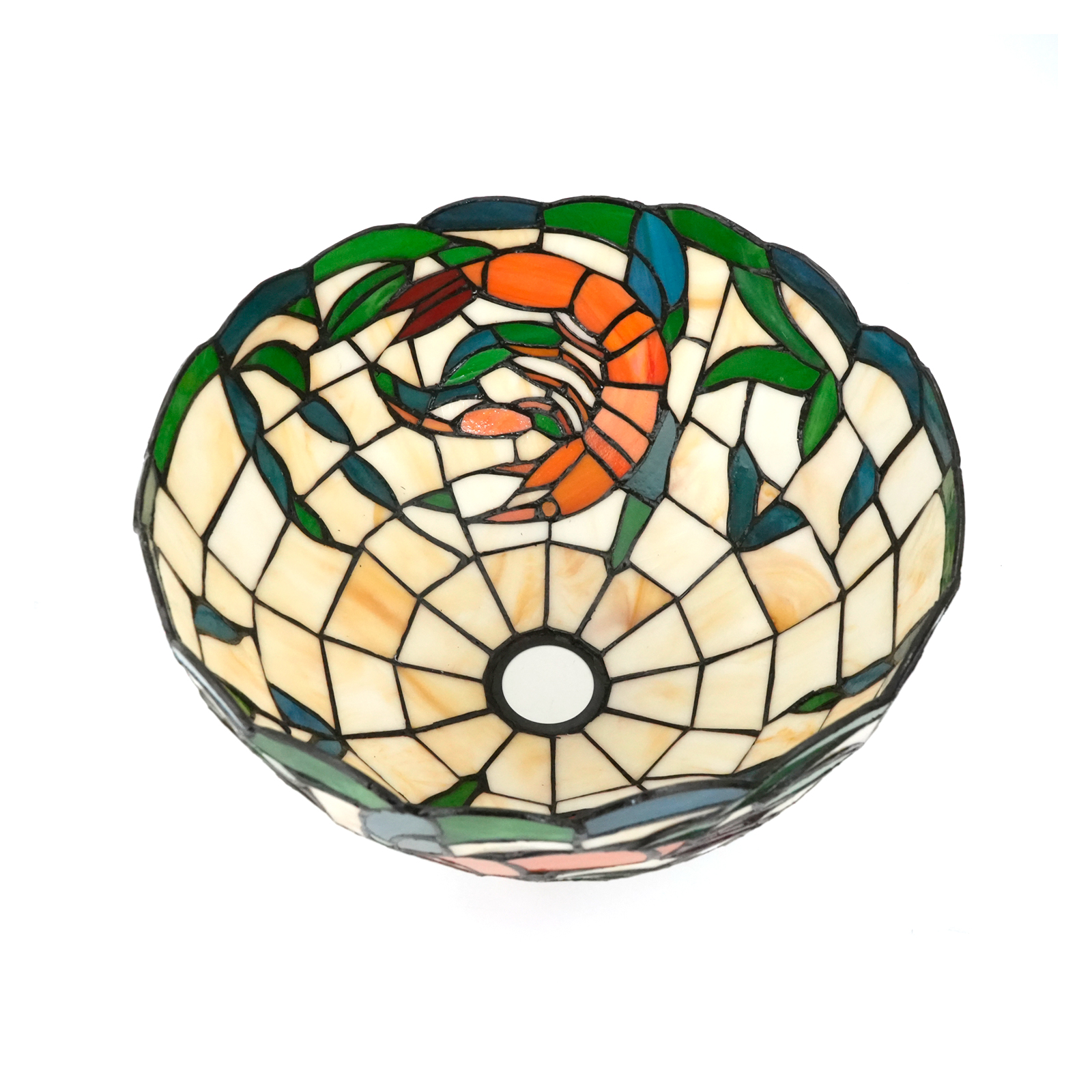This 12-inch (30CM in diameter) Tiffany style colored glass lampshade features a unique orange shrimp pattern as its core design element. It is 17CM in height, with a top hole diameter of 4.2CM and weighs 1.31Kg. The exquisite stained glass craftsmanship ingeniously combines the retro charm with the ocean style, providing an excellent alternative for floor lamps, chandeliers and other lighting fixtures. It is suitable for various home Spaces such as bedrooms and living rooms, easily creating a retro home atmosphere in the style of Tiffany.