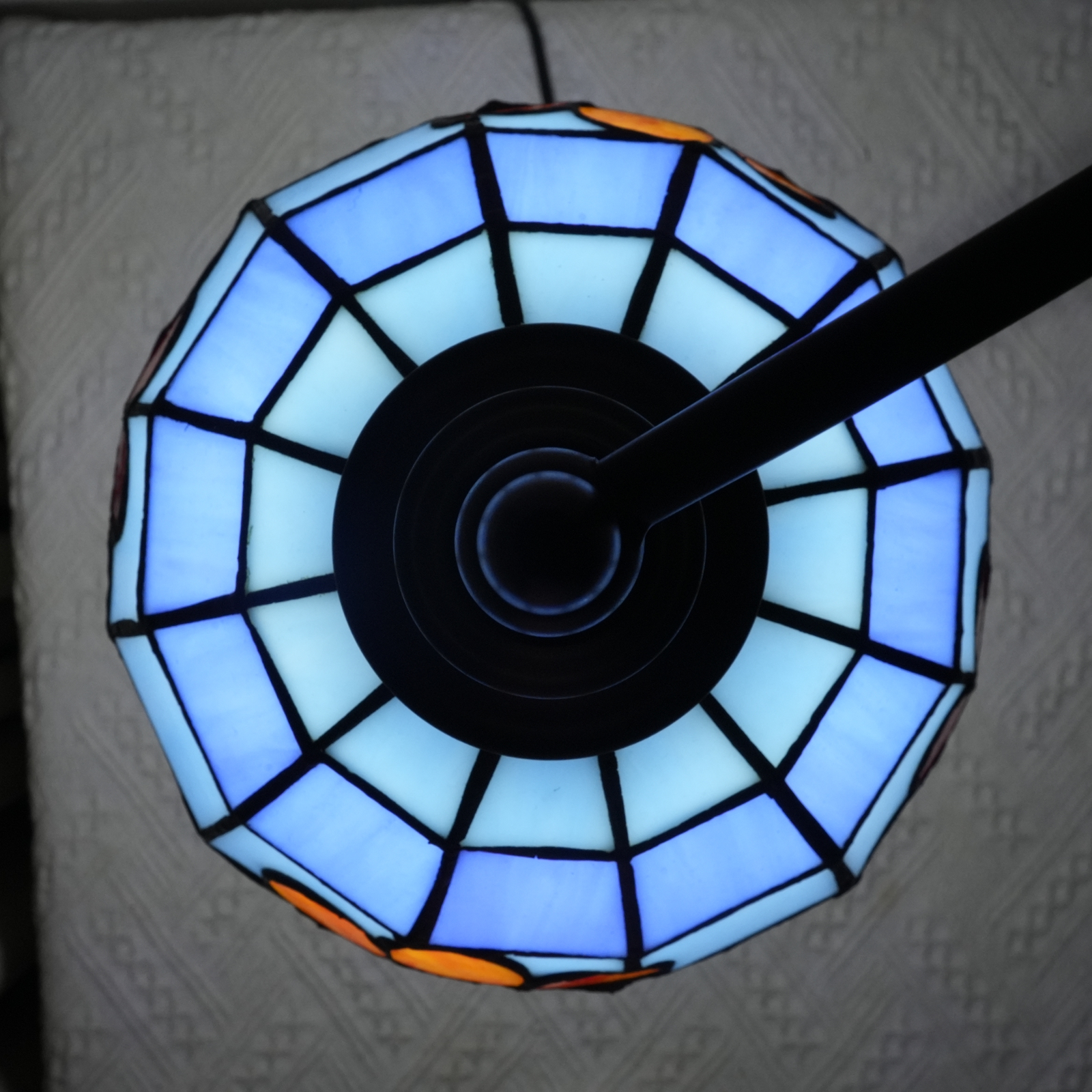 The lampshade is made of exquisite dyed glass (Stained glass), with a fresh blue base color and lifelike colorful cat paw patterns, including warm orange and deep red, etc. Each piece of glass is carefully cut and polished by hand, and then assembled together through meticulous splicing techniques. When the lights come on, the light passes through the stained glass, casting a colorful and soft play of light and shadow, as if the cute cat PAWS are imprinted and dancing in the space, adding a touch of playfulness and warmth to the interior.