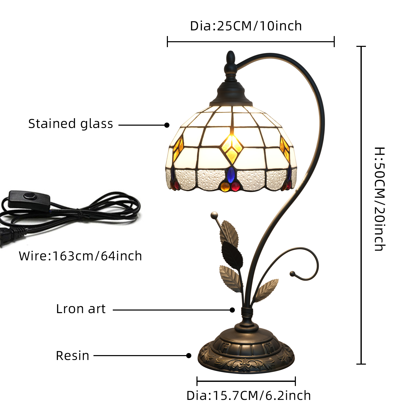 This "8-inch Rhombus Phantom" colored glass table lamp is crafted with handcrafted colored glass techniques to create geometric art. The 25CM diameter lampshade is based on pure white and inlaid with yellow, orange, blue, red and other rhombus colored glass. Each piece of glass is meticulously cut and spliced by artisans, integrating the order of geometric rhombus shapes with the colorful texture of colored glass. The vintage ironwork stand is wound with aged blades, and the resin carved base is decorated with European retro patterns, infusing the neat tension of modern geometry into the retro texture.
