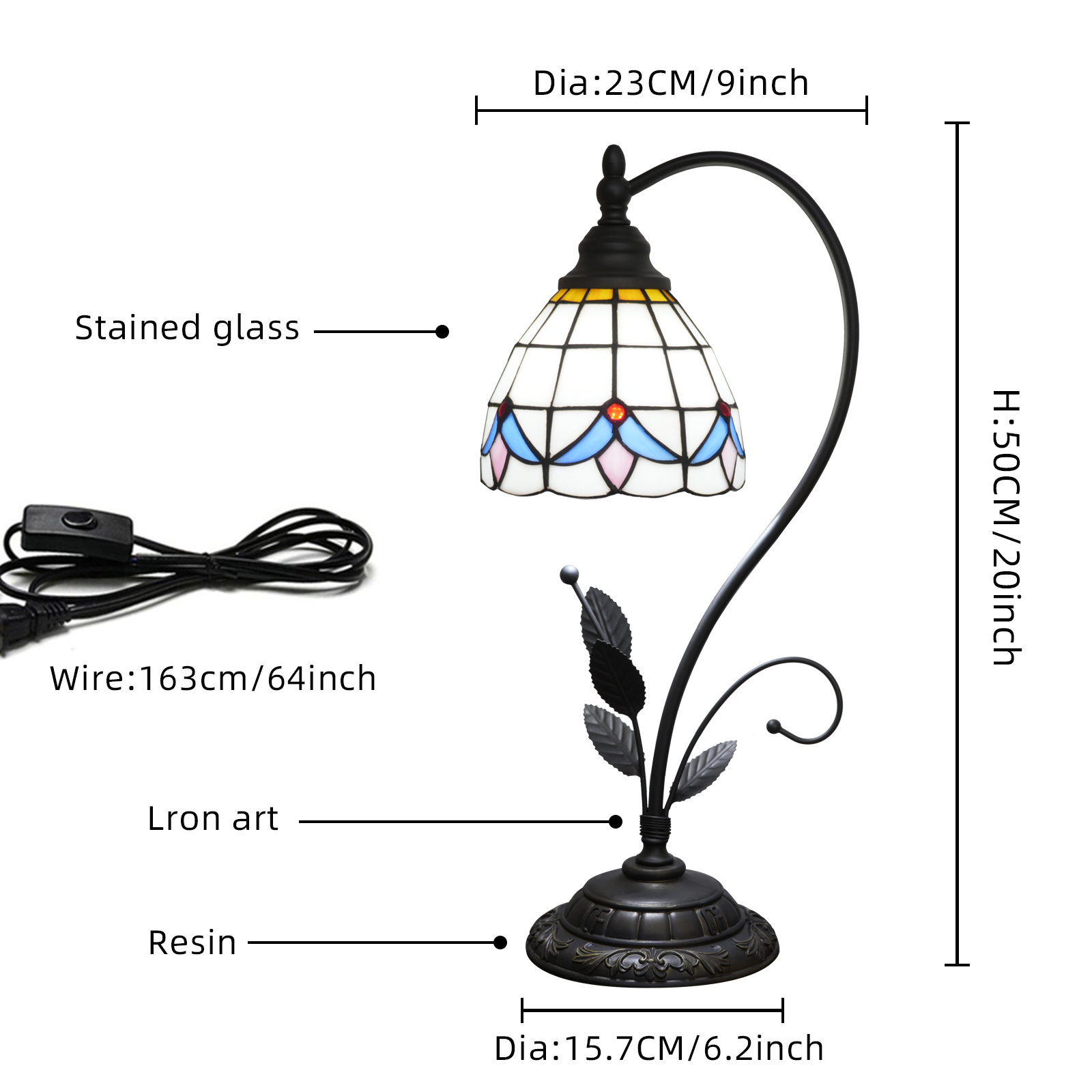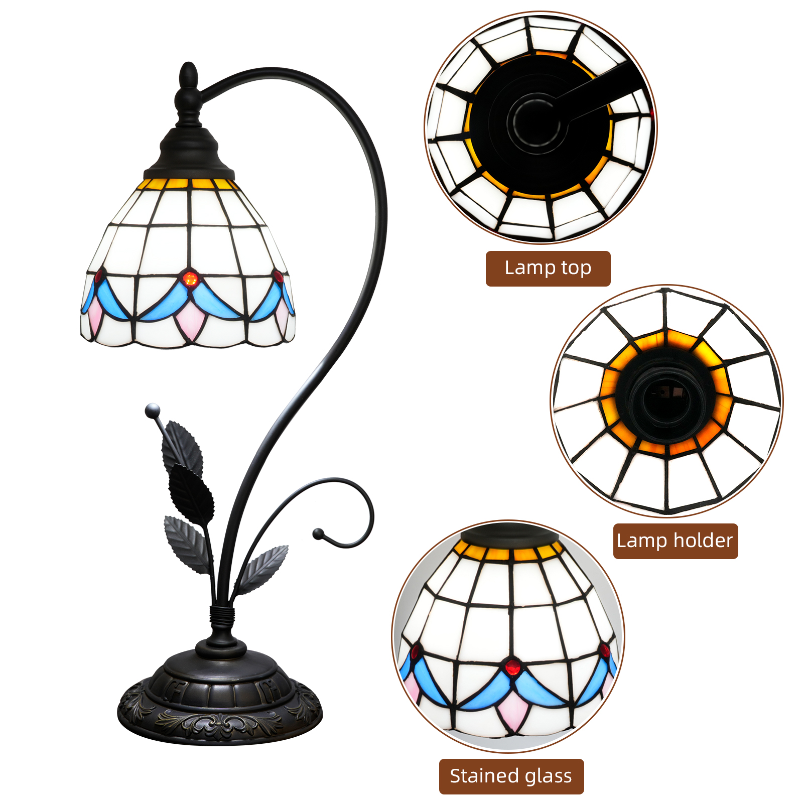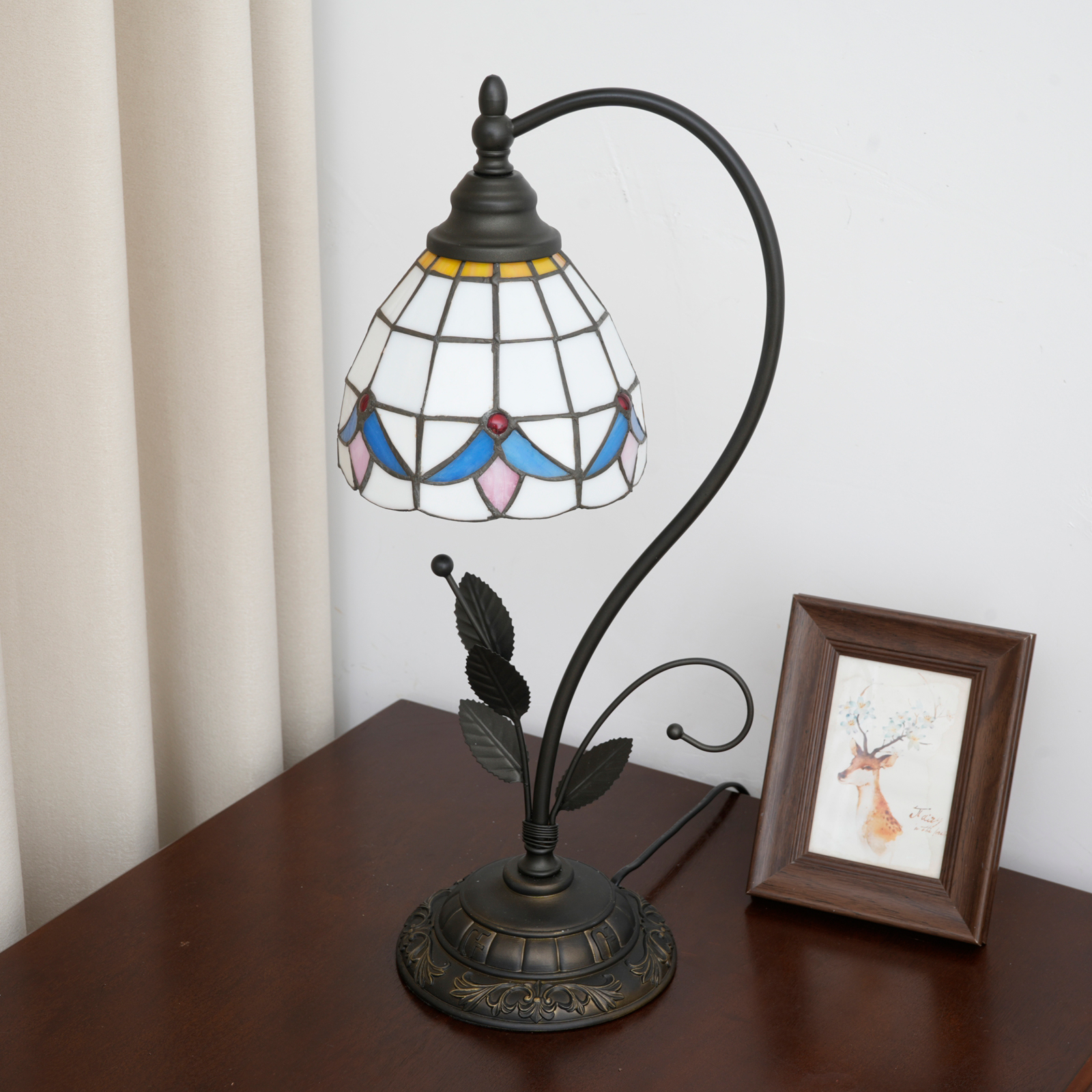 This table lamp is an exquisite example of Tiffany style artistic lighting fixtures. From the material to the design, it exudes retro elegance and craftsmanship warmth. Its lampshade is made of hand-stitched colored glass. The geometric patterns in blue and pink tones are paired with a warm yellow top. Each piece of glass has been finely polished during cutting and welding. When light passes through, it creates a rich and layered artistic halo. The ironwork stand is inspired by natural flower branches, with clear leaf textures and smooth curved arcs. After anti-rust treatment, it is both beautiful and durable. The resin base is engraved with European retro patterns. Its heavy texture not only ensures the stability of the lamp but also enhances the overall artistic and retro style.
