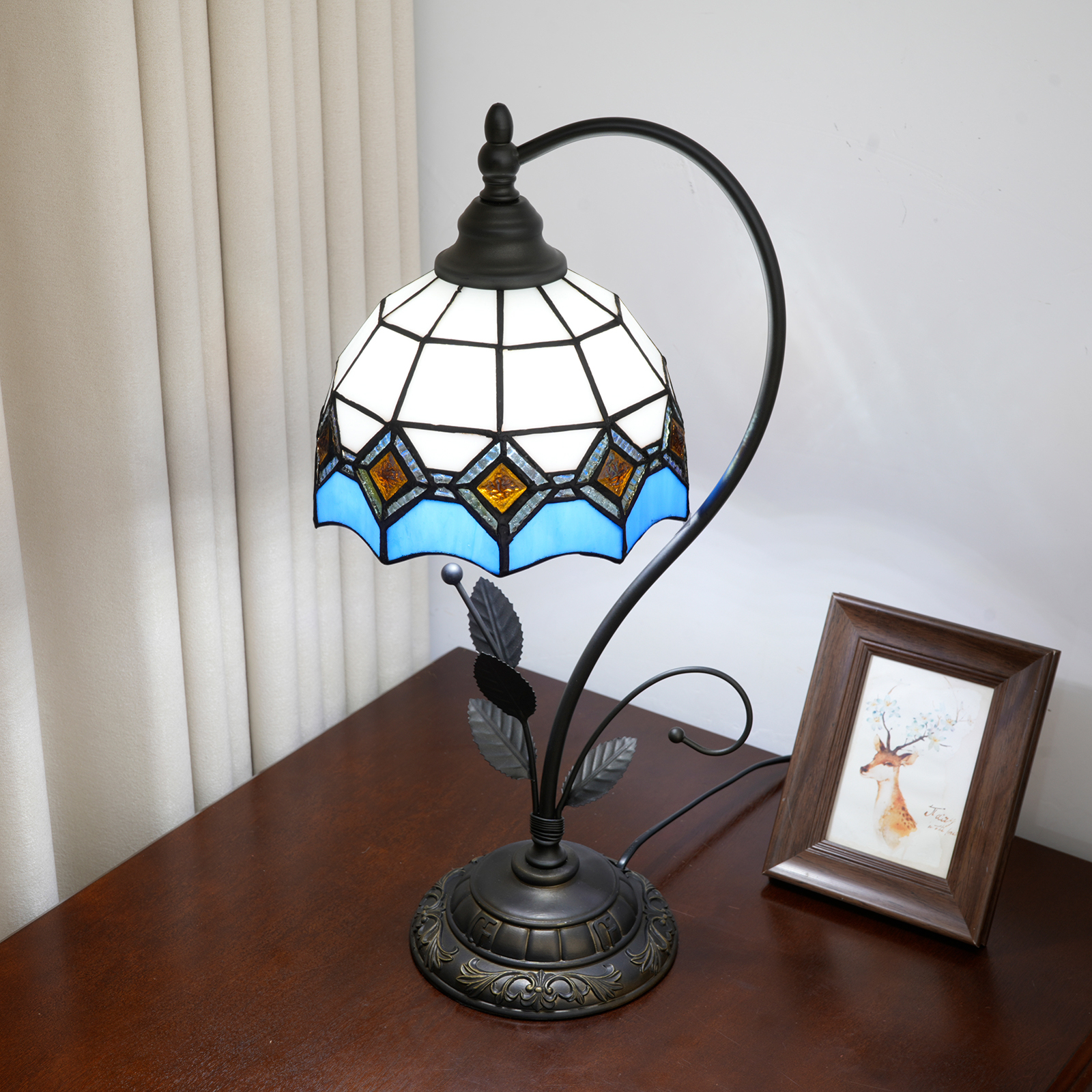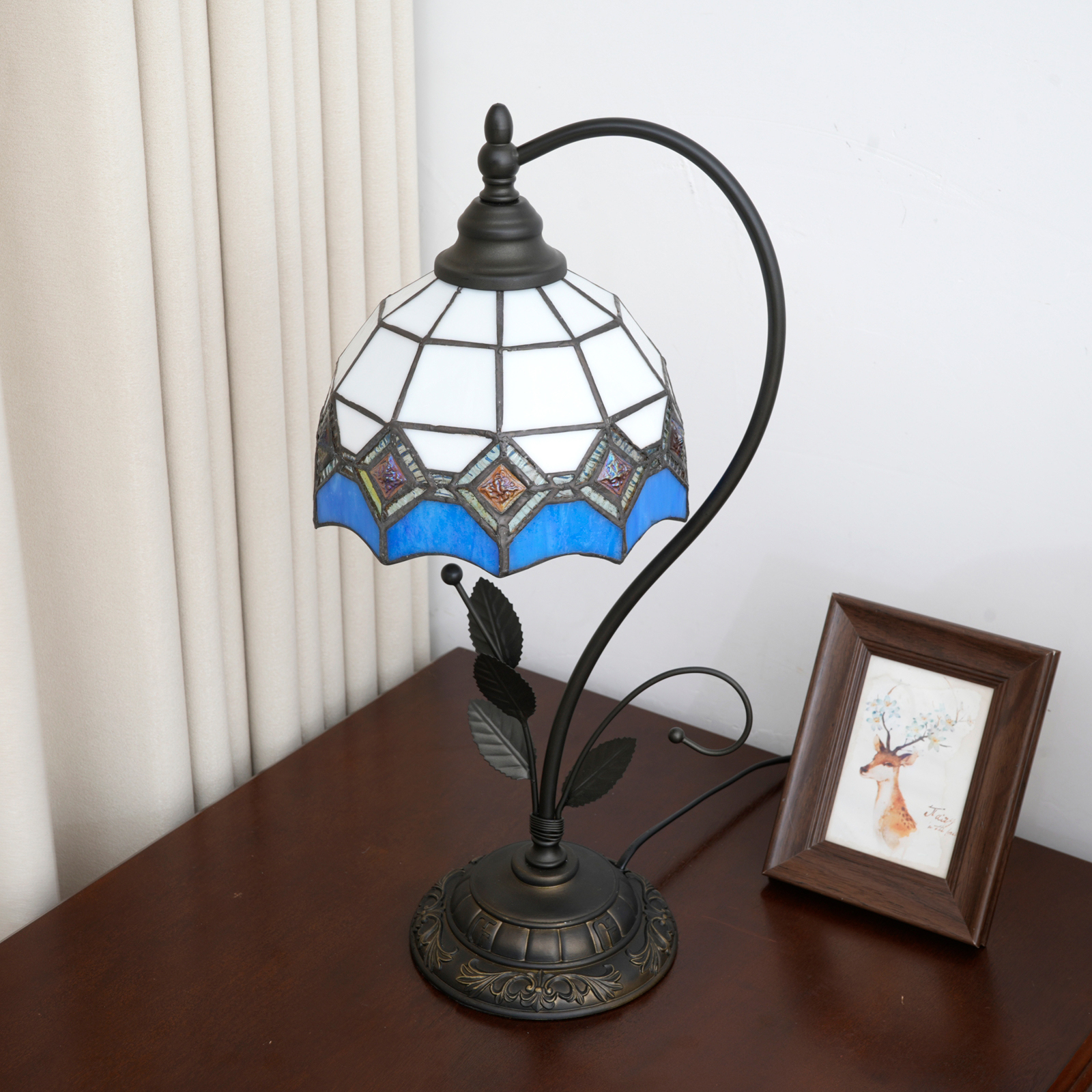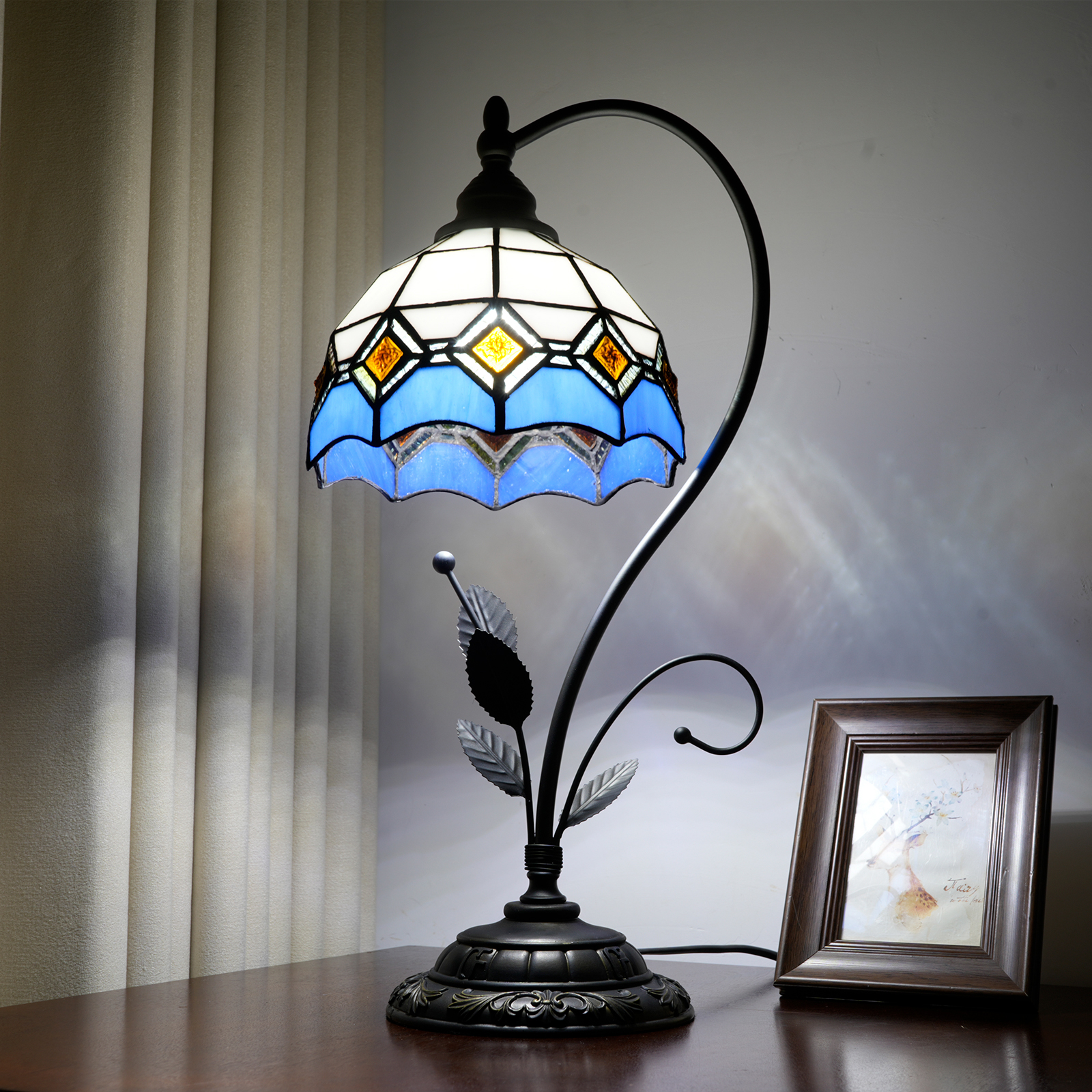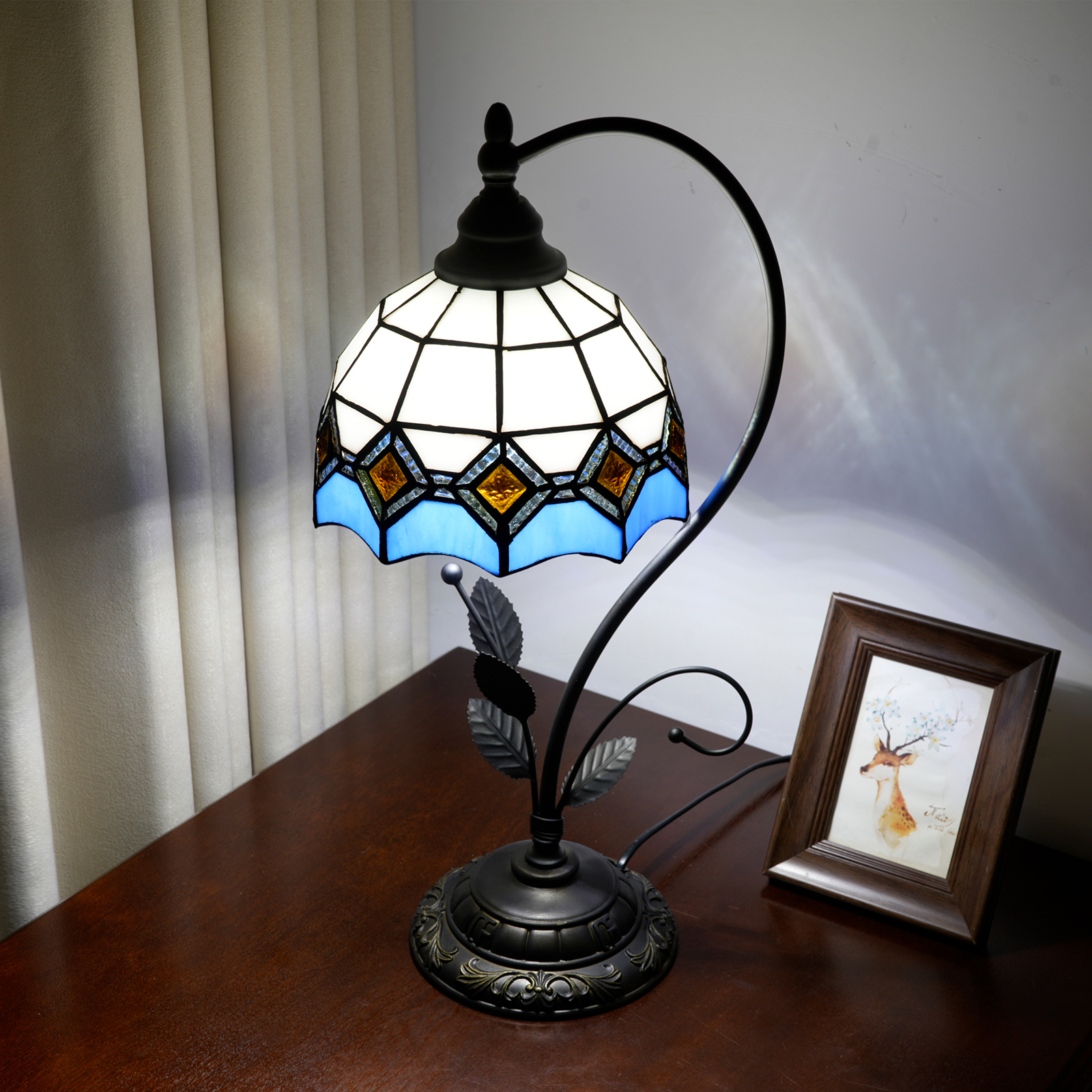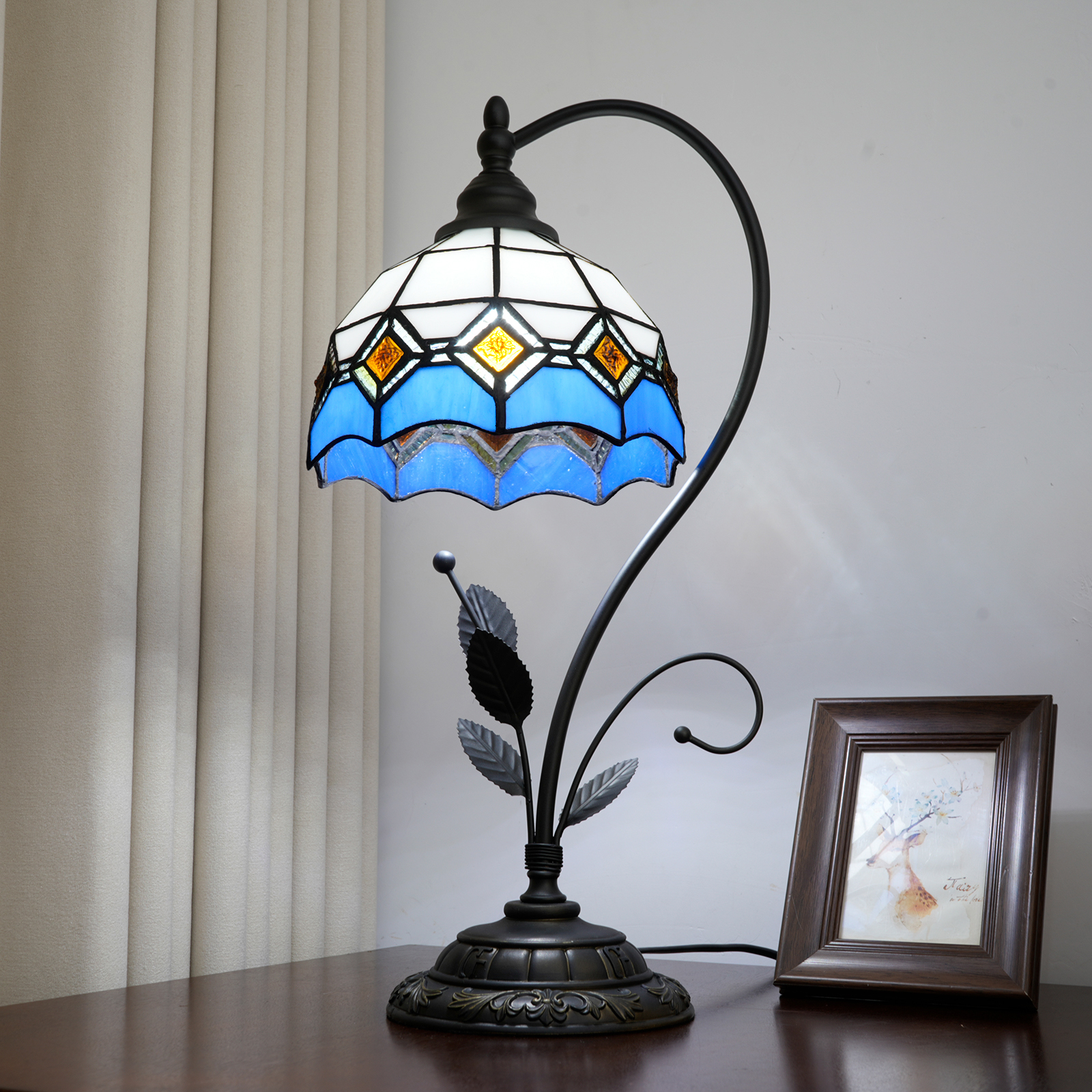 This "8-inch blue circular square" colored glass table lamp interprets the retro geometric aesthetics with the "handcrafted colored glass technique". The 25CM diameter lampshade is based on pure white, with sea blue bands and golden circular squares interwoven. Each piece of glass is meticulously cut and spliced by artisans, integrating the order of geometric loops with the profound elegance of the blue sea. The vintage ironwork stand is wound with aged leaves, and the resin carved base is decorated with European retro patterns, infusing artistic tension into the retro texture.