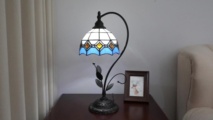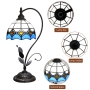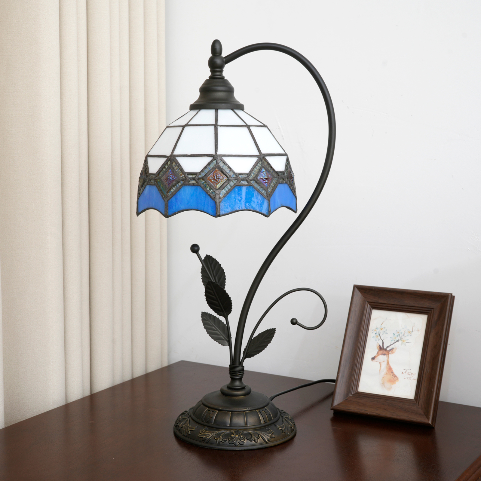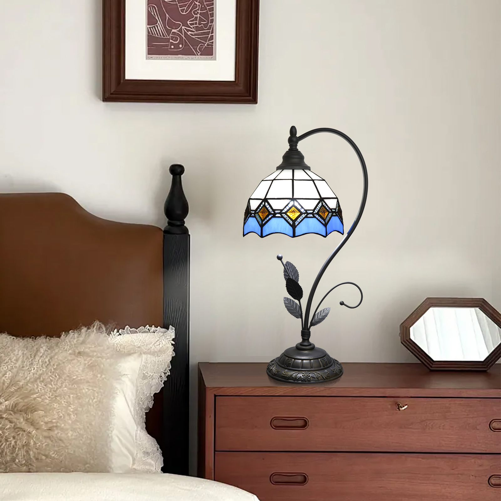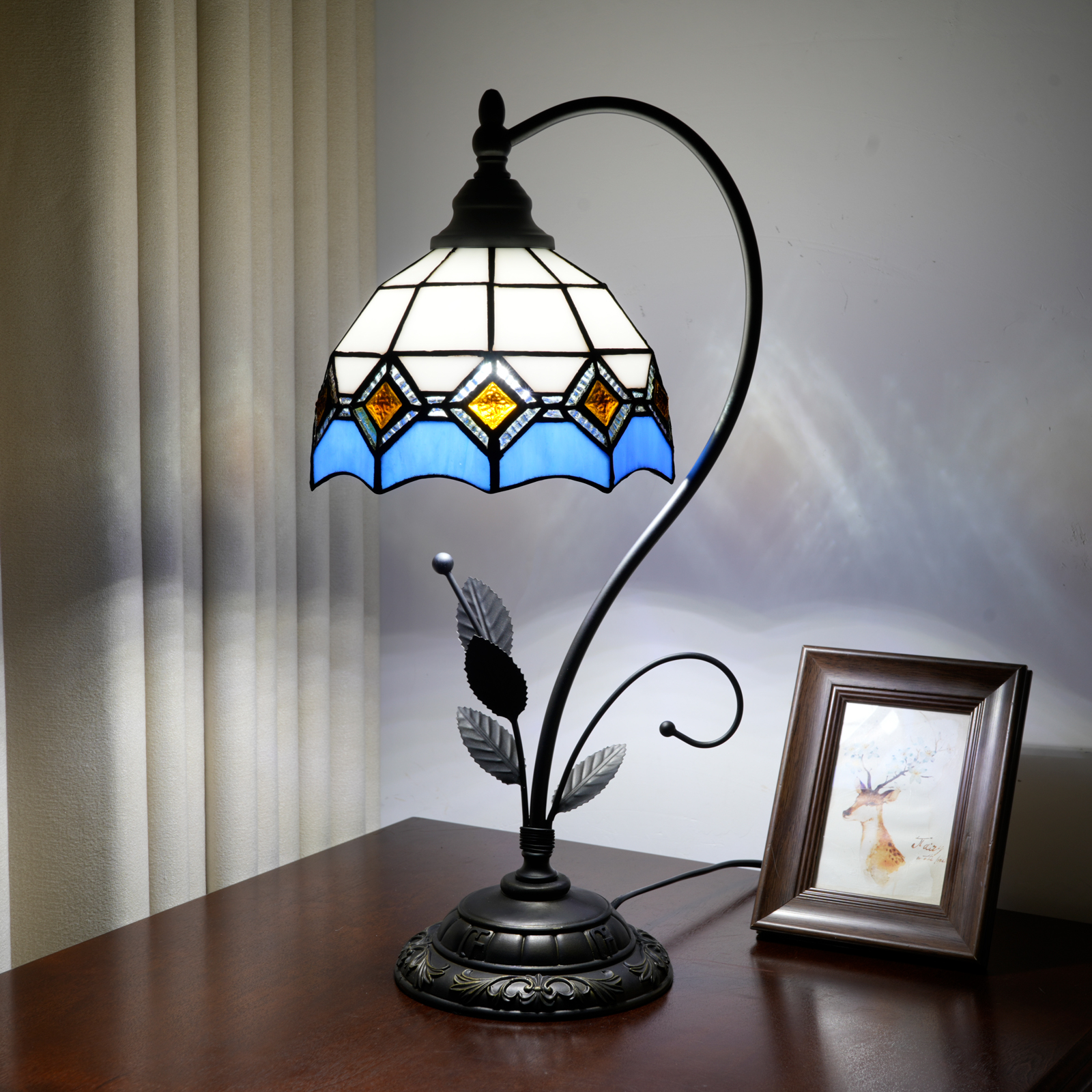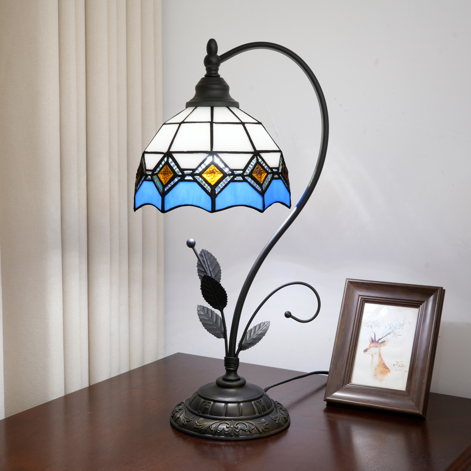 This "8-inch blue circular square" colored glass table lamp interprets the retro geometric aesthetics with the "handcrafted colored glass technique". The 25CM diameter lampshade is based on pure white, with sea blue bands and golden circular squares interwoven. Each piece of glass is meticulously cut and spliced by artisans, integrating the order of geometric loops with the profound elegance of the blue sea. The vintage ironwork stand is wound with aged leaves, and the resin carved base is decorated with European retro patterns, infusing artistic tension into the retro texture.