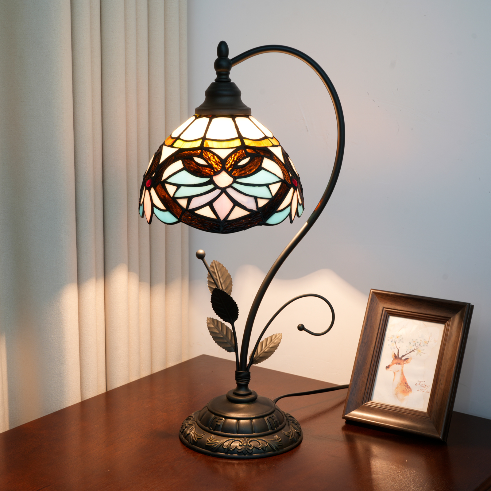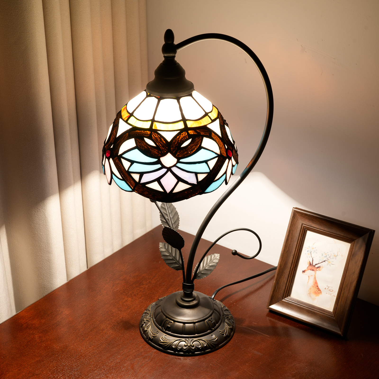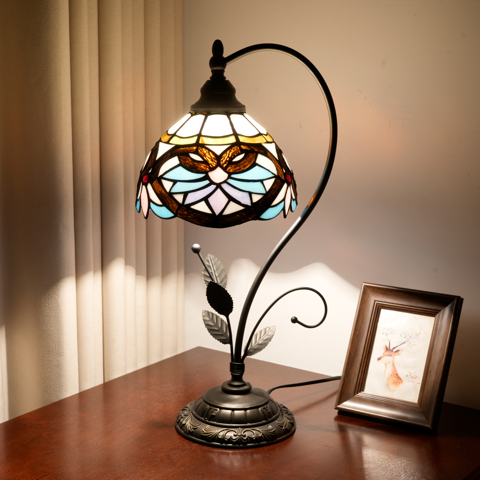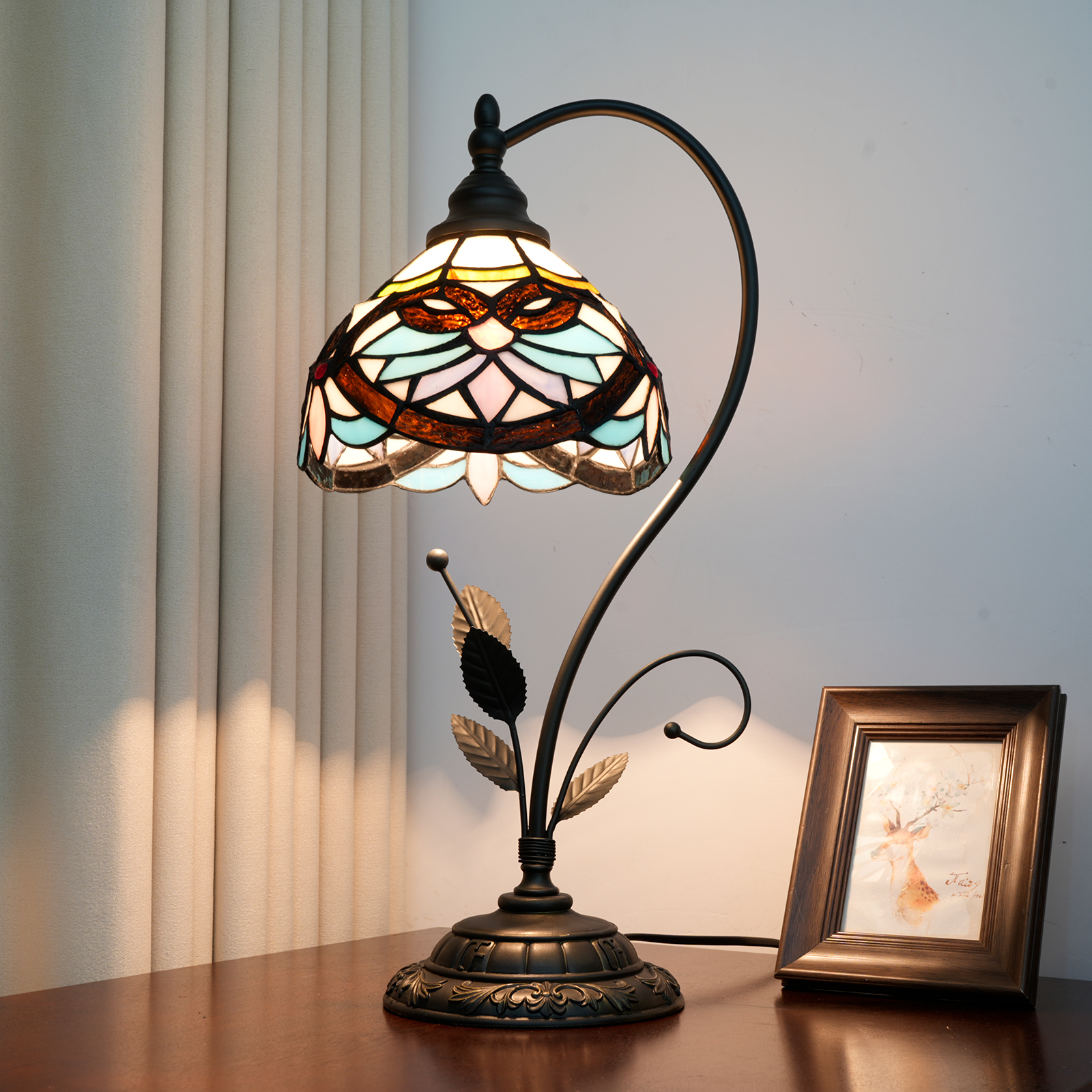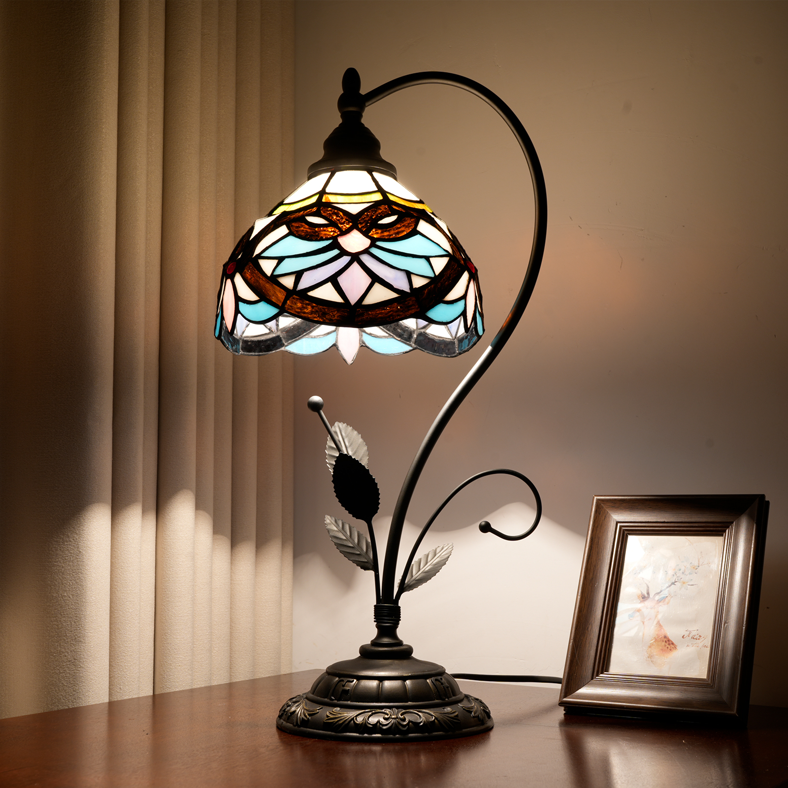 This "8-inch Blue Heart" colored glass table lamp is crafted with pure handcrafted colored glass techniques to create artistic aesthetics. The 25-cm diameter lampshade is mainly in deep blue, interwoven with pink, brown and other colors, outlining an artistic heart pattern. Each piece of glass is meticulously cut and spliced by artisans, transforming romantic sentiments and retro artistic textures into tangible aesthetic collectibles. The vintage ironwork stand is wound with aged leaves, and the resin carved base is decorated with European retro patterns, infusing retro tension into the artistic texture.