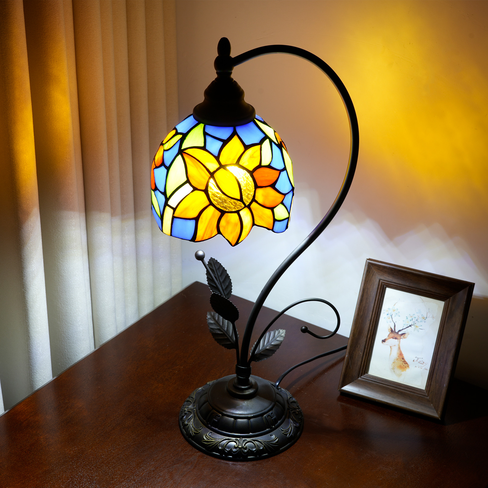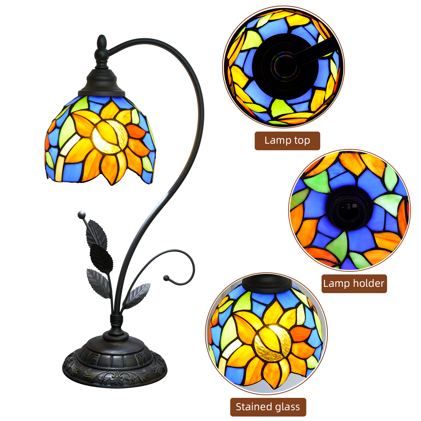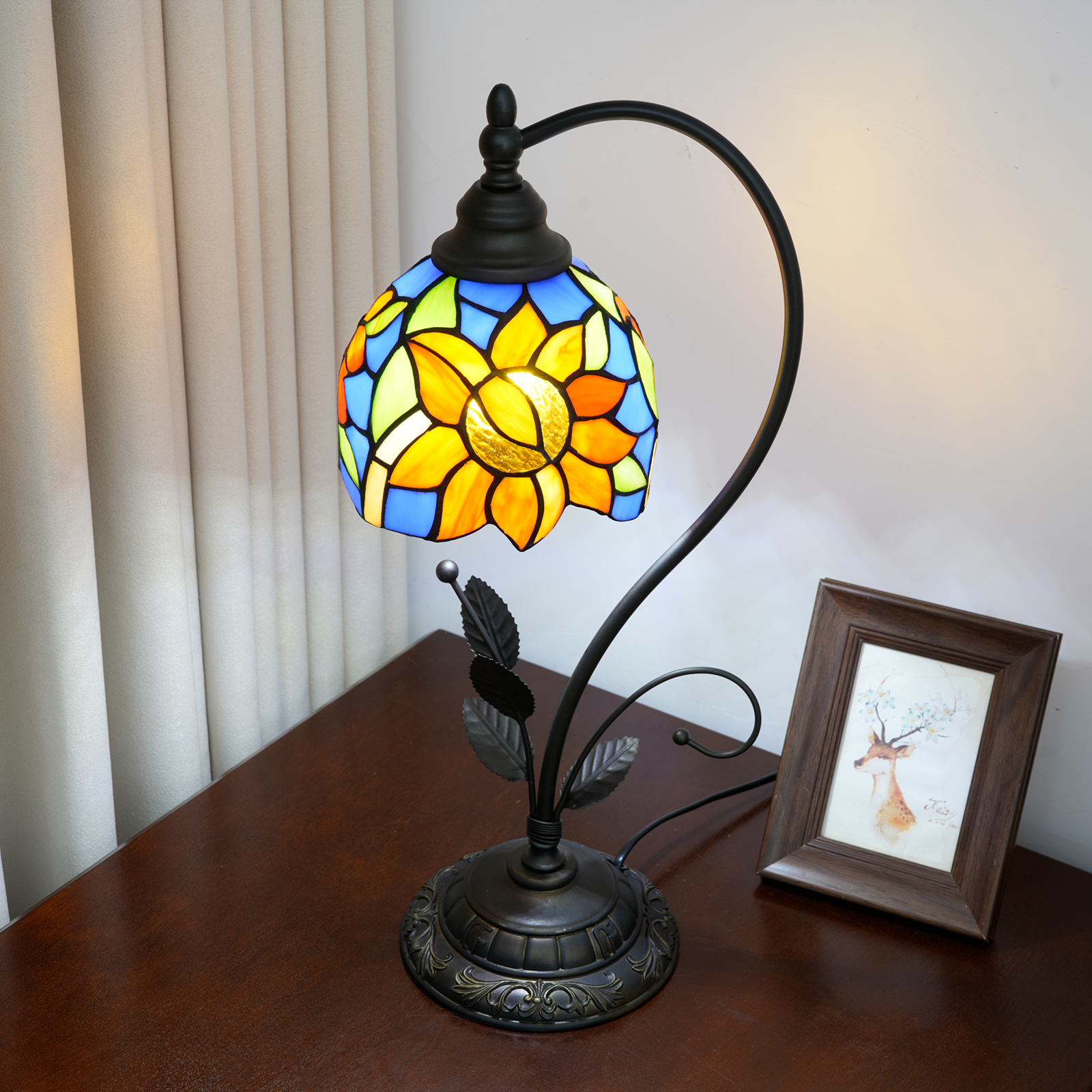This blue sunflower-shaped Tiffany table lamp is an artistic masterpiece that combines the "sunny vitality of sunflowers" and "Tiffany's century-old craftsmanship" in the play of light and shadow. The lampshade is made of hand-stitched colored glass, with a clear blue background. The orange-yellow sunflower petals are vivid and plump. Each piece of glass is cut and welded by hand by artisans, and the texture and color transition of the petals fully demonstrate the precision of the craftsmanship. The moment the lights are turned on, warm light filters through the glass, projecting the vitality of sunflowers and the freshness of the blues into the space, as if sealing the brightness of an entire summer garden within.