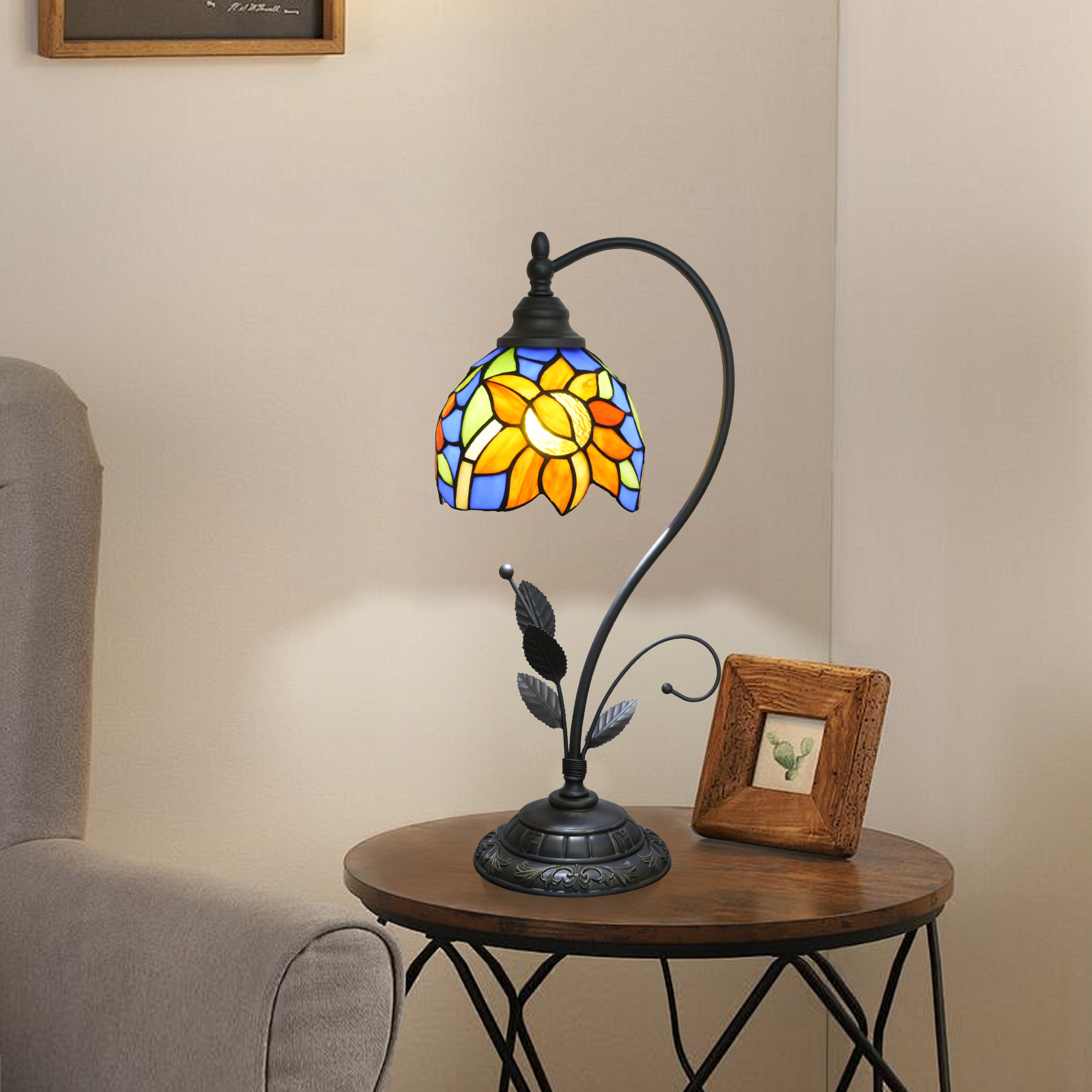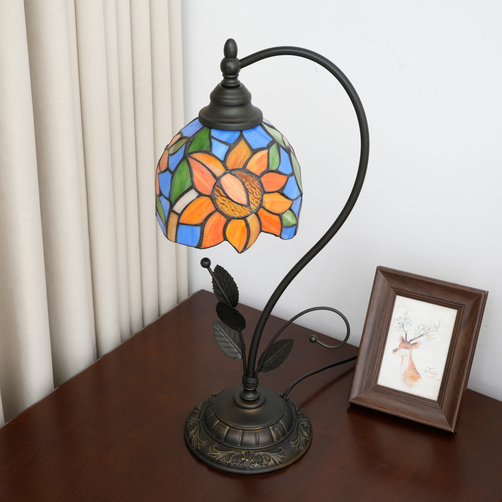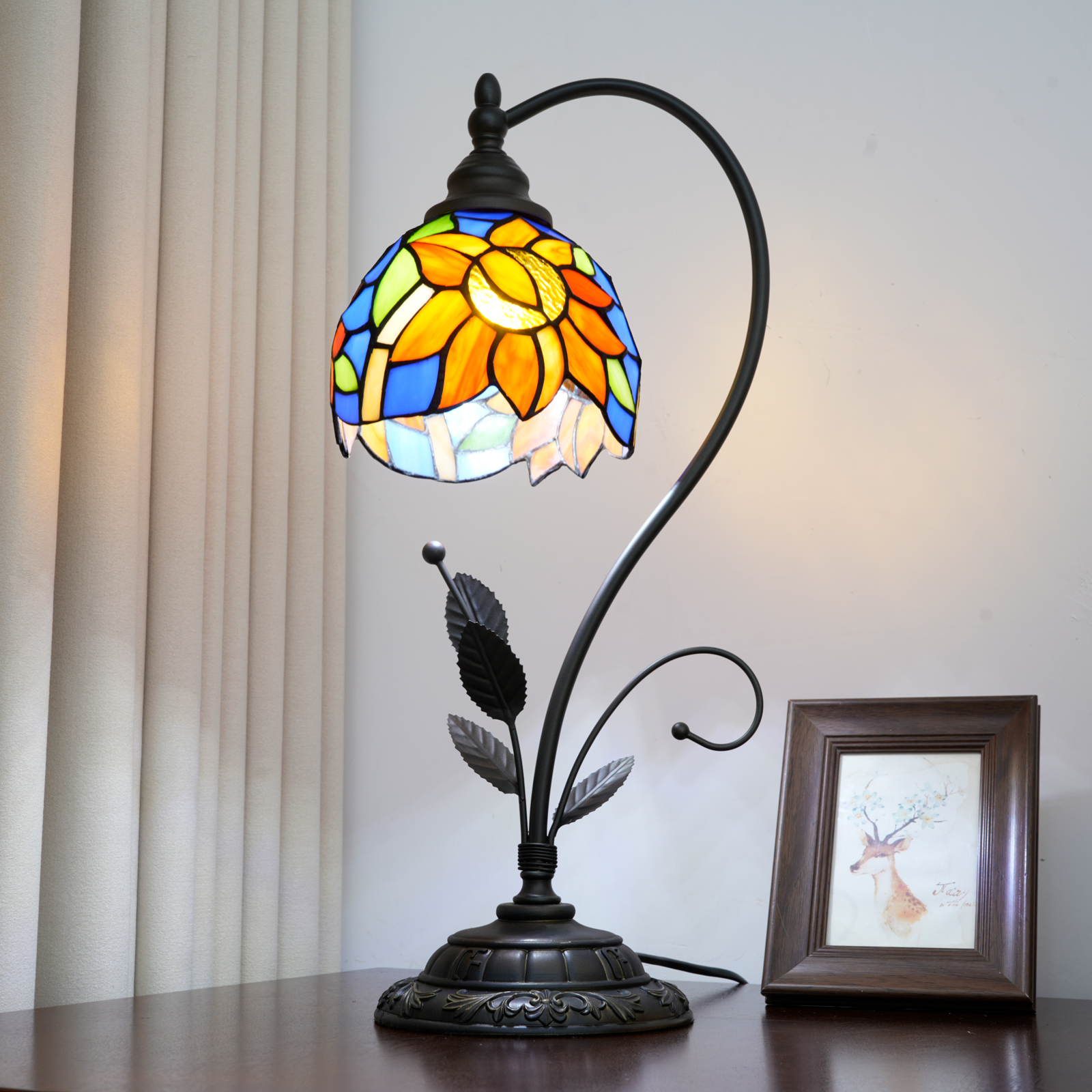 This blue sunflower-shaped Tiffany table lamp is an artistic masterpiece that combines the "sunny vitality of sunflowers" and "Tiffany's century-old craftsmanship" in the play of light and shadow. The lampshade is made of hand-stitched colored glass, with a clear blue background. The orange-yellow sunflower petals are vivid and plump. Each piece of glass is cut and welded by hand by artisans, and the texture and color transition of the petals fully demonstrate the precision of the craftsmanship. The moment the lights are turned on, warm light filters through the glass, projecting the vitality of sunflowers and the freshness of the blues into the space, as if sealing the brightness of an entire summer garden within.