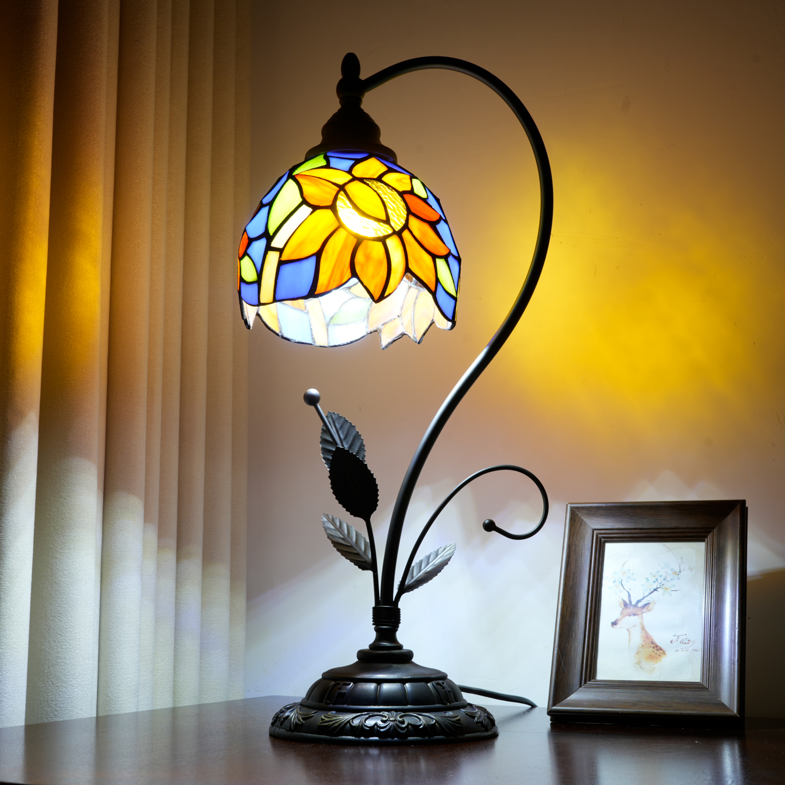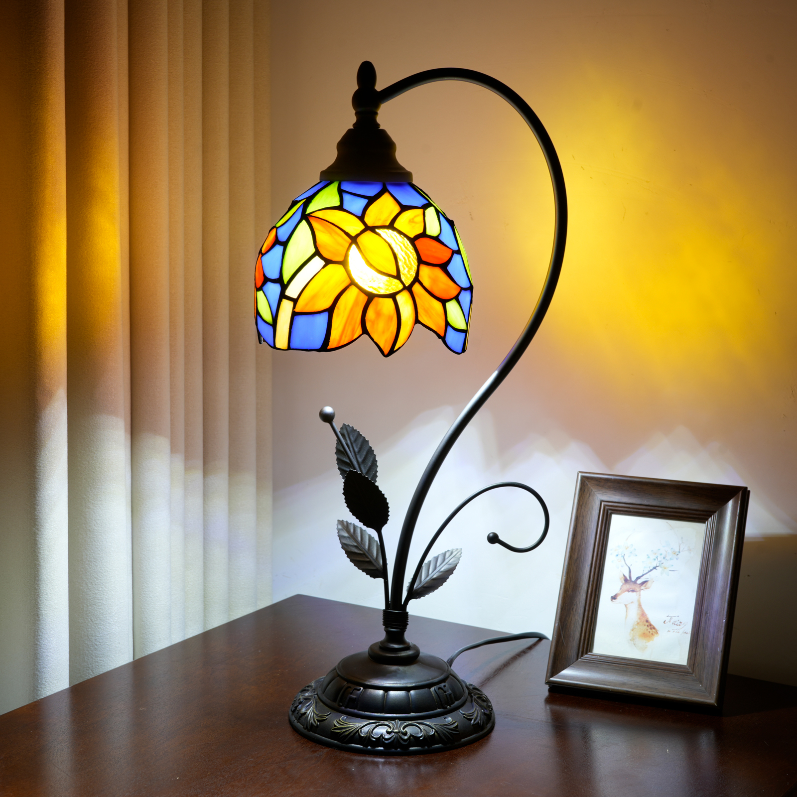It inherits the classic craftsmanship genes of Tiffany, and each one is unique because of its handcrafted production. The 50CM height of the lamp body is paired with a 23CM diameter lampshade, which is just the right size. The 163CM long wire allows for free placement - in the study, it is a gentle and eye-protecting "sunny reading companion". In the bedroom, there is a dreamlike "bouquet of light and shadow". In the corner of the living room, it transforms into an artistic ornament. With the eye-catching design of the blue sunflowers and the retro craftsmanship, it instantly elevates the artistic style of the space.