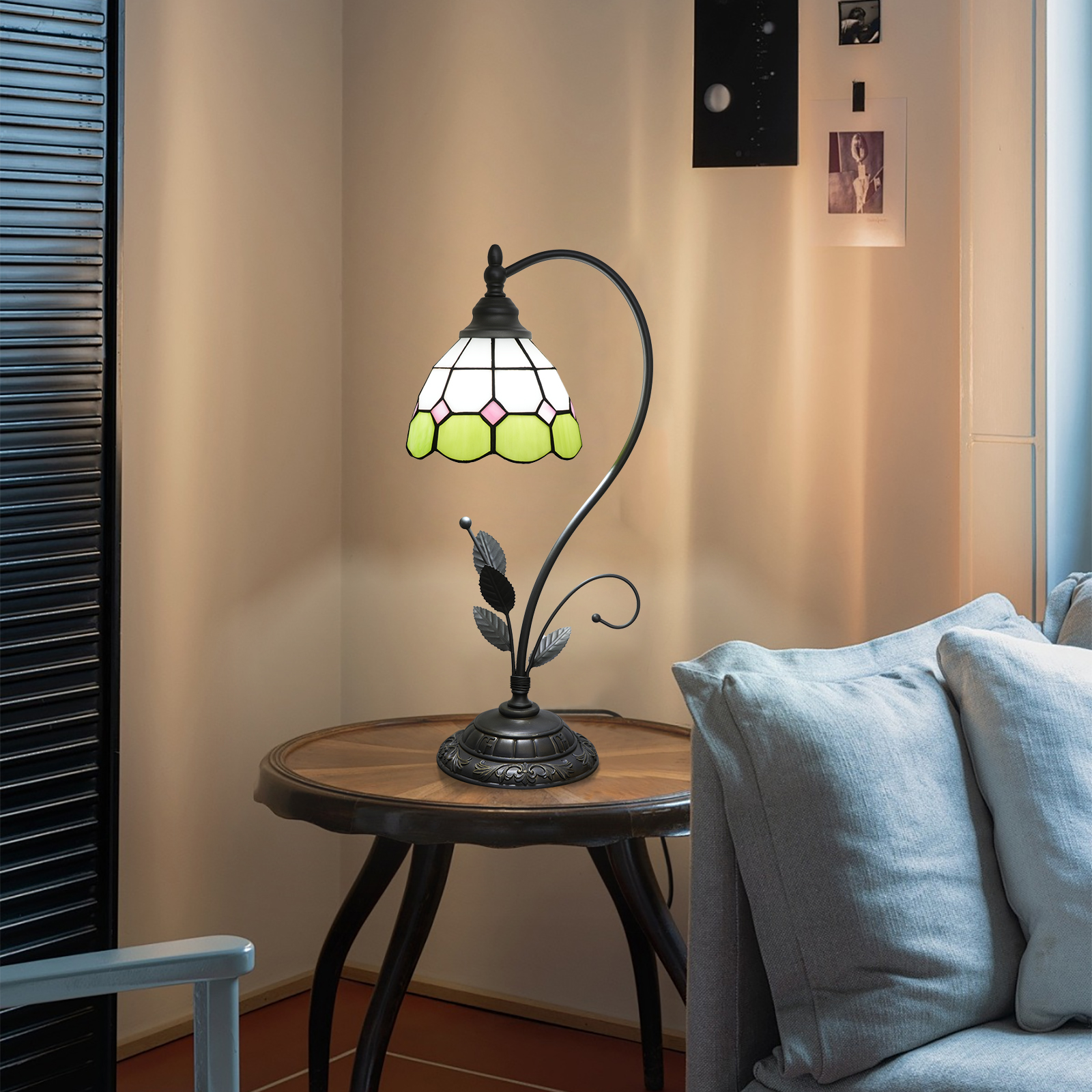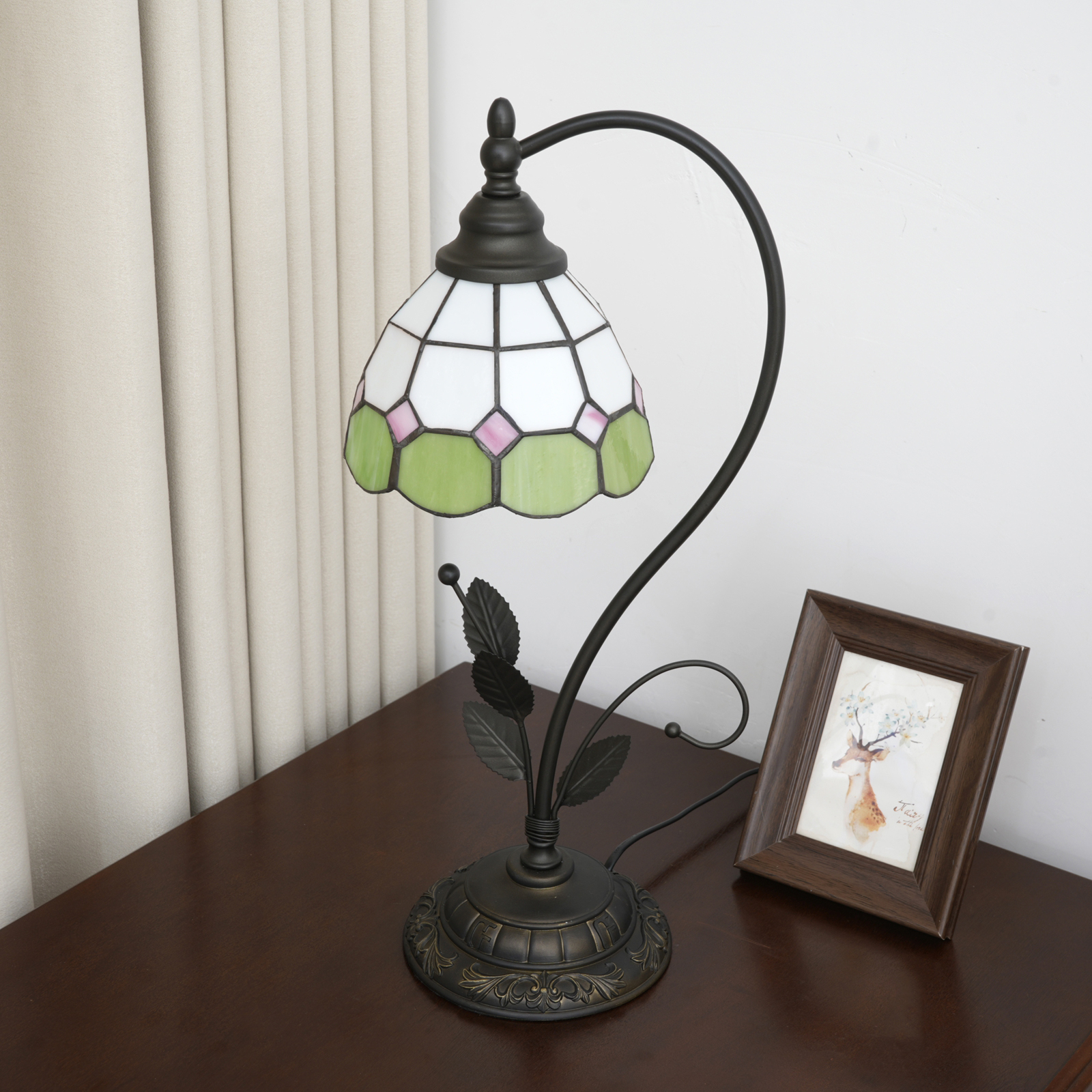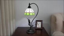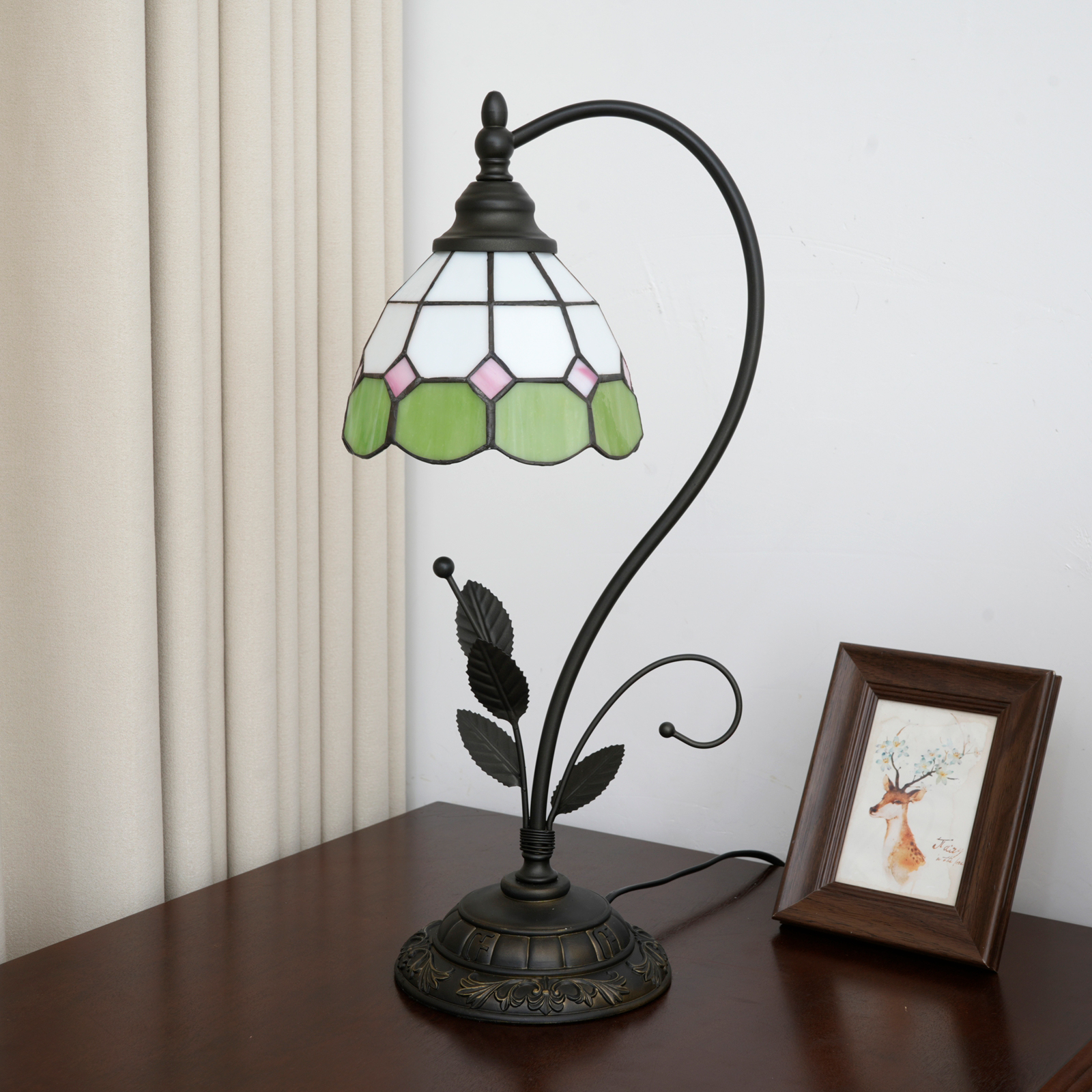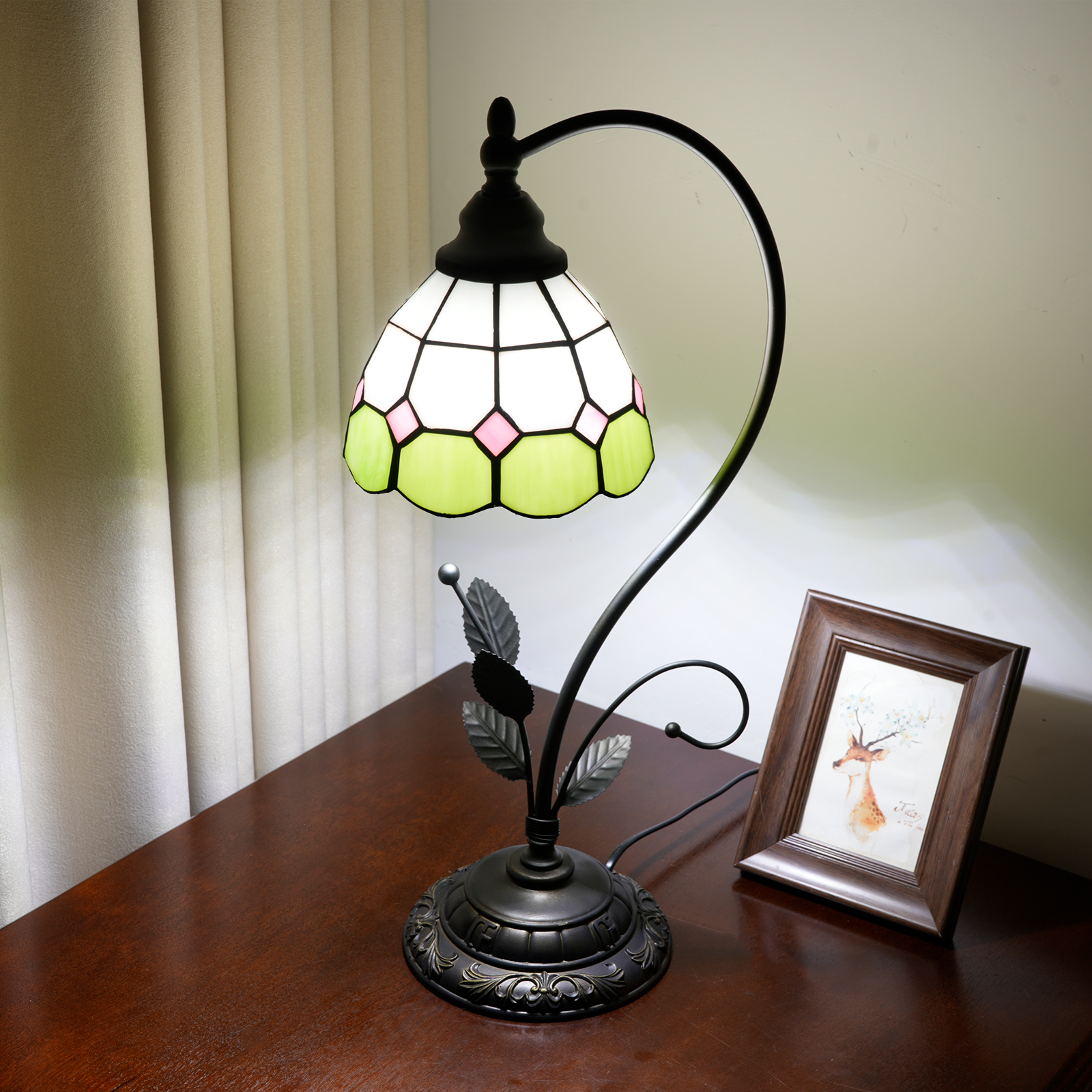 This green and white checkered Tiffany table lamp is a perfect blend of retro craftsmanship and a fresh style. The lampshade is made with handcrafted colored glass splicing technology. The green and white checkered pattern is fresh and elegant, with pink rhombus details dotted among them. Each piece of glass is cut and welded with meticulous care by artisans. When the lights are turned on, warm light filters through the checkered glass, creating a soft and dreamy glow in the space, as if the fresh scent of a spring garden is sealed within.