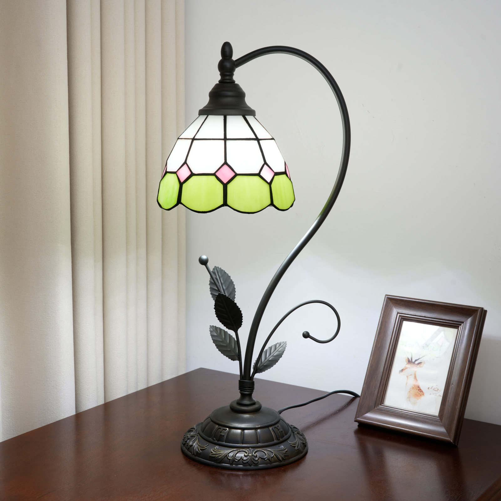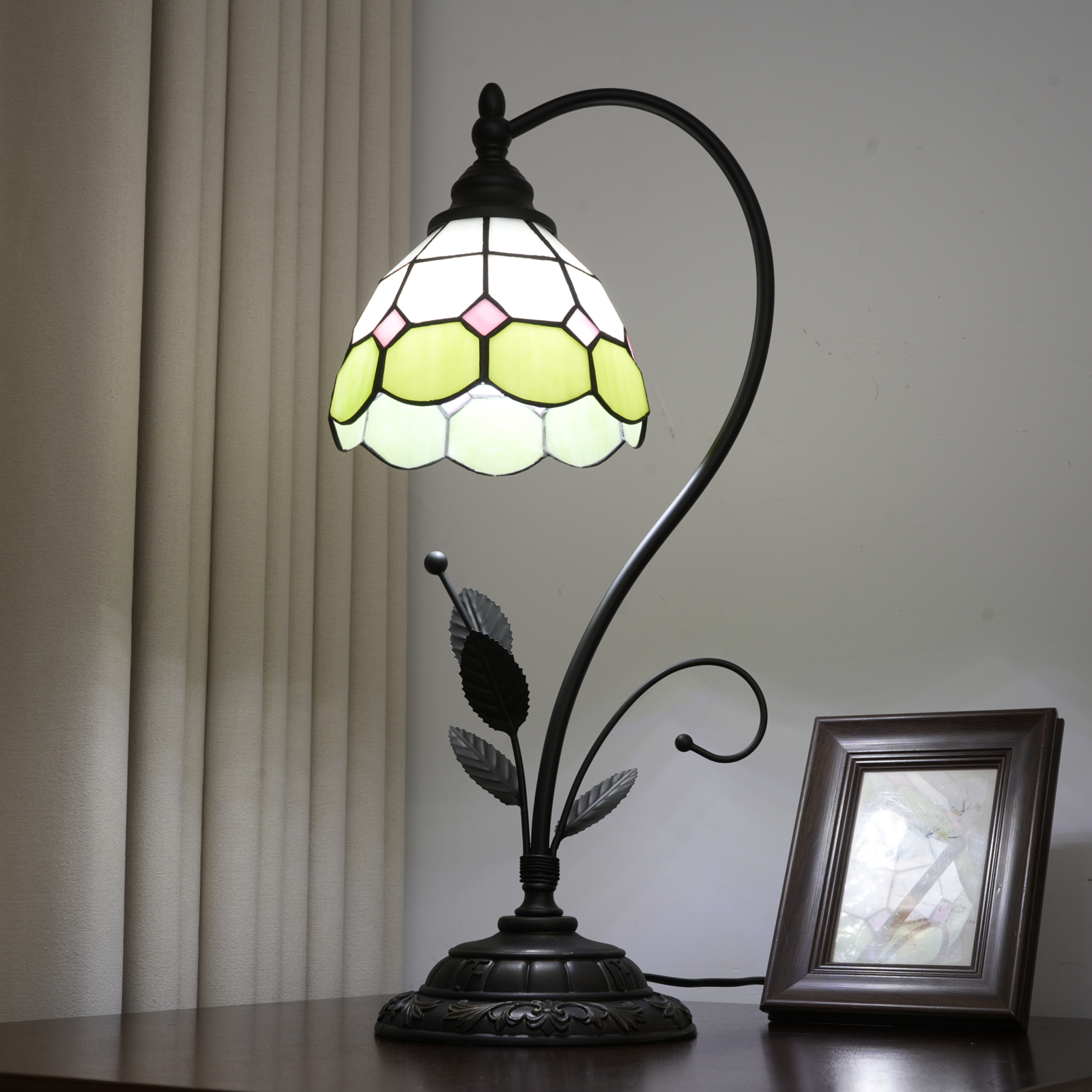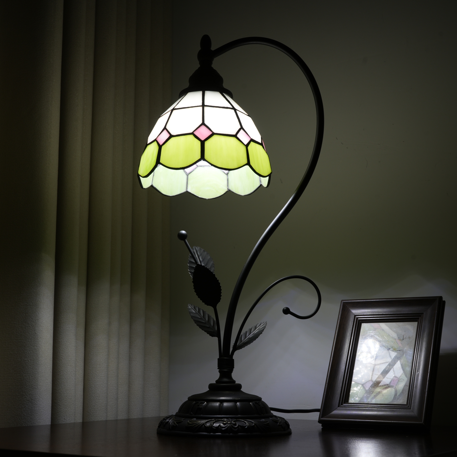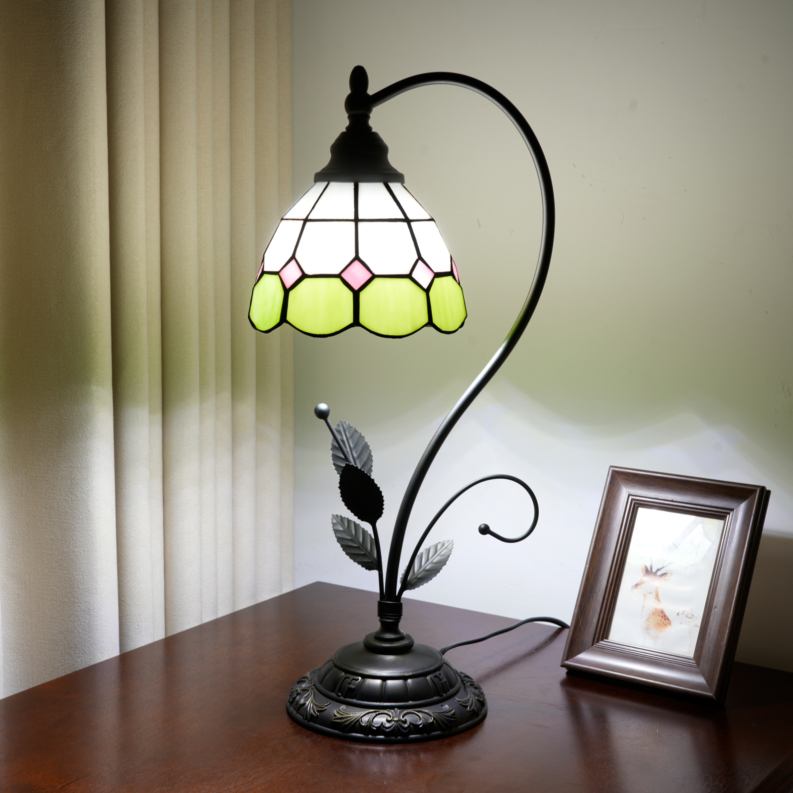This green and white checkered Tiffany table lamp is a perfect blend of retro craftsmanship and a fresh style. The lampshade is made with handcrafted colored glass splicing technology. The green and white checkered pattern is fresh and elegant, with pink rhombus details dotted among them. Each piece of glass is cut and welded with meticulous care by artisans. When the lights are turned on, warm light filters through the checkered glass, creating a soft and dreamy glow in the space, as if the fresh scent of a spring garden is sealed within.