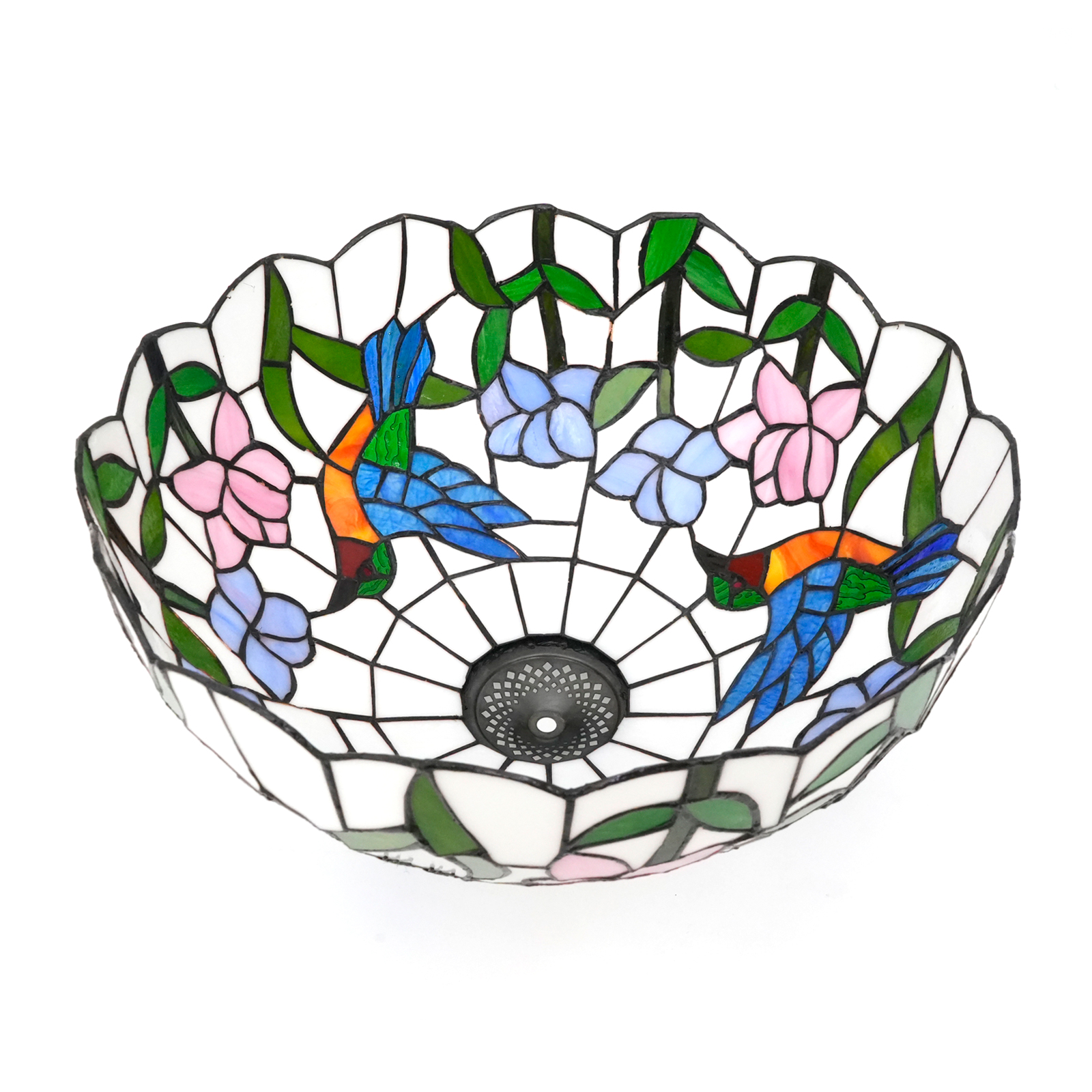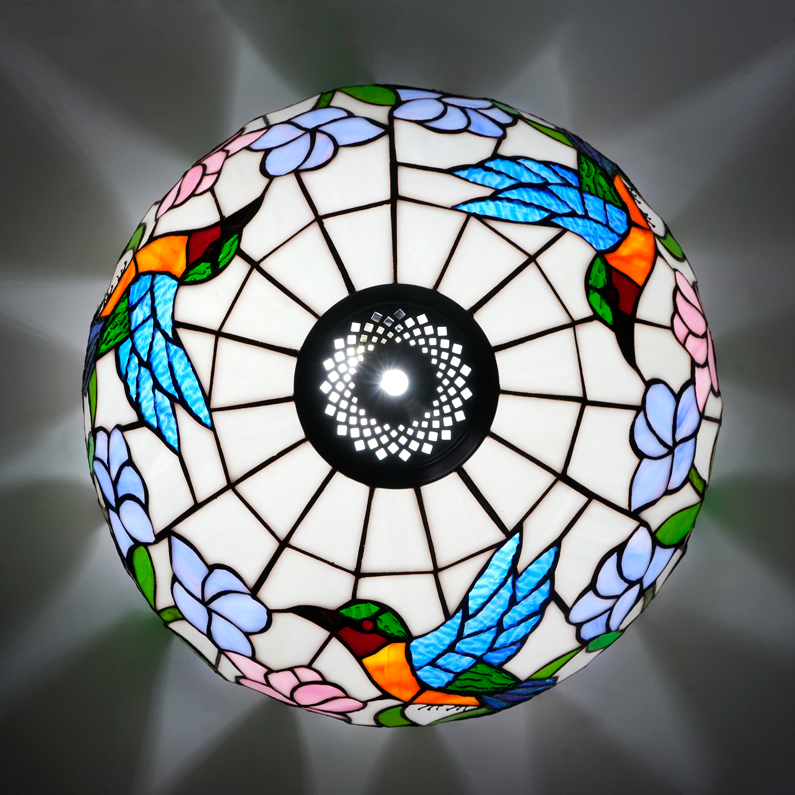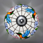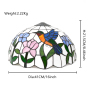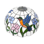 The pattern of the blue hummingbird and the bicolor flower on the lampshade is the core visual highlight. The blue hummingbird is so lifelike that its wings seem to be flapping lightly, and its agile figure is vividly displayed on the lampshade. Its bright feather colors are perfectly presented through the ingenious splicing of colored glass. Blue, green, orange, red and other colors interweave with each other, creating a brilliant spark. The two-color flower pattern features pink and blue flowers paired with emerald green branches and leaves, presenting a fresh and gentle look, as if exuding a faint floral fragrance. When the lights come on, the colored glass filters through the light, creating a dreamlike and illusory effect of light and shadow, ingeniously introducing the vitality and vigor of nature into the interior, filling the entire space with a romantic and warm atmosphere.