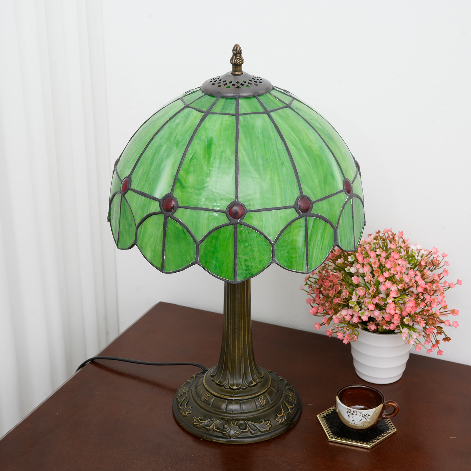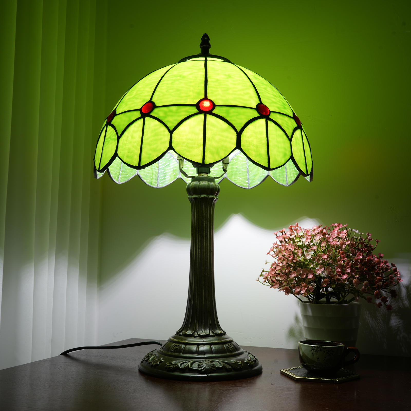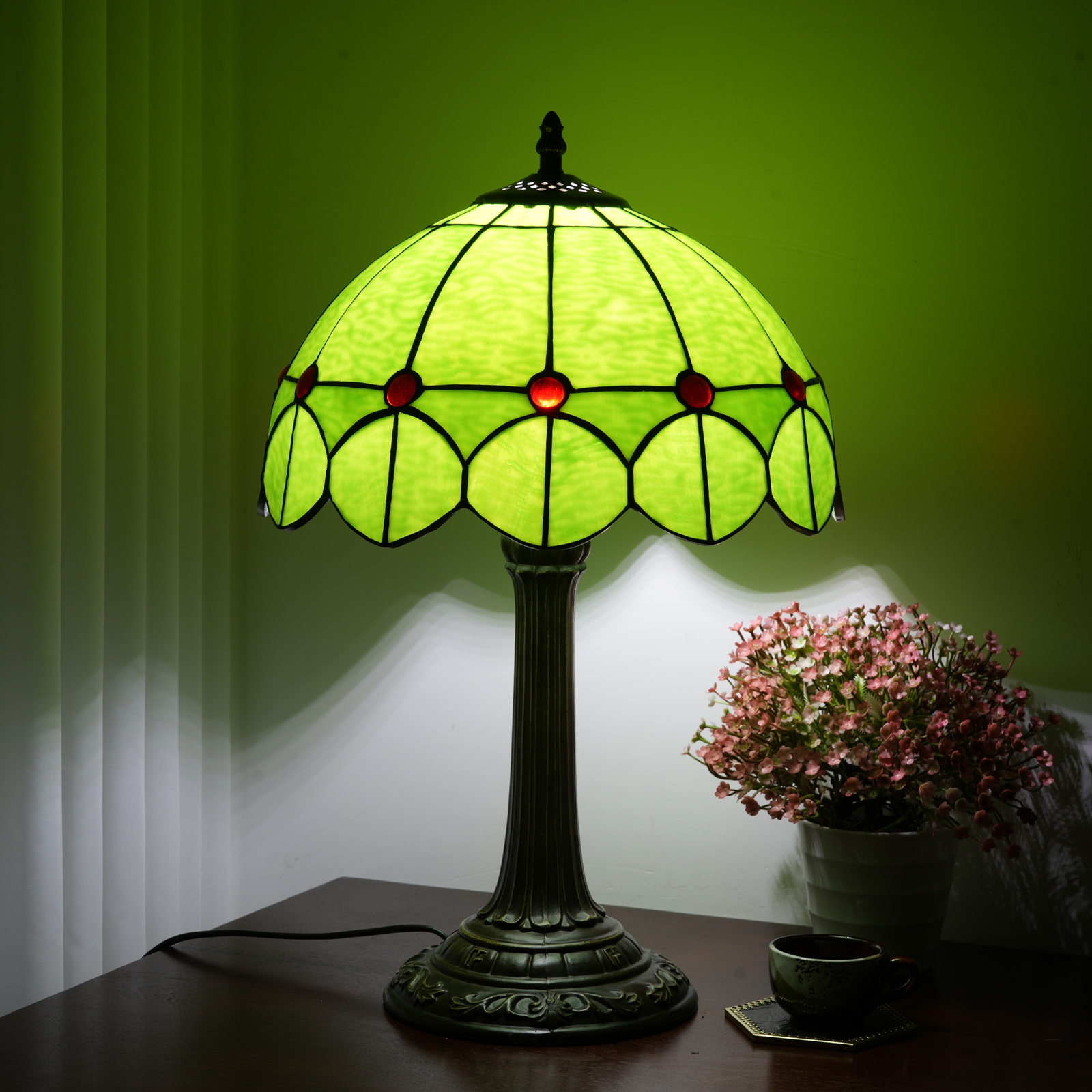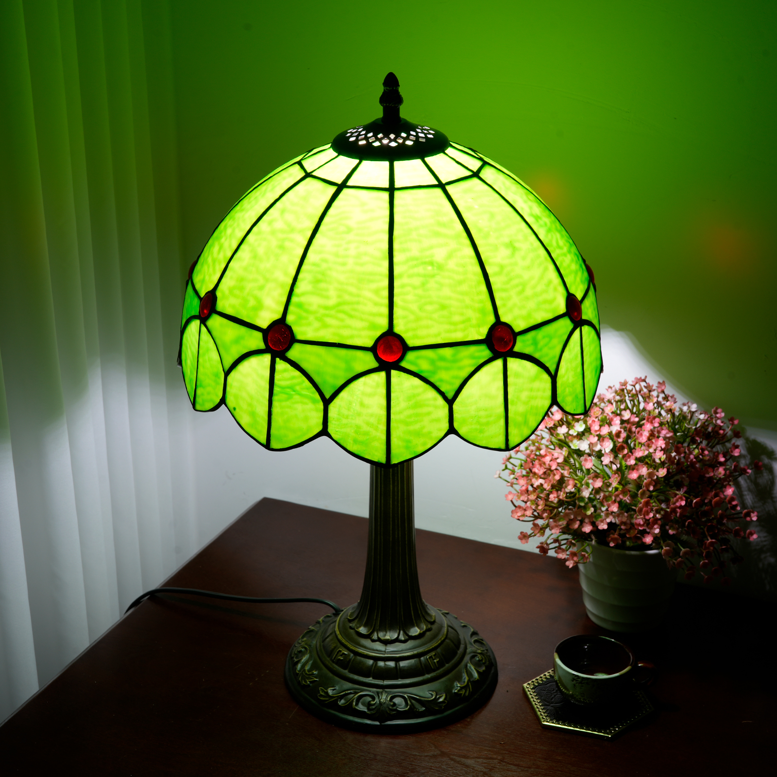 This Tiffany stained glass table lamp, with natural inspiration as its pen, craftsmanship as its ink, ingenious size as its paper, and the charm of light and shadow as its rhyme, writes an artistic chapter of home decoration. Let it enter your life, illuminating every ordinary day with the unique art of green water ripples and red beads, and embarking on a wonderful journey accompanied by artistic home furnishings.