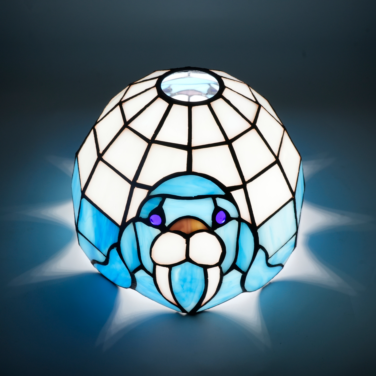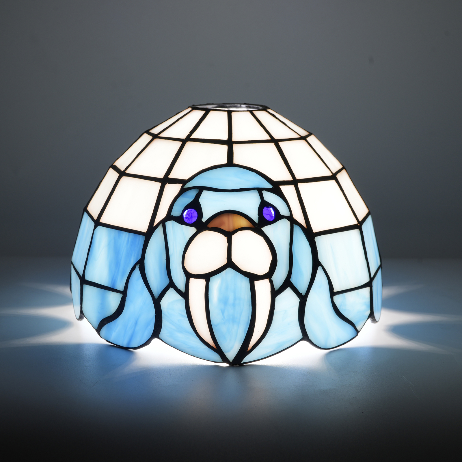 Cute and fun sea lion design: The lampshade takes the image of a sea lion as its core design, and the main body is made of blue and white glass splicing together. The sea lion's endearing face, paired with deep purple glass as its eyes, is vivid and lifelike. The white mouth and nose form a sharp contrast with the blue body, and with the signature long fangs, the image of the sea lion is vividly presented, bringing people a full sense of cuteness and fun.