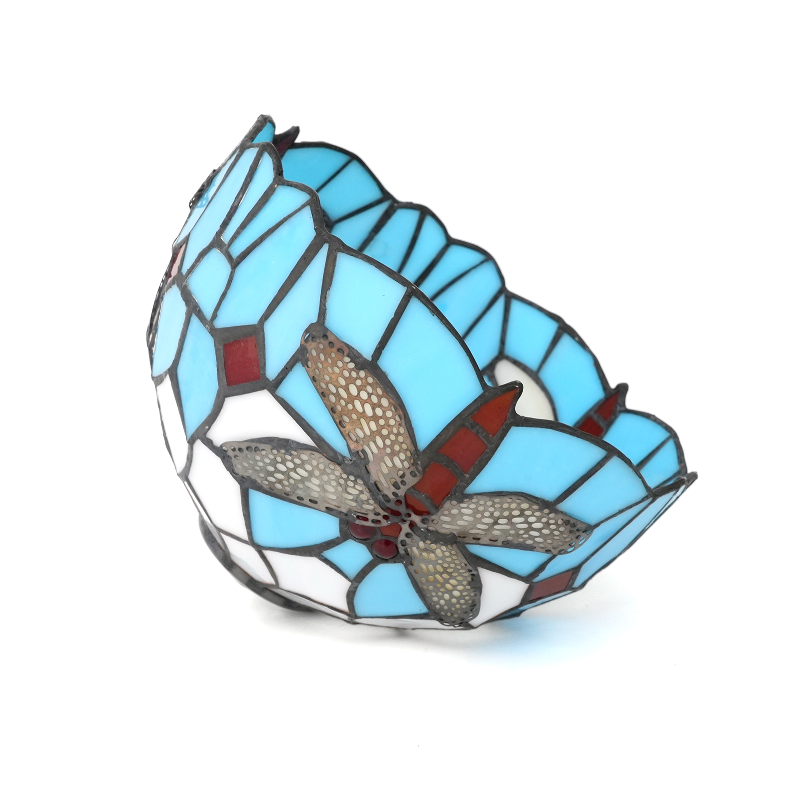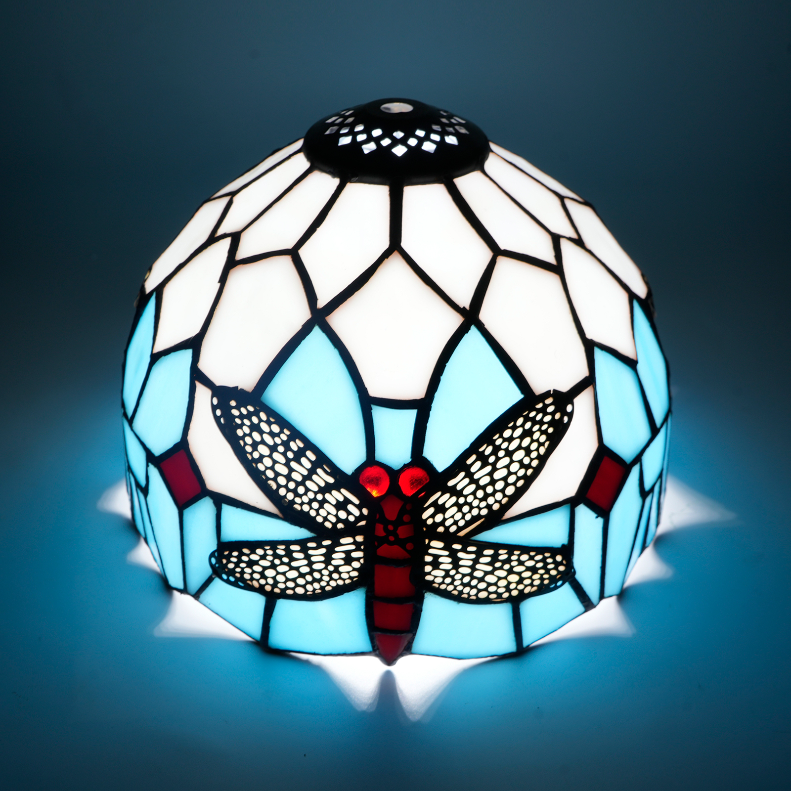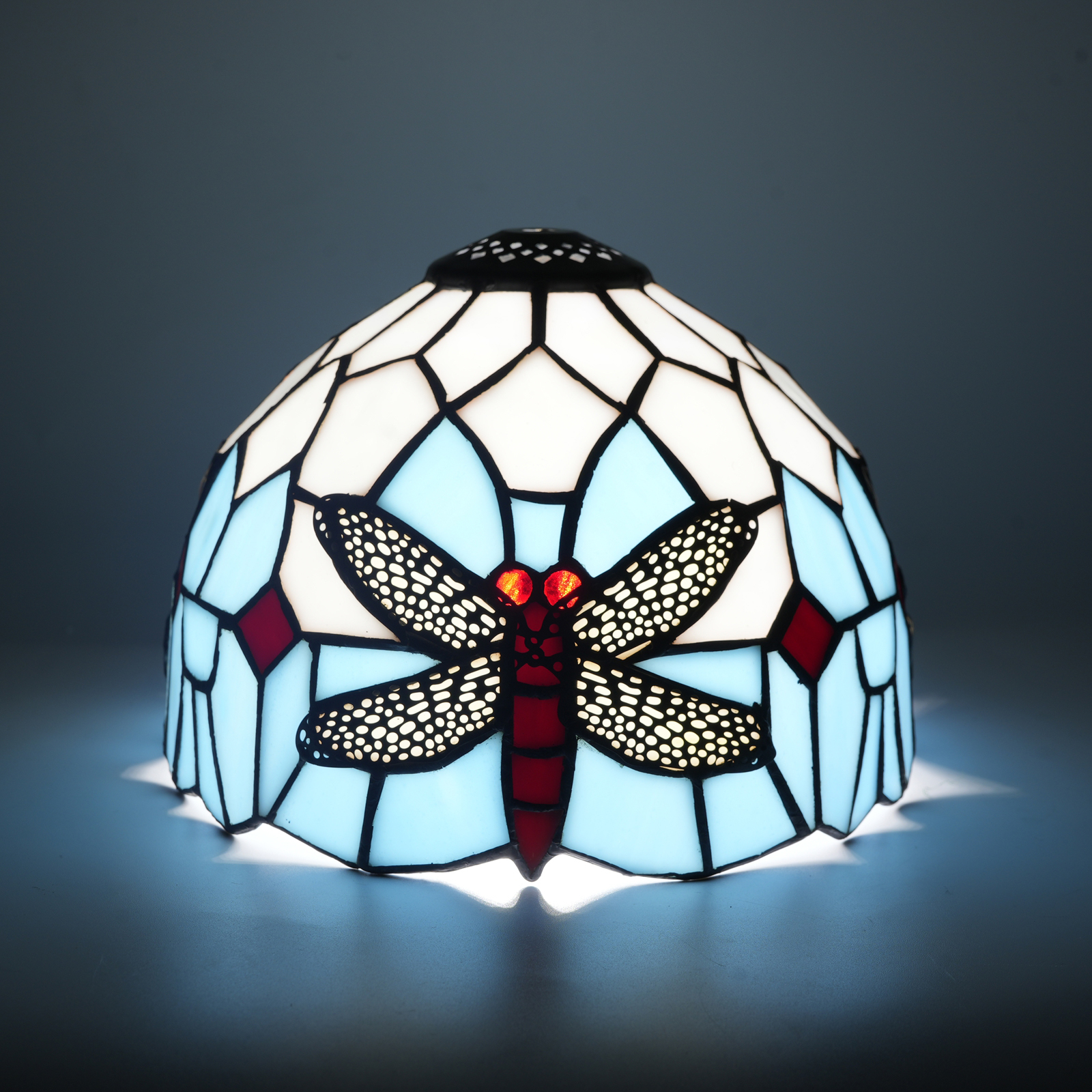 This 8-inch Tiffany lampshade, with blue and white as its main colors, Outlines a fresh and elegant atmosphere. In the center of the lampshade, a lifelike little dragonfly seems to be about to spread its wings and take flight. The main body of the dragonfly is made of reddish-brown glass, complemented by thin and light wings with textures. Every detail showcases meticulous craftsmanship. The blue and white glass blocks on all sides are joined together, resembling a clear sky and drifting white clouds. The occasional small red squares add a touch of liveliness and playfulness, endowing the entire lampshade with a unique vitality.