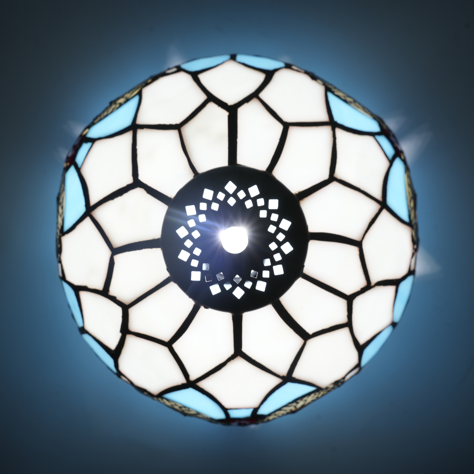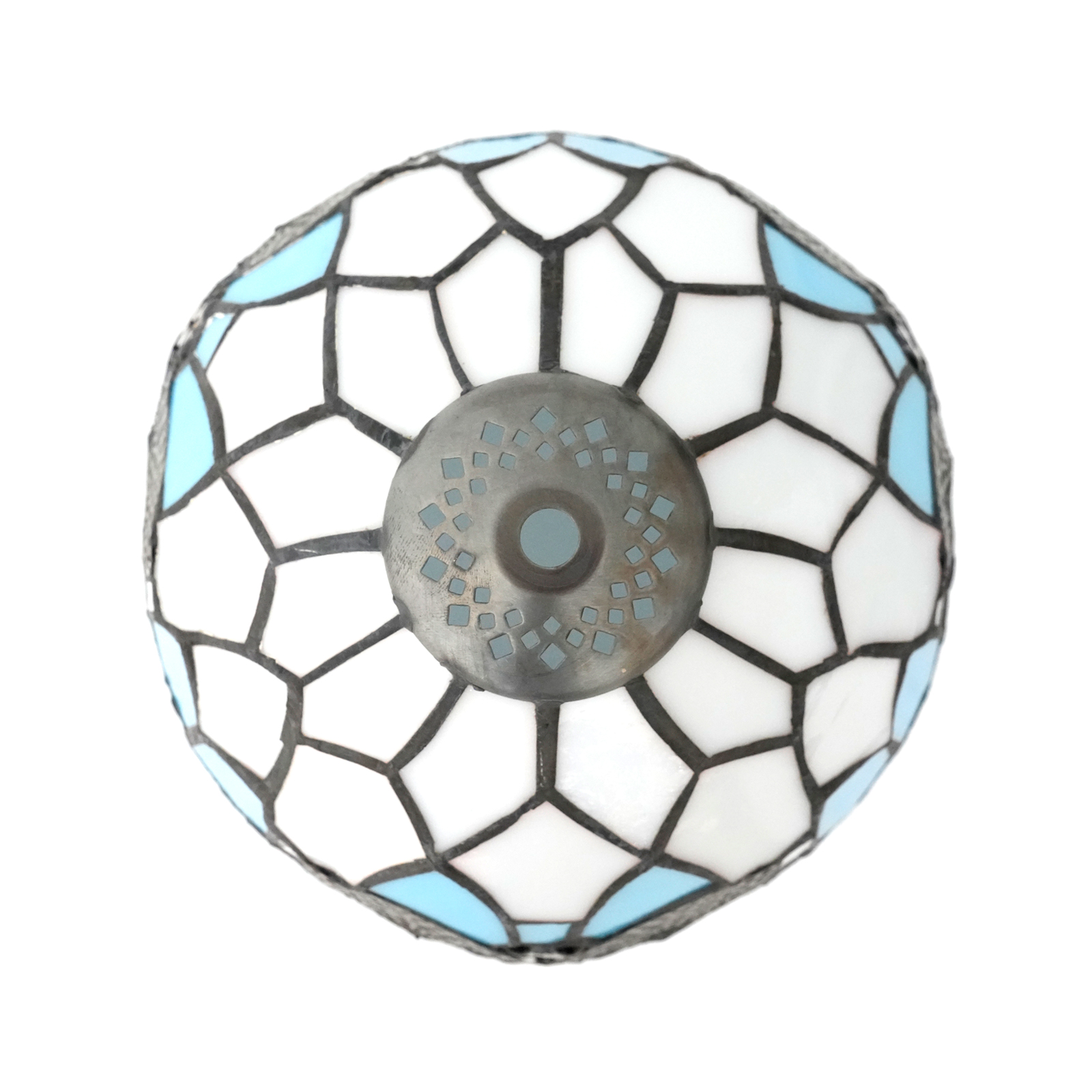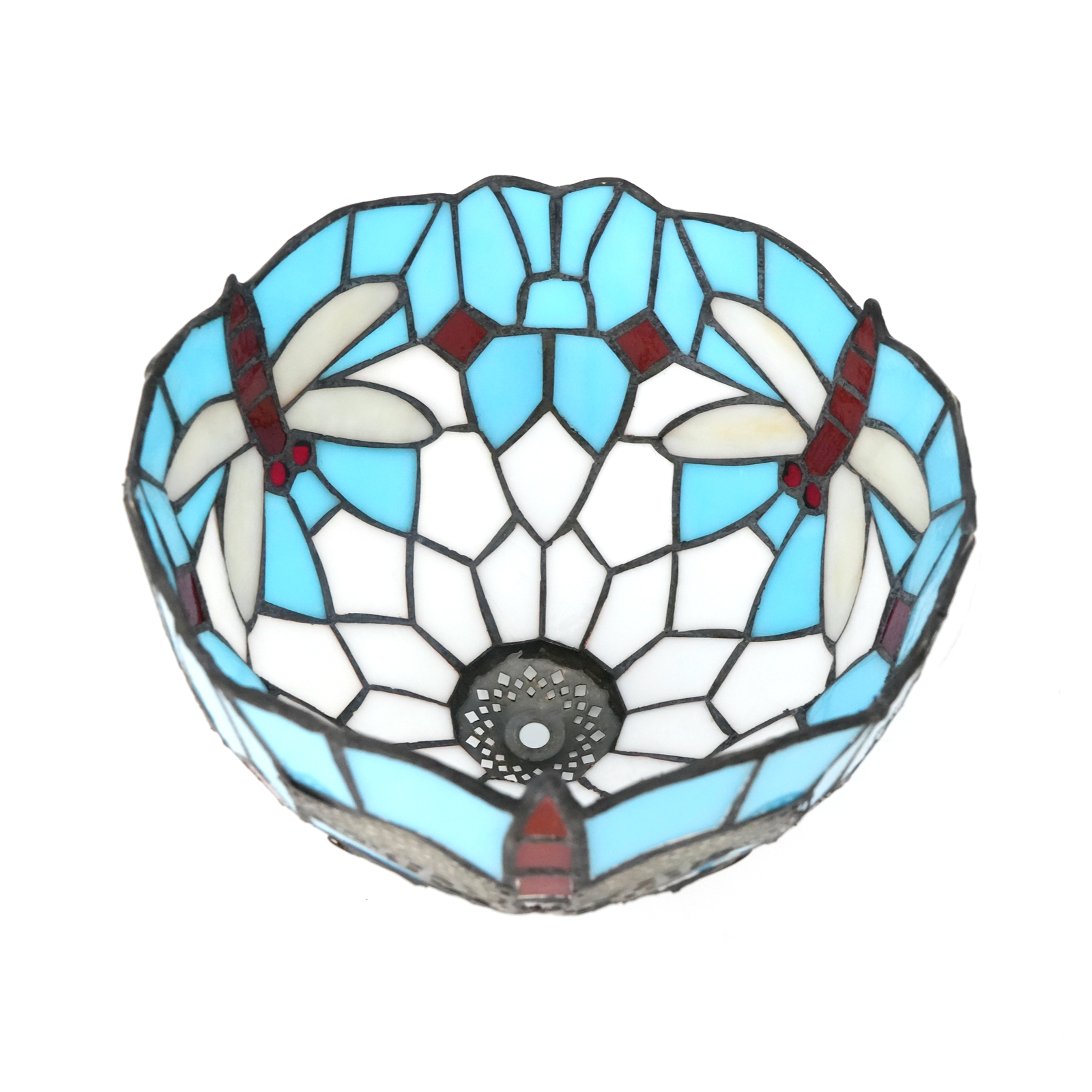This 8-inch Tiffany lampshade, with blue and white as its main colors, Outlines a fresh and elegant atmosphere. In the center of the lampshade, a lifelike little dragonfly seems to be about to spread its wings and take flight. The main body of the dragonfly is made of reddish-brown glass, complemented by thin and light wings with textures. Every detail showcases meticulous craftsmanship. The blue and white glass blocks on all sides are joined together, resembling a clear sky and drifting white clouds. The occasional small red squares add a touch of liveliness and playfulness, endowing the entire lampshade with a unique vitality.