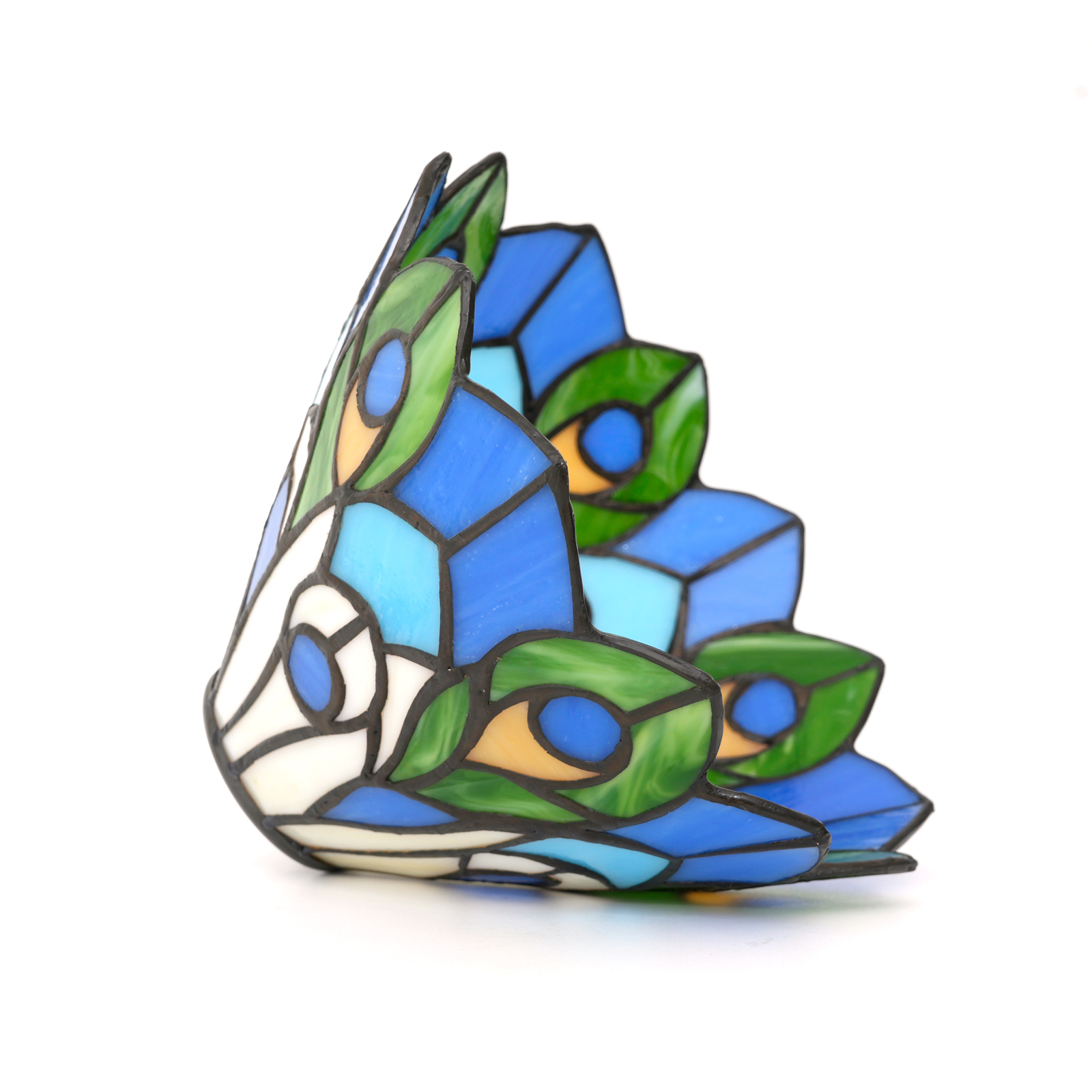 Inheriting the classic craftsmanship of Tiffany, the artisans create the polka dot peacock tail lamp cover with their delicate hands. Cut the colored glass to precisely present the blue, green, gold and other colors of the peacock's tail feathers. Each piece of glass is wrapped in copper foil and welded to replicate the dynamic texture of the tail feathers. The handcrafted design endows the pattern with warmth, allowing the magnificence of the peacock tail to be reborn on the lampshade. The small hole design is hidden within, laying a romantic foreshadowing for the light and shadow, fully showcasing the retro charm of Victoria.