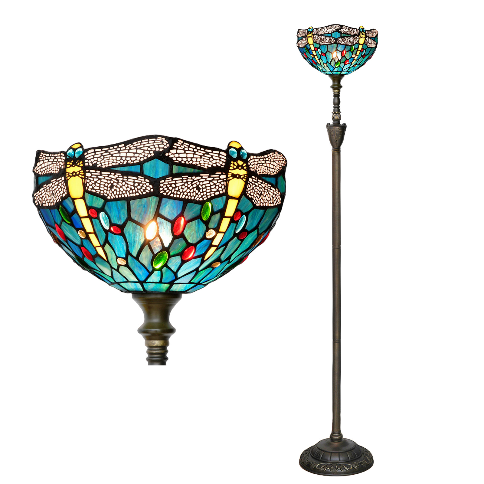Blivuself Tiffany Floor Lamp European Retro Pastoral Style 12-Inch Blue-Green Dragonfly Hand-Made Colored Glass Lampshade, Upright Pole Type Upward Floor Lamp, Indoor Lighting Dragonfly Style Home Decoration Suitable For Bedroom Living Room Office Study, 12-Inch Blue-Green Dragonfly -Of Upward Floor Lamp OFXS009