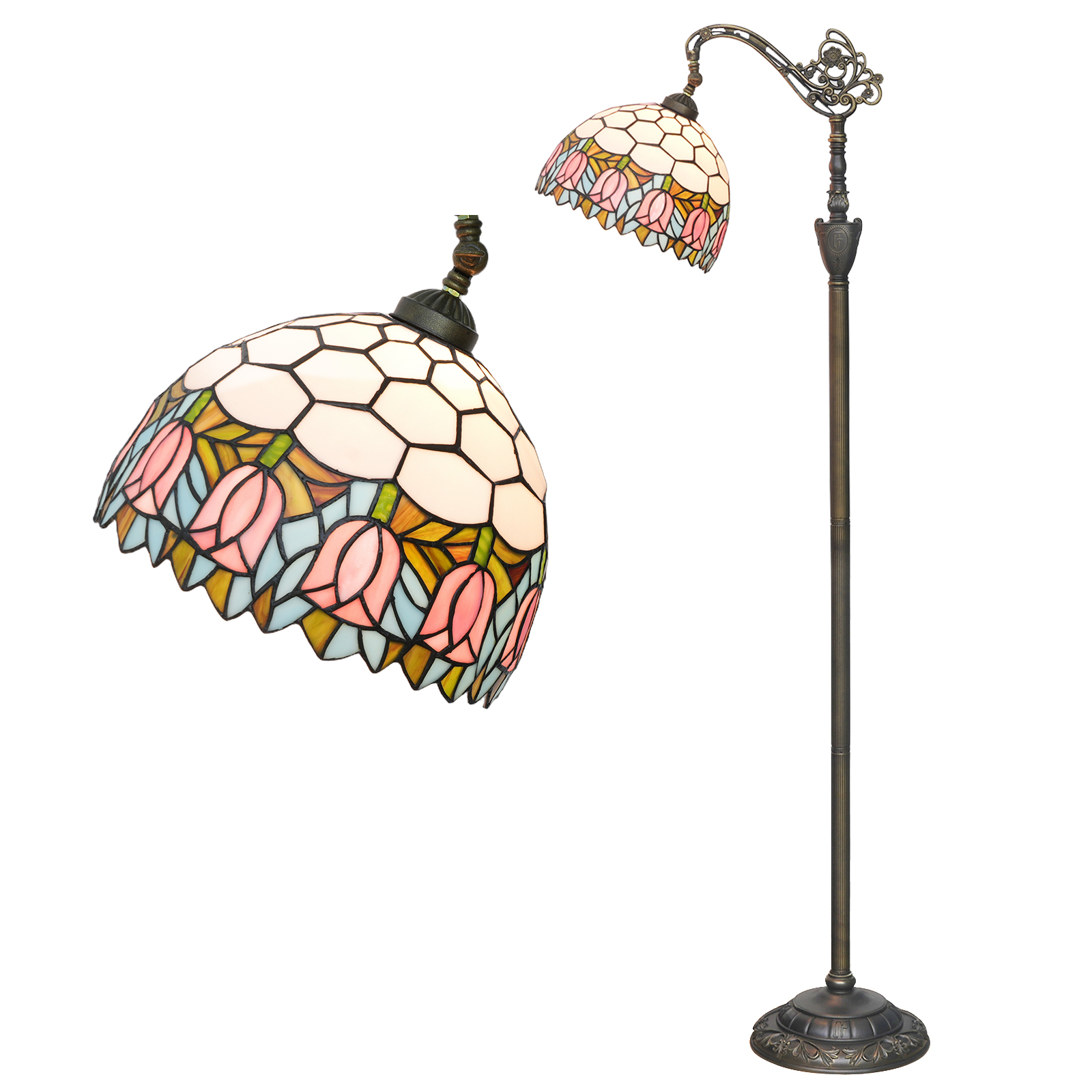Blivuself Tiffany Floor Lamp Victorian Style 12-Inch Pink Tulip Floor Lamp Indoor Lighting Soft Arch Swannneck Adjustable Angle Reading Lamp Warm Romantic Home Decoration, Hand-Made Stained Glass Lamp Shade Suitable For Bedroom Living Room Office Study, 12-Inch Pink Tulip-Of Downward Facing Floor Lamp OFX018