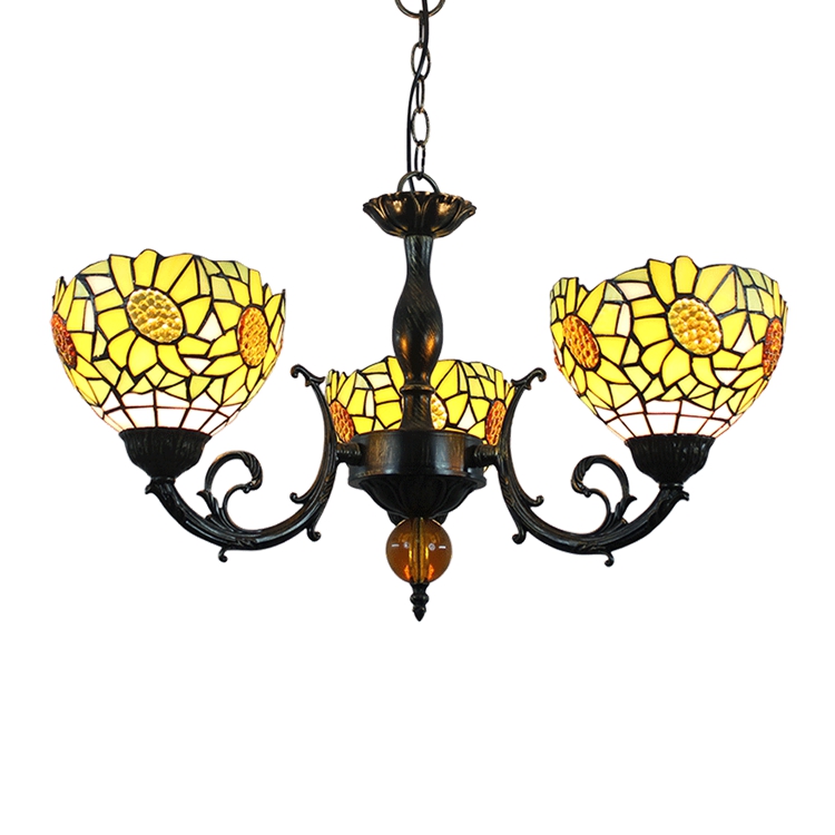 Blivuself Tiffany Chandelier Yellow Sunflowers Stained Glass Chandelier 8 inch Small Lampshade Vintage Art Decor 3 Heads Chandelier for Living Room Bedroom Restaurant Hotel