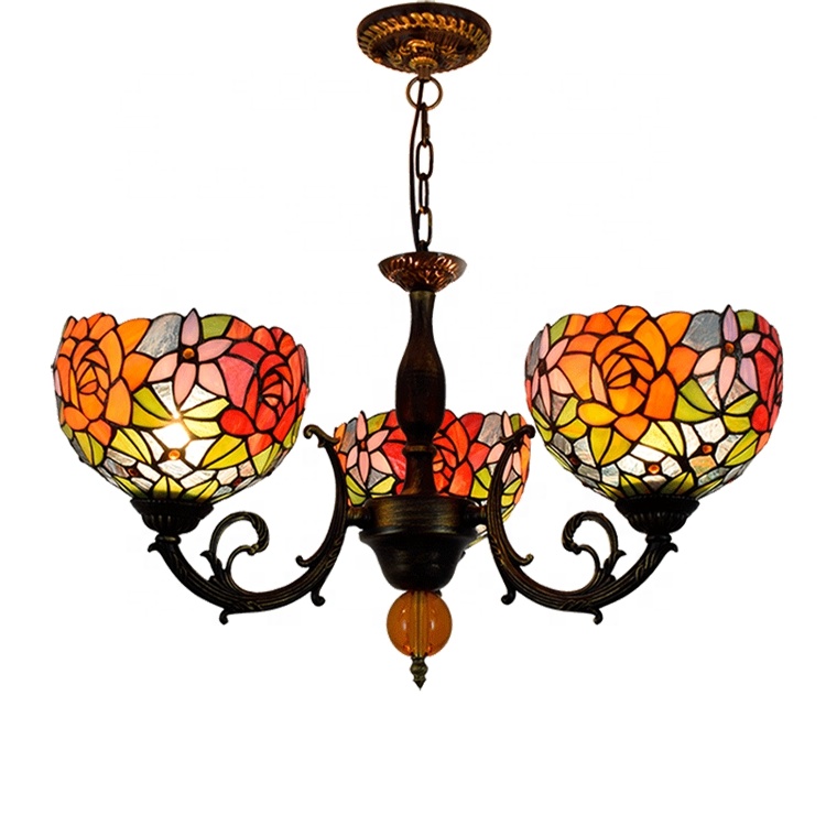 Blivuself Tiffany Chandelier Gorgeous Roses Stained Glass Chandelier 8 inch Small Lampshade Vintage Art Decor 3 Heads Chandelier for Living Room Bedroom Restaurant Hotel