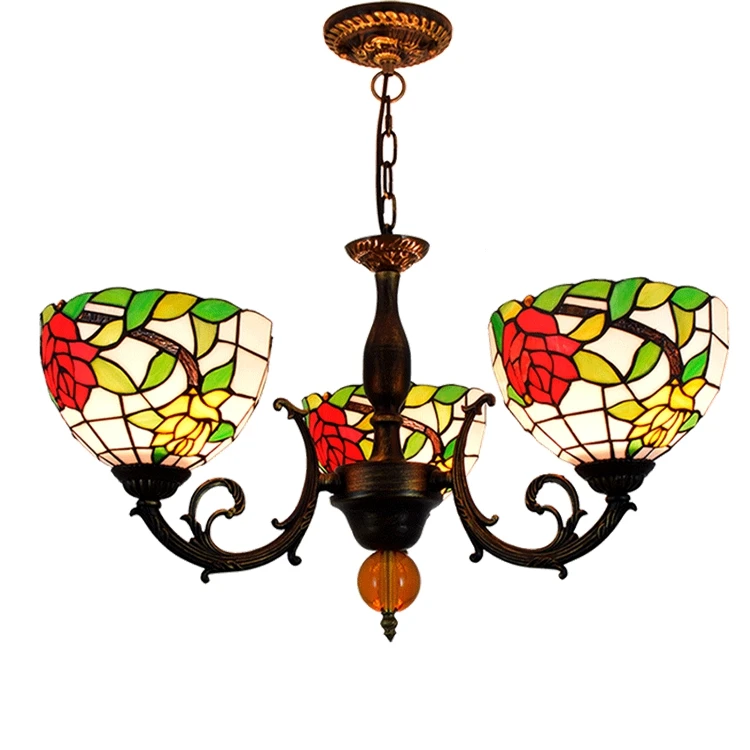 Blivuself Tiffany Chandelier Two-color roses Stained Glass Chandelier 8 inch Small Lampshade Vintage Art Decor 3 Heads Chandelier for Living Room Bedroom Restaurant Hotel