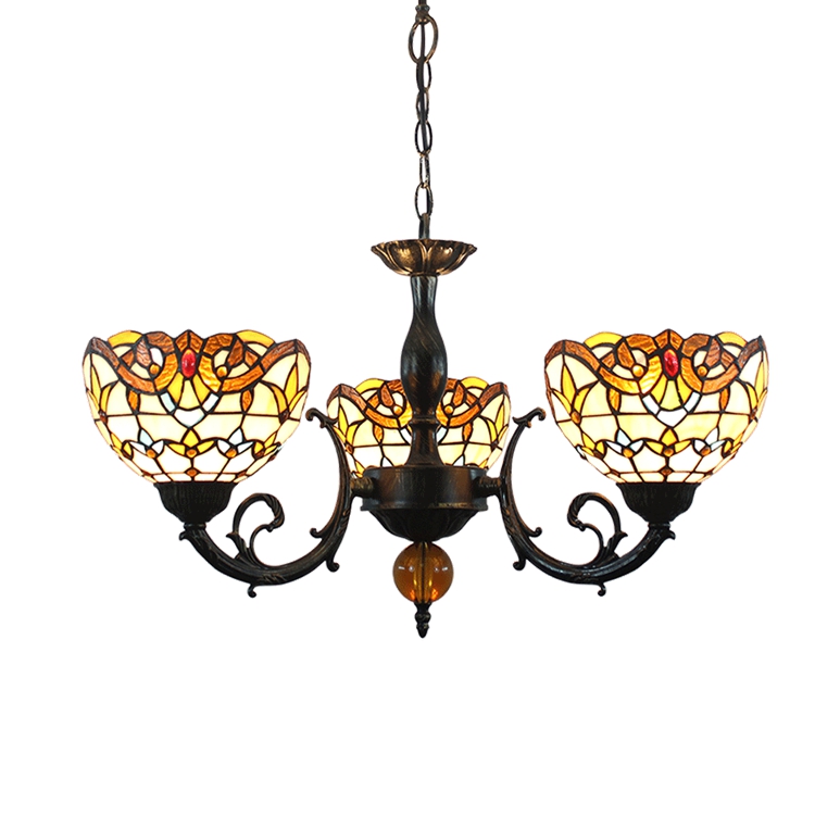 Blivuself Tiffany Chandelier Yellow Baroque Stained Glass Chandelier 8 inch Small Lampshade Vintage Art Decor 3 Heads Chandelier for Living Room Bedroom Restaurant Hotel