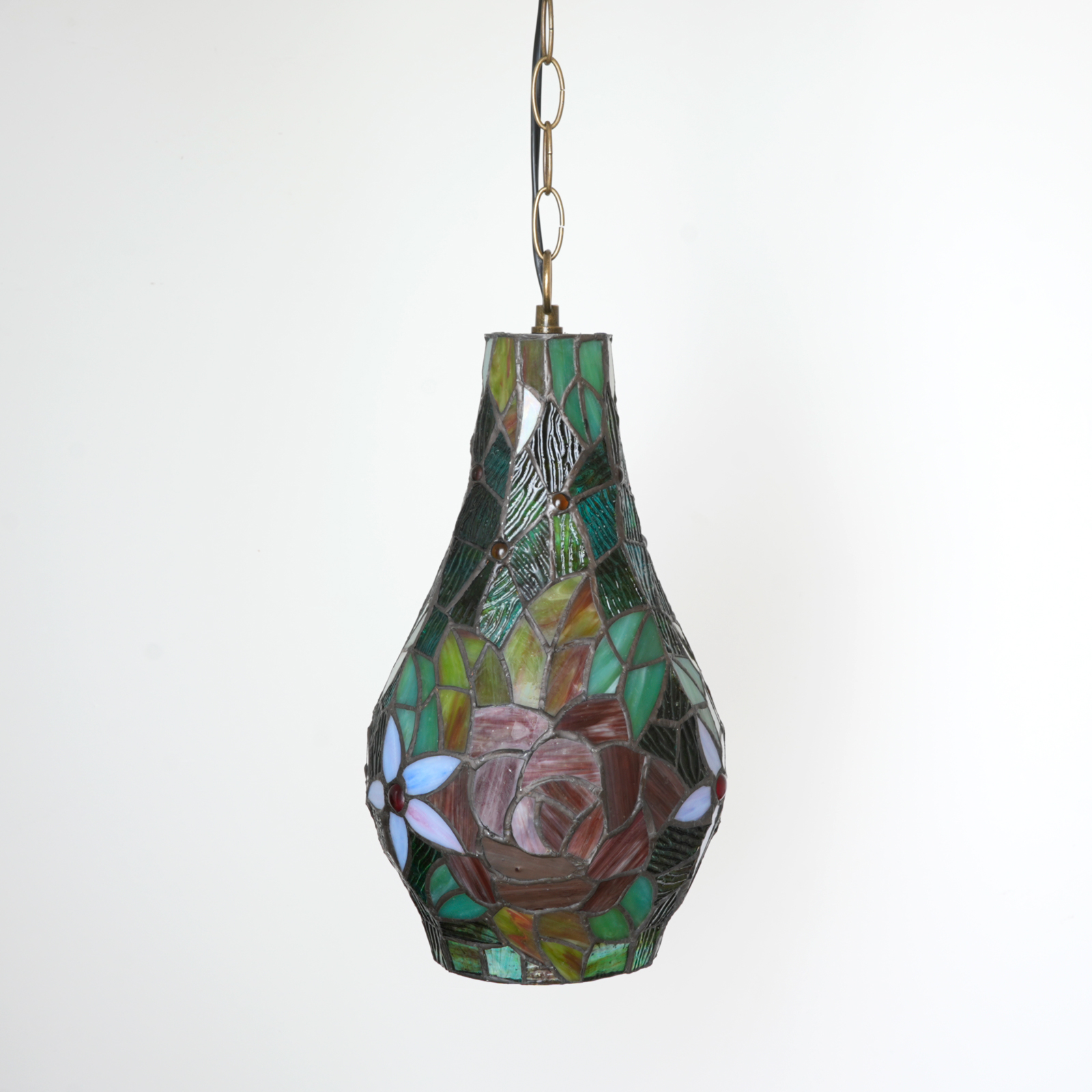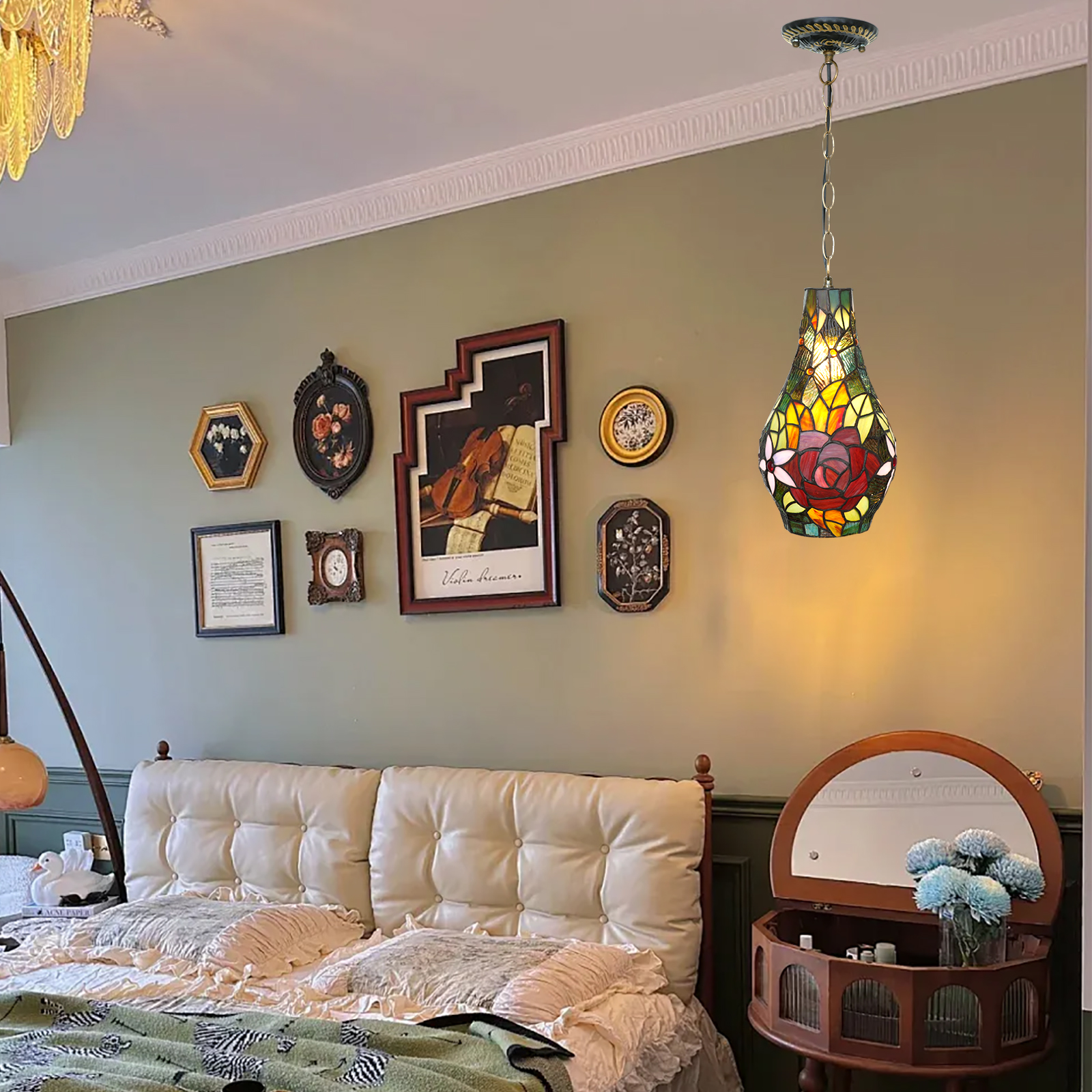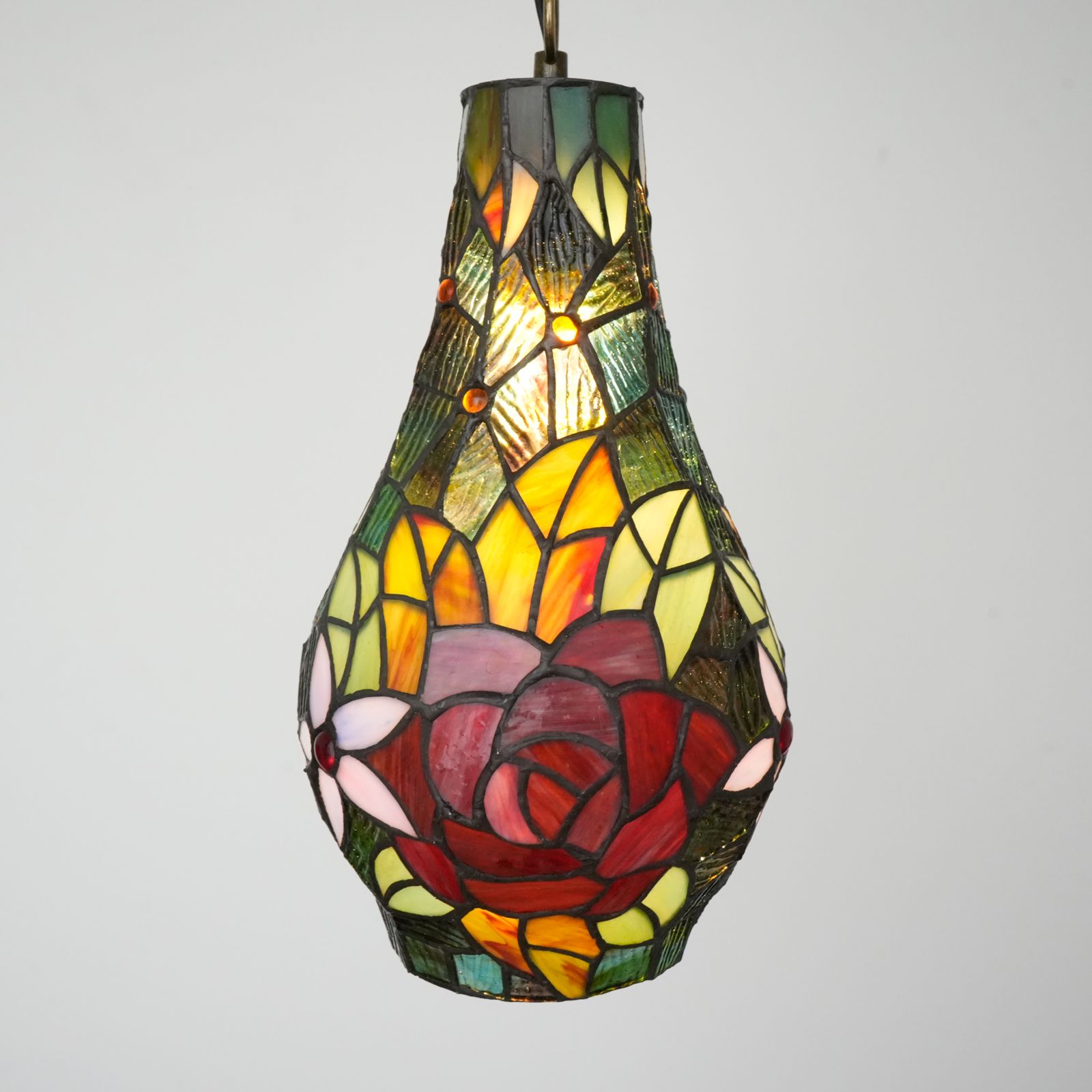 This Tiffany style chandelier is a masterpiece that perfectly blends art and practicality. The lampshade is made of colored glass, which is carefully cut and spliced by artisans to outline a beautiful pattern of blooming roses. The color combination is extremely exquisite. The passionate red, bright yellow, fresh green and other colors interweave with each other, with natural transitions and rich layers. Every piece of glass seems to be endowed with life, presenting the beauty and vitality of the rose to the fullest.