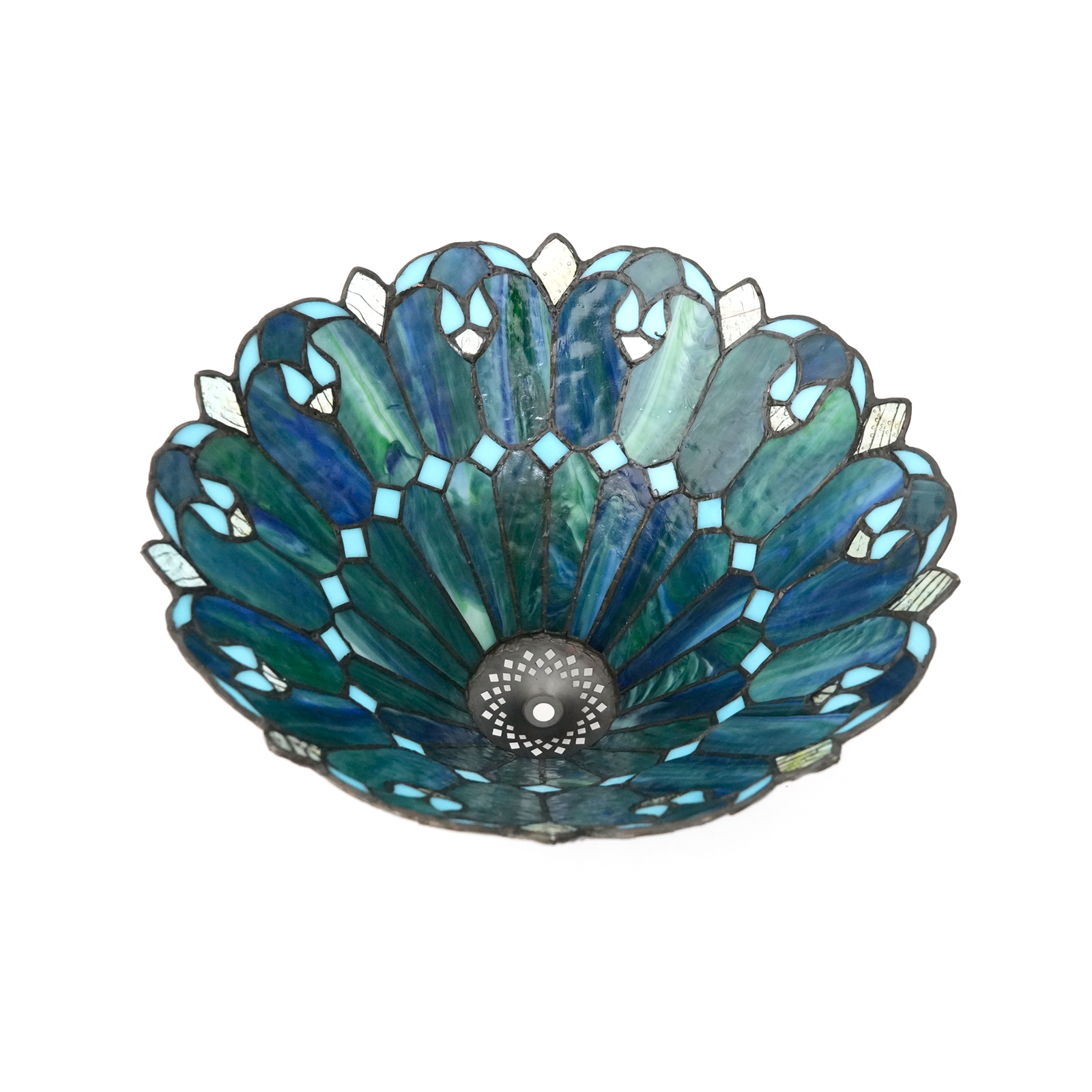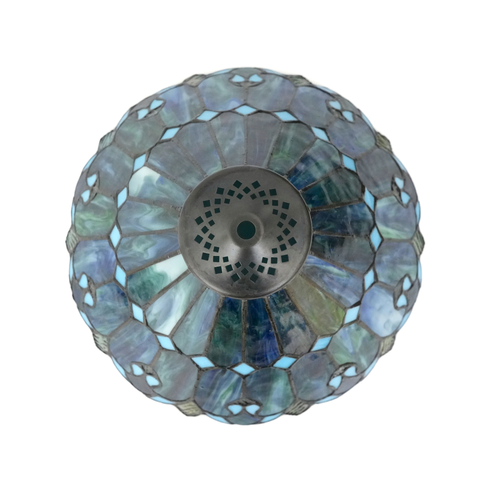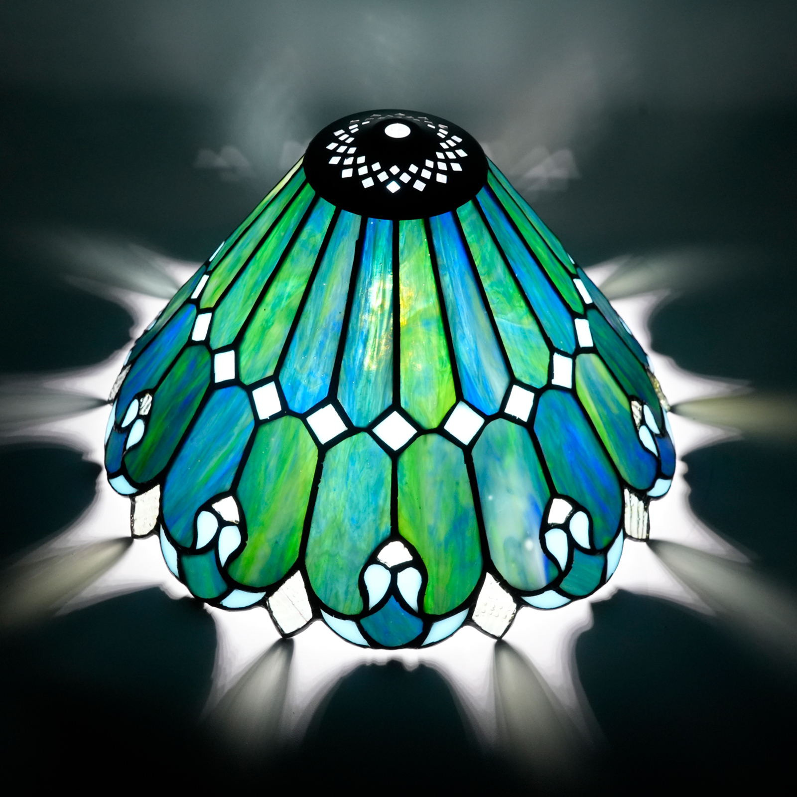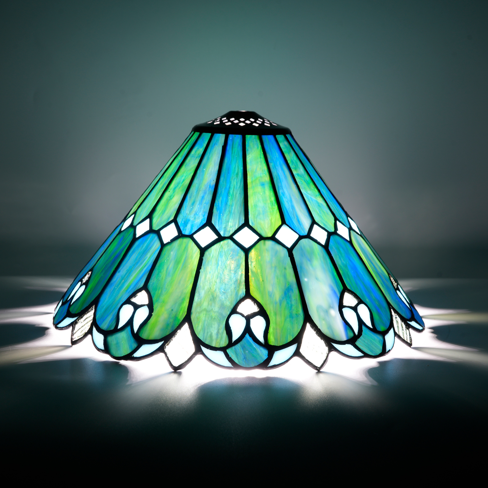 This 12-inch (30CM in diameter) Tiffany style colored glass lampshade stands out with its unique umbrella design. Standing at 17CM in height and weighing 0.95Kg, it is suitable for small-hole lamps. The lampshade adopts the classic Tiffany stained glass craftsmanship. Each piece of glass is carefully selected and cut, and then assembled and welded by hand.