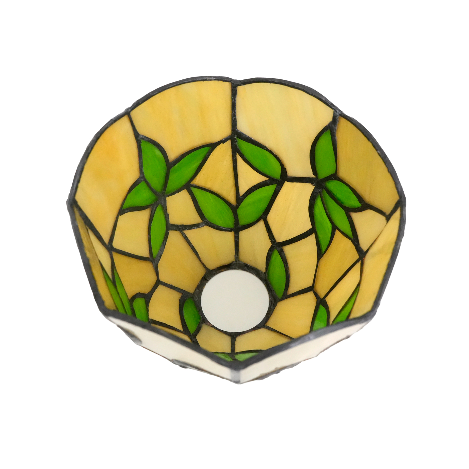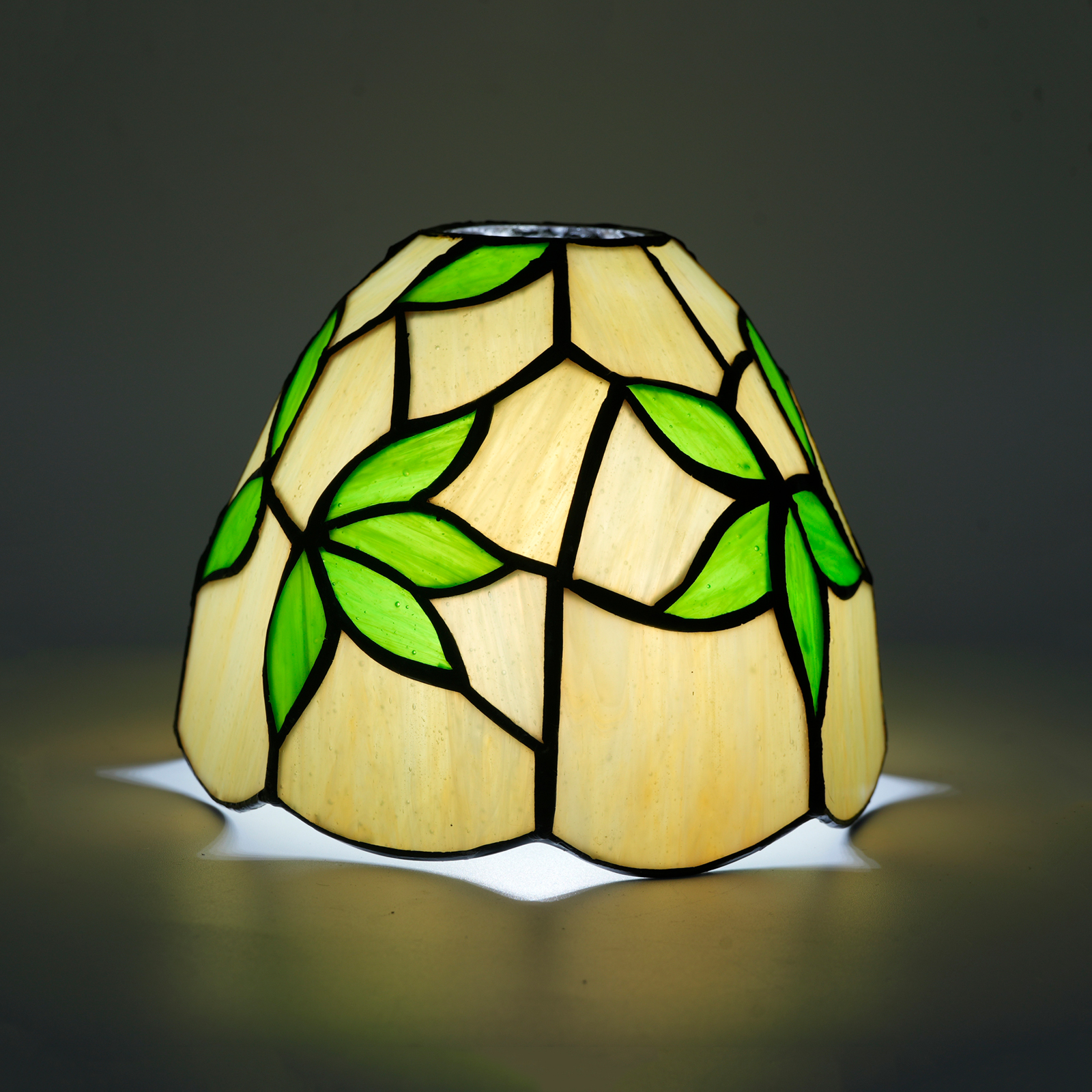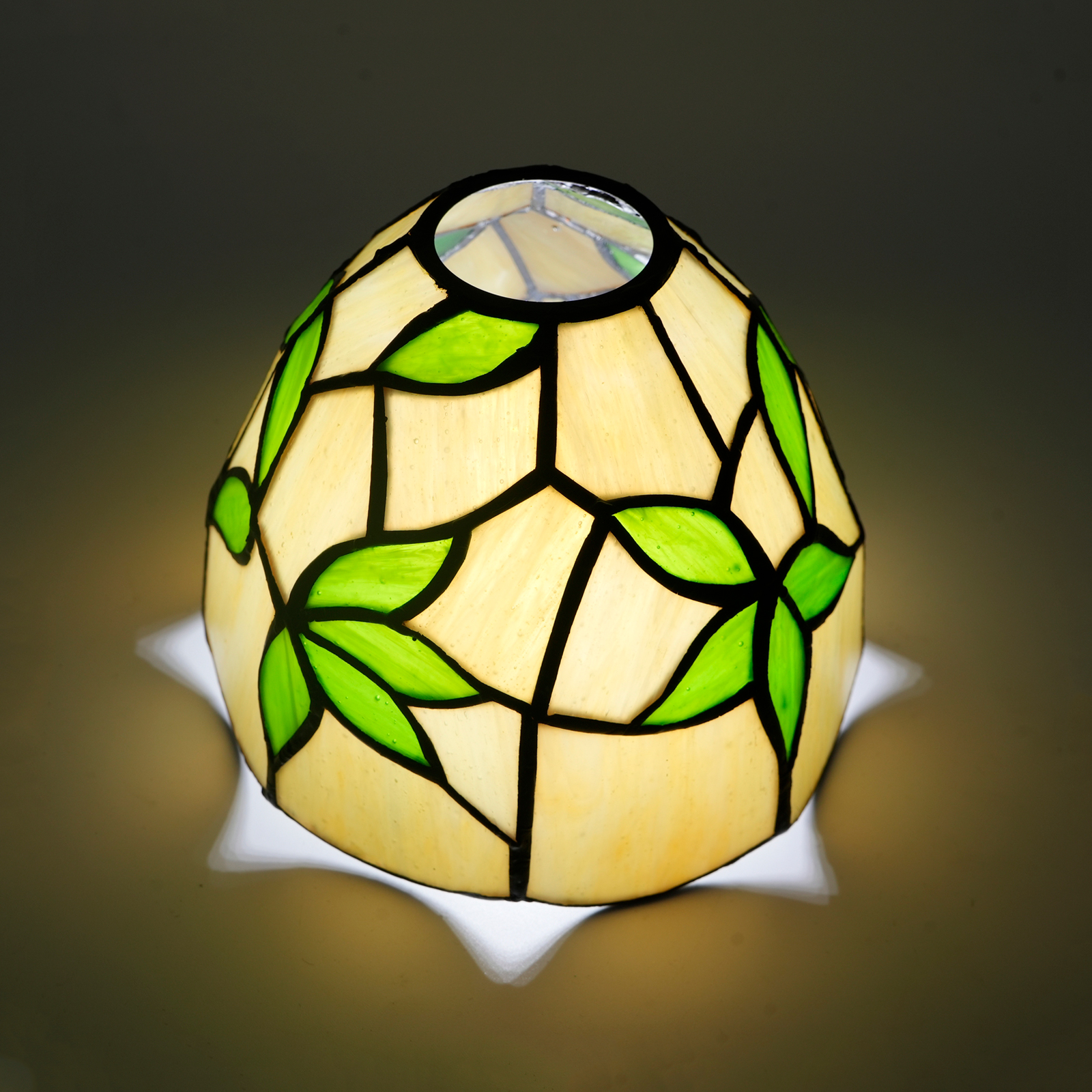 The lampshade has a diameter of 15CM (6 inches), a height of 12CM, and weighs 0.41Kg. It has a 4.2CM opening at the top and is suitable for large-hole lamps. Inheriting the classic Tiffany craftsmanship, the artisans hand-cut and spliced the colored glass. The warm beige glass serves as the base, and the green glass with alternating shades transforms into bamboo leaves. The veins of the leaves are clear and distinct, as if a gentle breeze rustling through the bamboo leaves. Every splicing conceals the artisans' dedication, making the lampshade a touchable miniature of natural art.