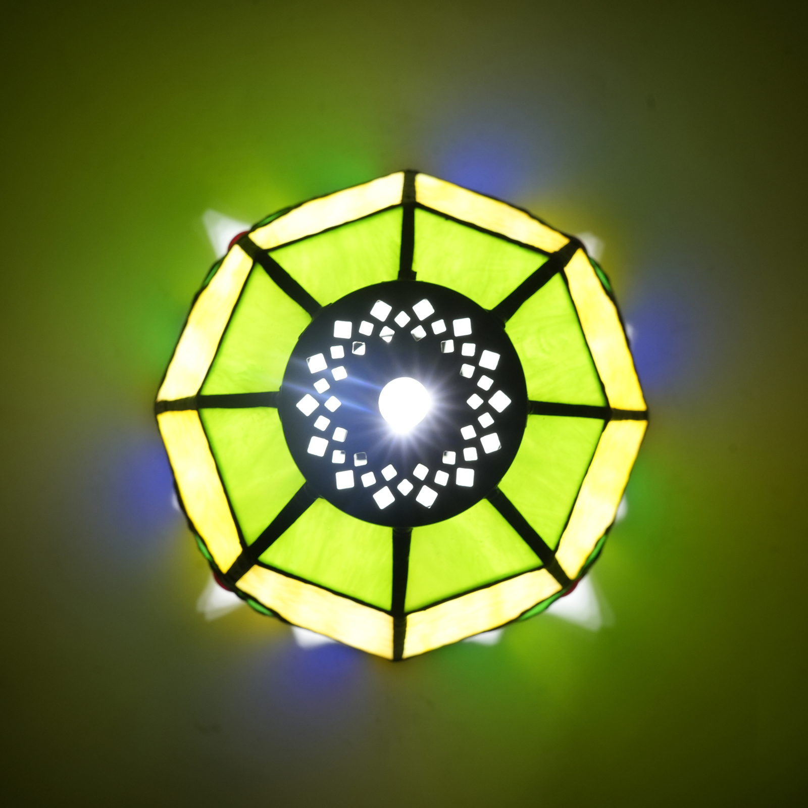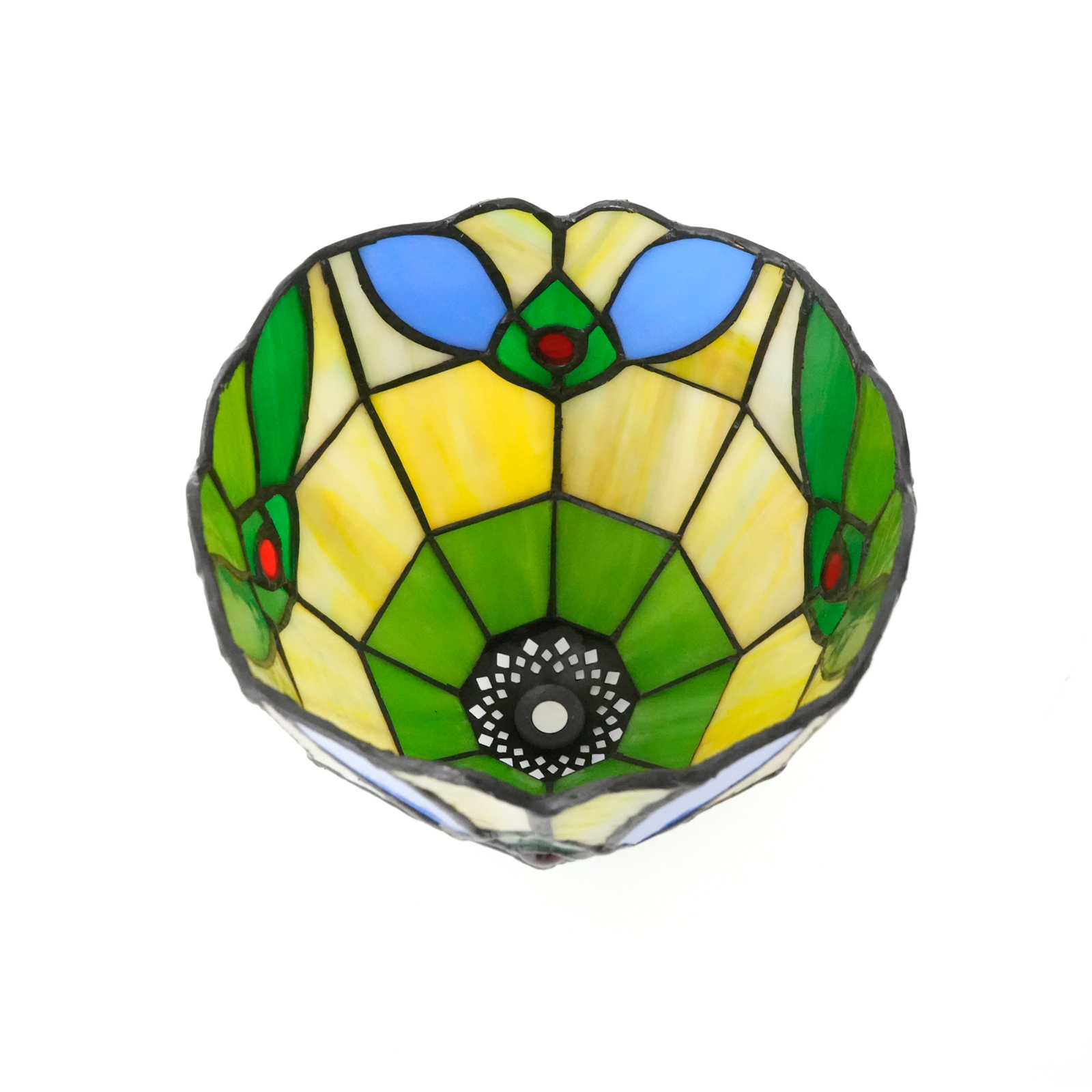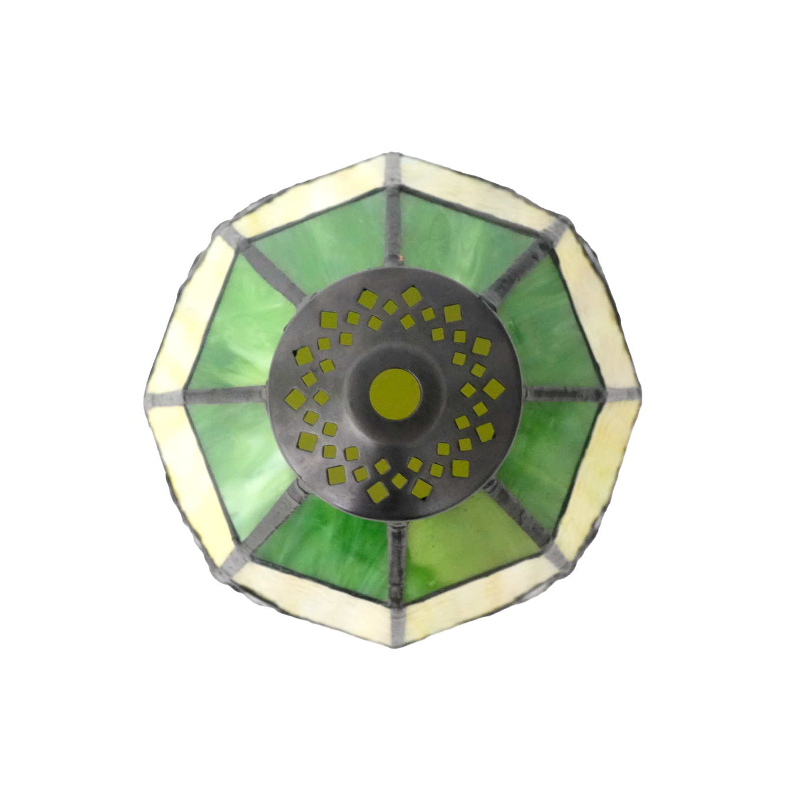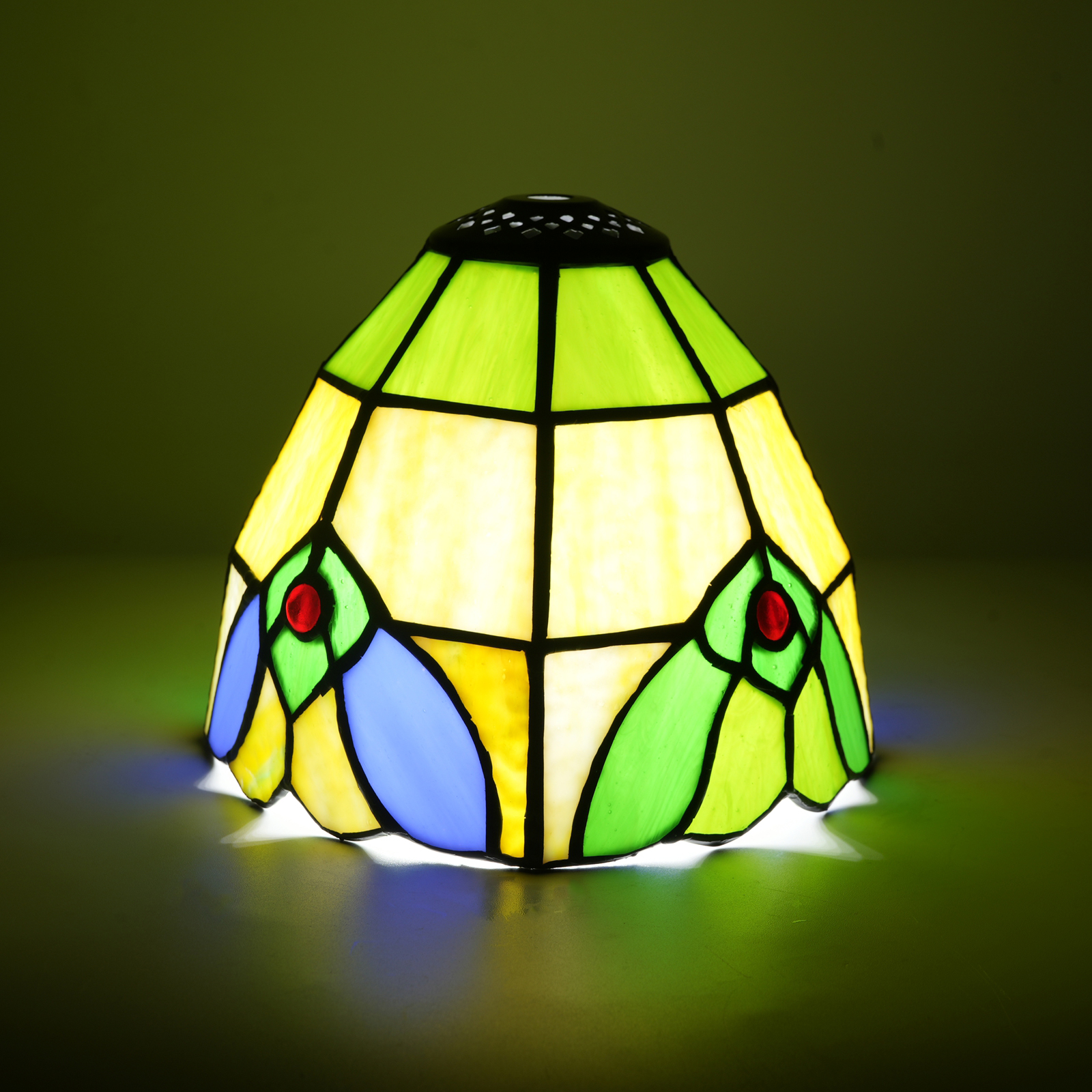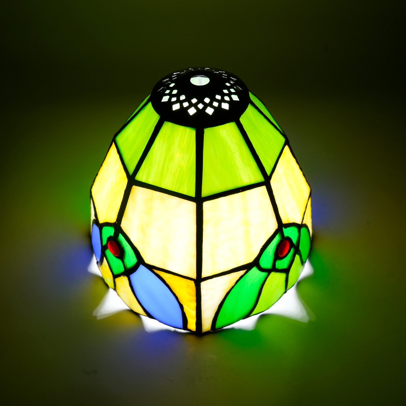This 6-inch (15CM in diameter) lampshade inherits the classic craftsmanship of Tiffany. The craftsman cuts the colored glass, assembles and welds it with copper foil, outlining a pattern where geometric shapes and colored beads interweave - green top, yellow body and blue decoration, with the colors blending naturally. With a height of 13.5CM (5.31inch), it is suitable for various types of lamps. Weighing 0.44Kg (0.97Lb), it is lightweight and easy to replace. The small hole design is compatible with table lamps, chandeliers and wall lamps, allowing the warmth of handcrafted art to be integrated into the "coat" of each lamp.
