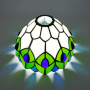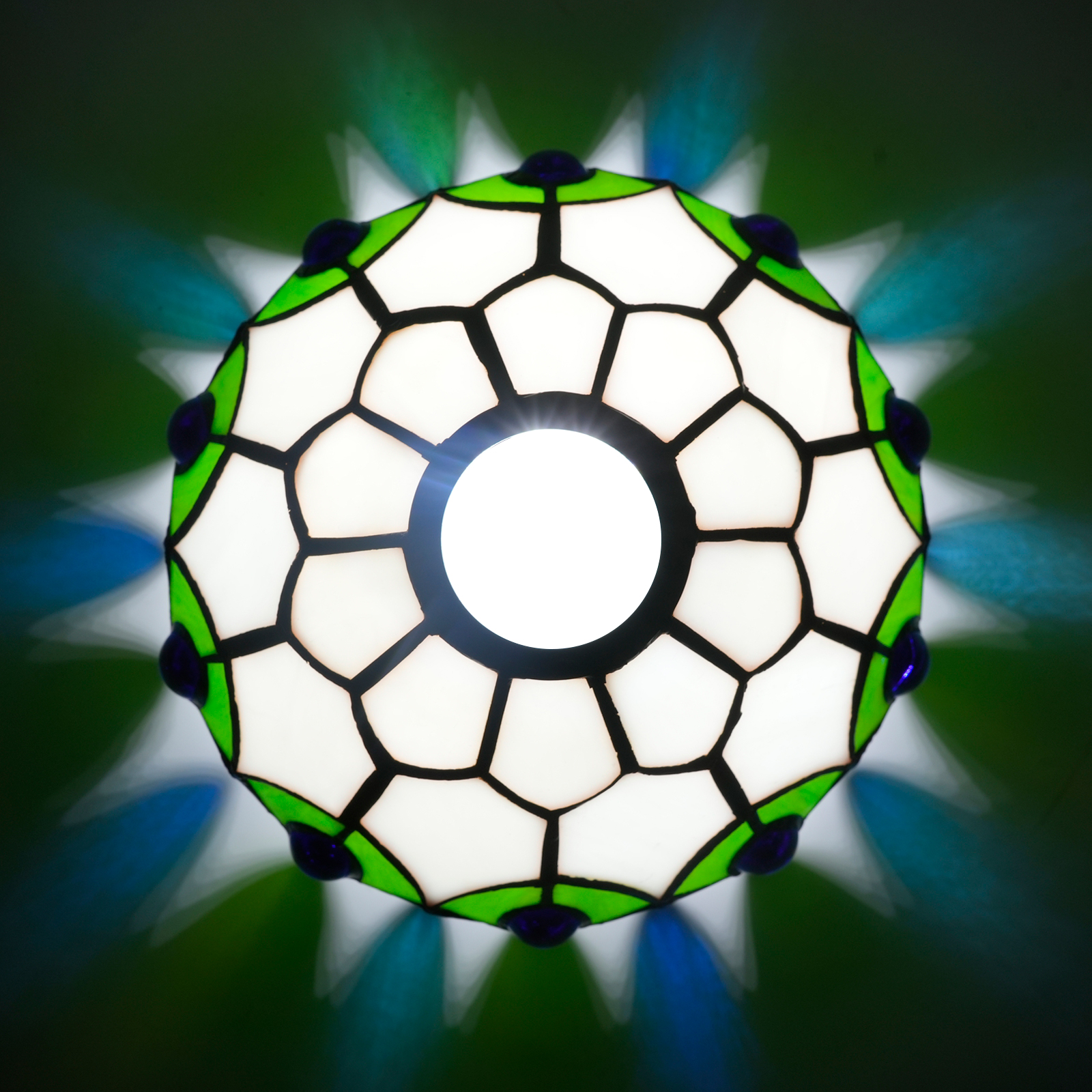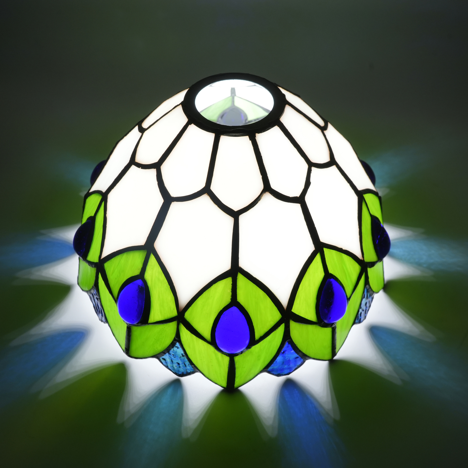 Unique pattern design: The lampshade is inspired by the tail feathers of a peacock and is made of glass in green, white, purple, blue and other colors. The white glass at the top is arranged in hexagonal patterns, just like a pure background color. The green glass at the bottom imitates the shape of peacock feathers, vivid and lifelike. It is decorated with deep purple glass and blue glass as the edge of the feathers. The overall shape is exquisite and elegant, full of artistic sense.
