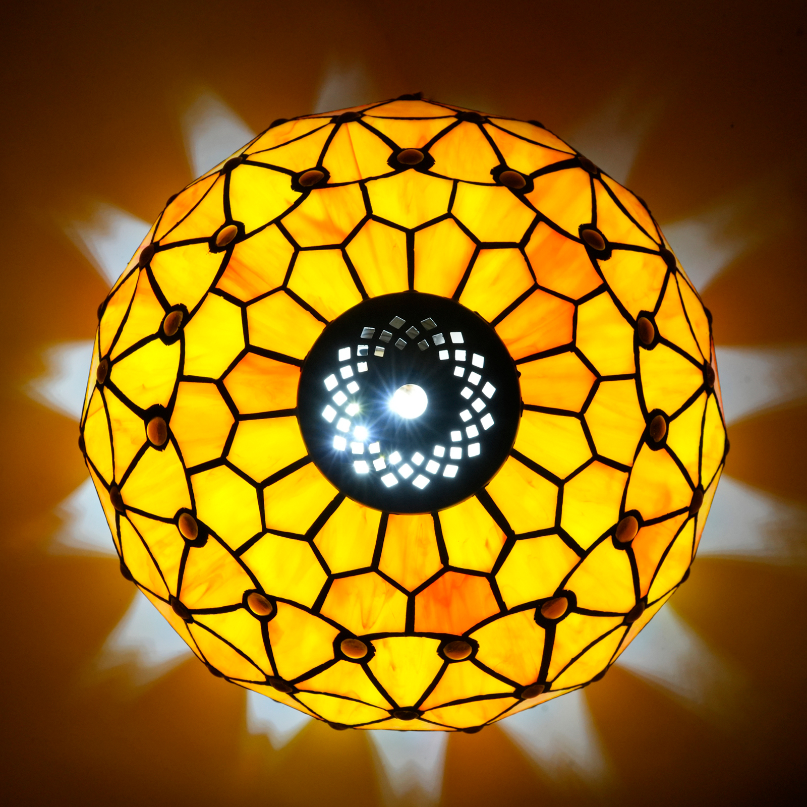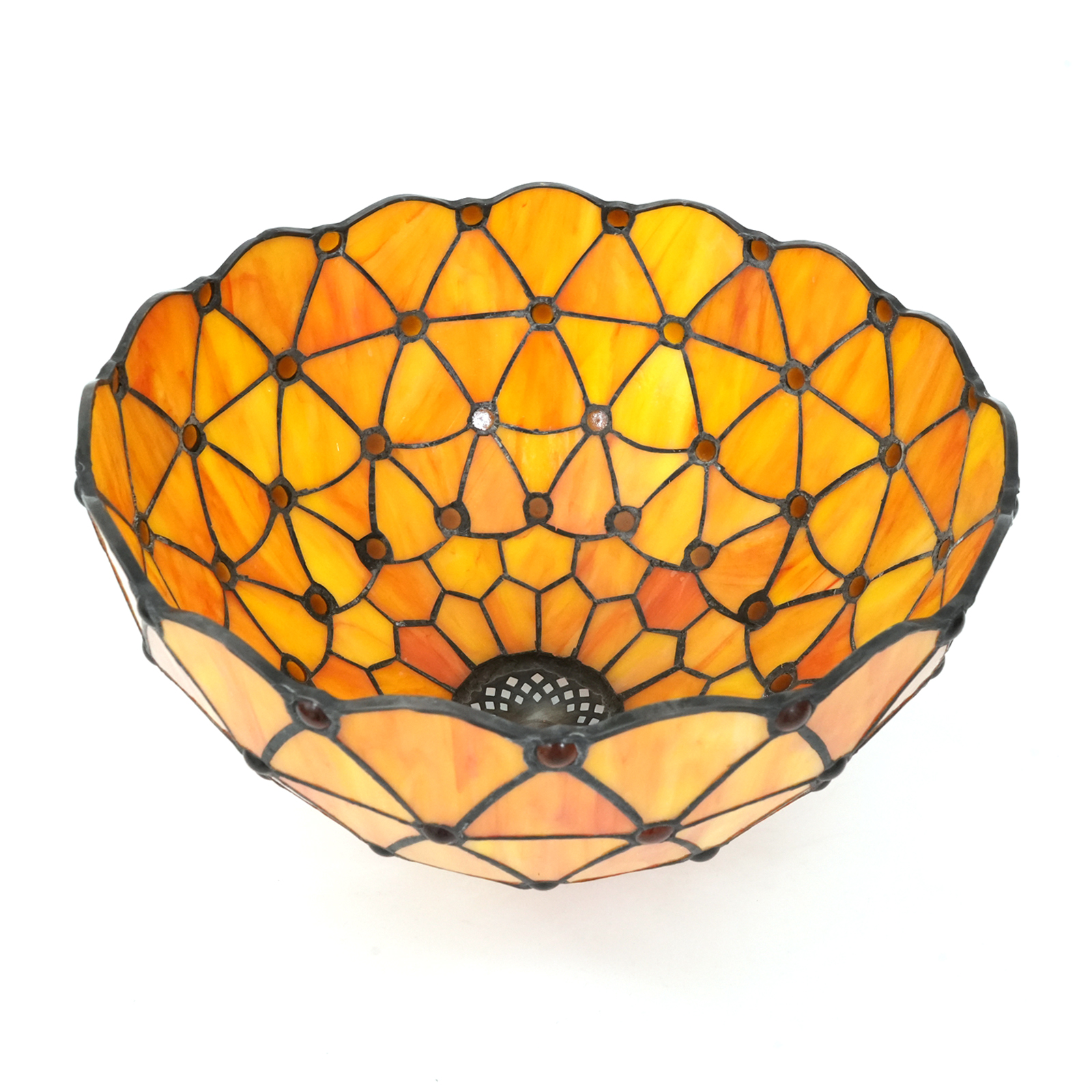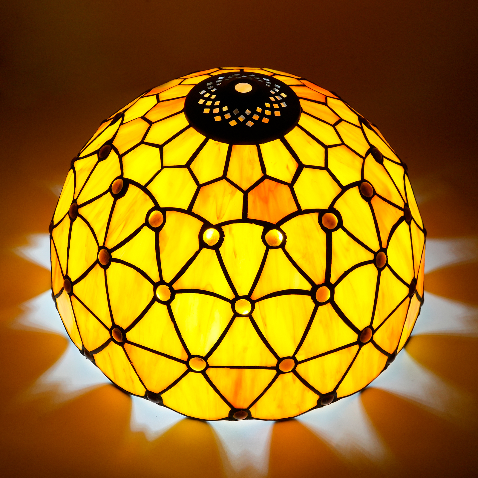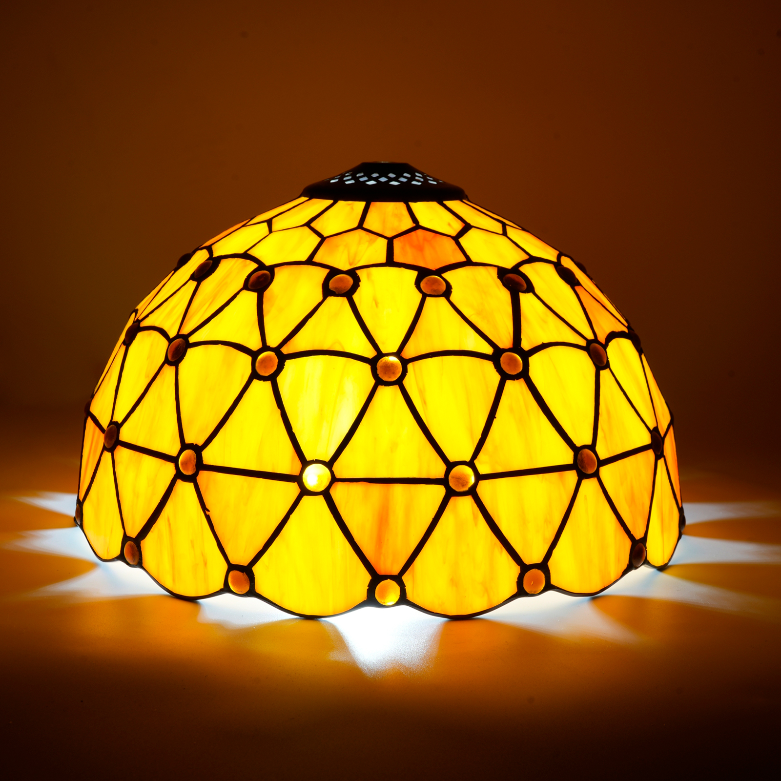 Inheriting the classic Tiffany soldering technique, the artisans draw inspiration from orange tea beads to precisely cut and assemble the stained glass. Each piece of glass is polished, coated with copper foil (made of brass, firmly adhered), and then welded piece by piece to perfectly present the geometric patterns and warm tones of the orange tea beads. With a diameter of 12 inches (approximately 30CM) and a height of 18CM, the semi-circular dome Outlines a retro silhouette. The small holes precisely fit table lamps, floor lamps, and chandeliers. The handcrafted warmth endows the work with a unique artistic soul.