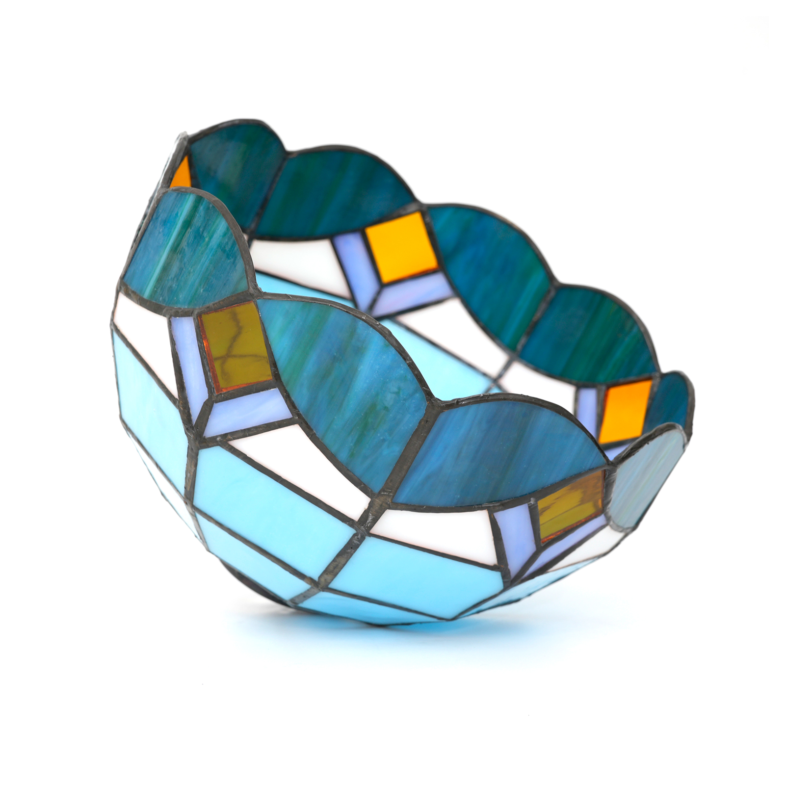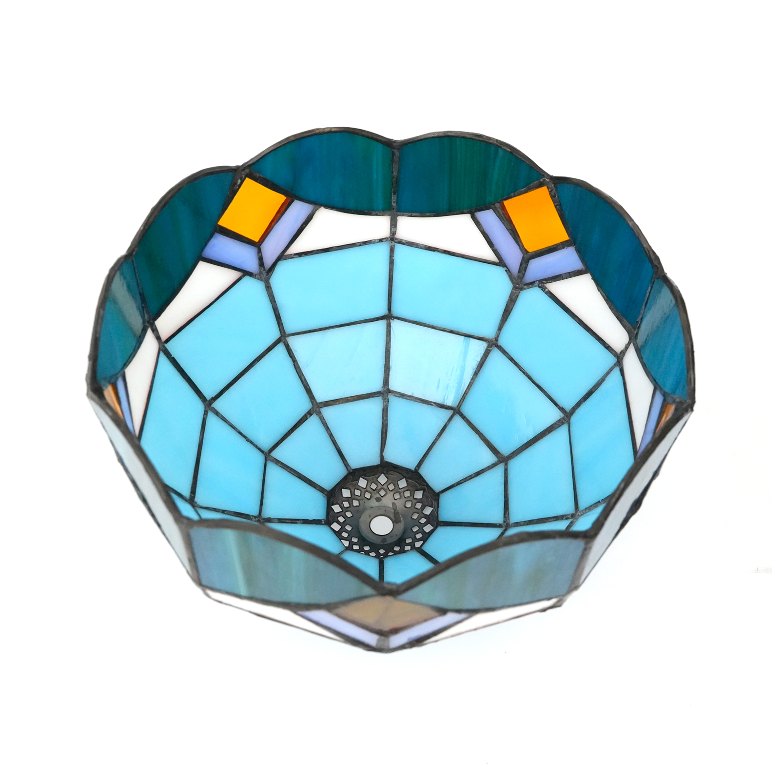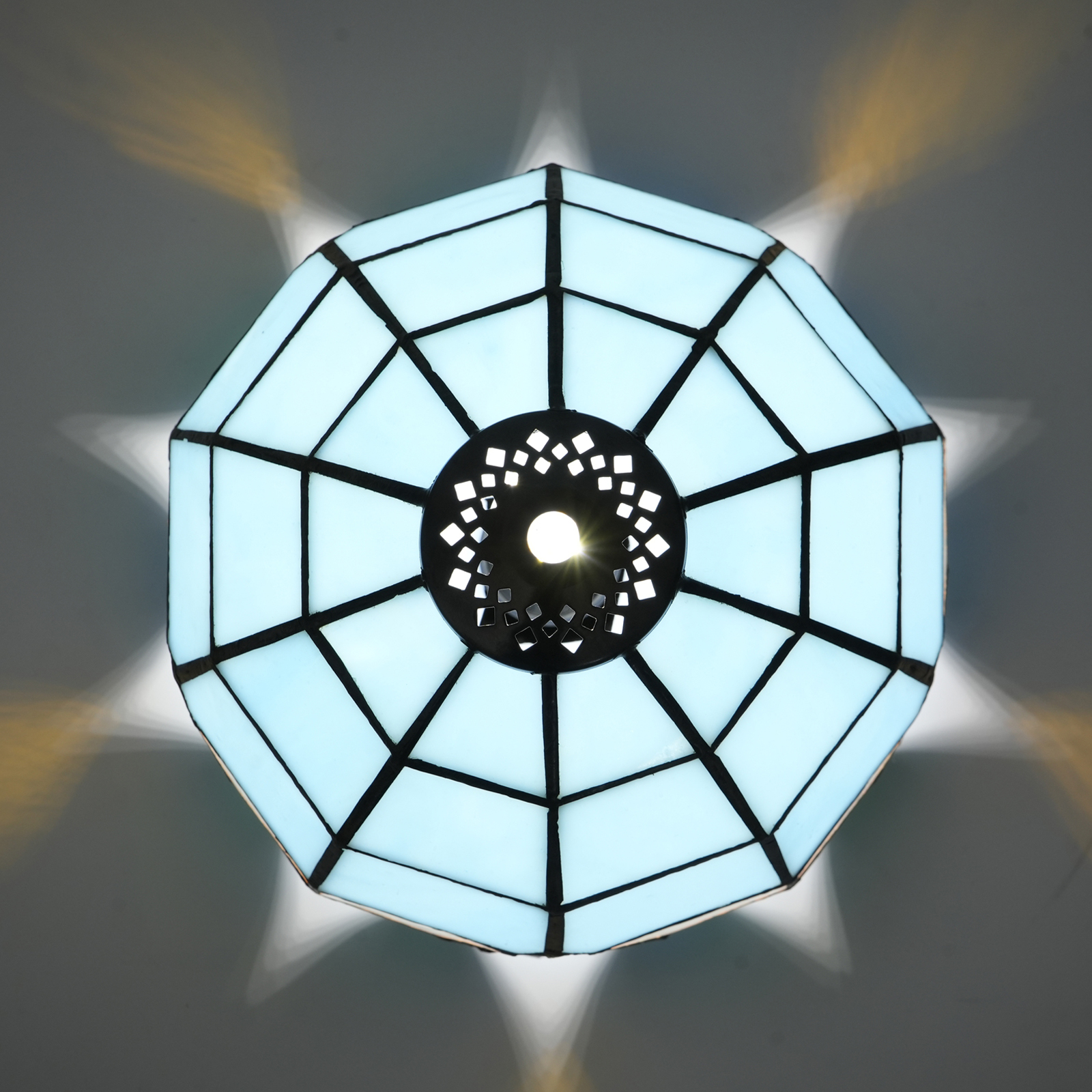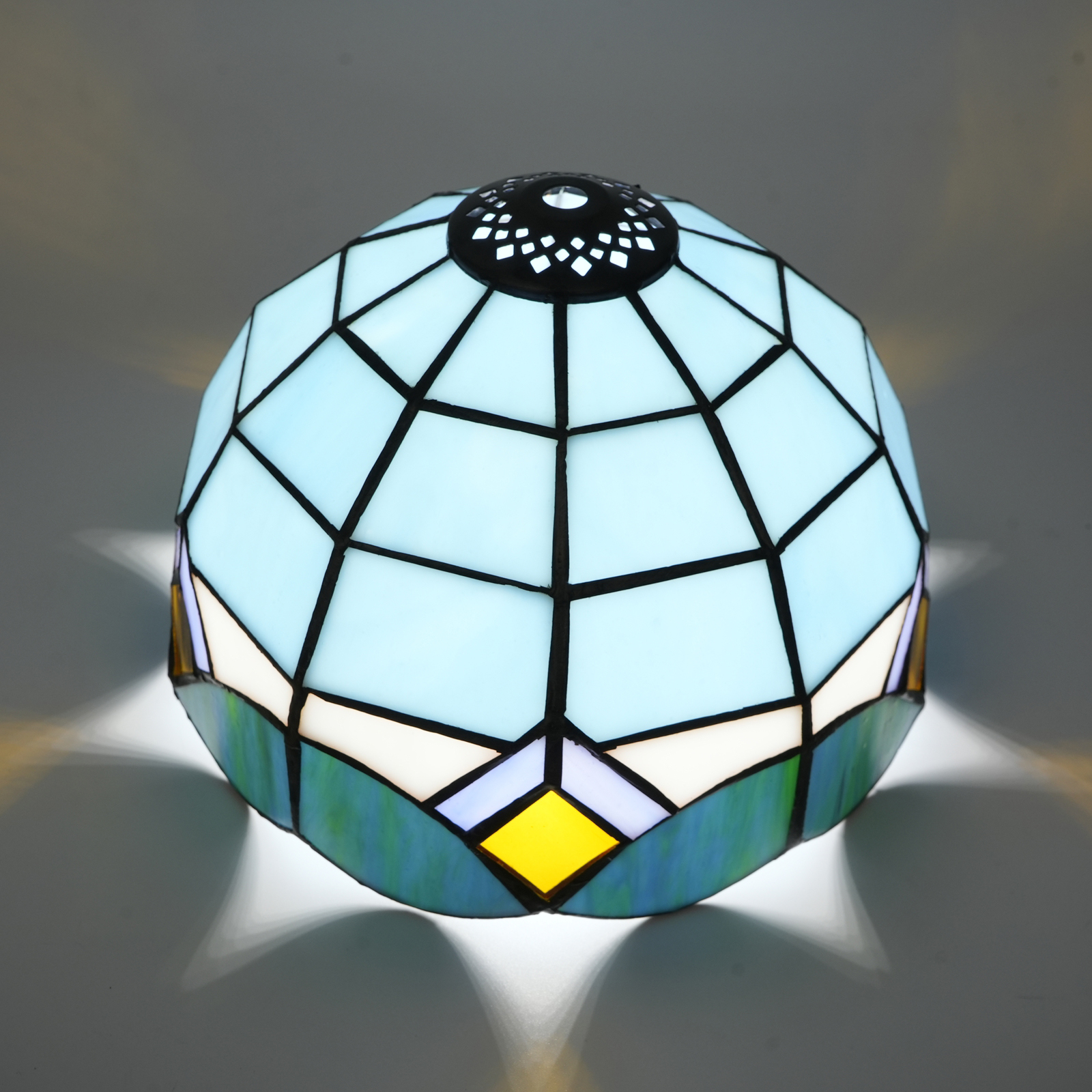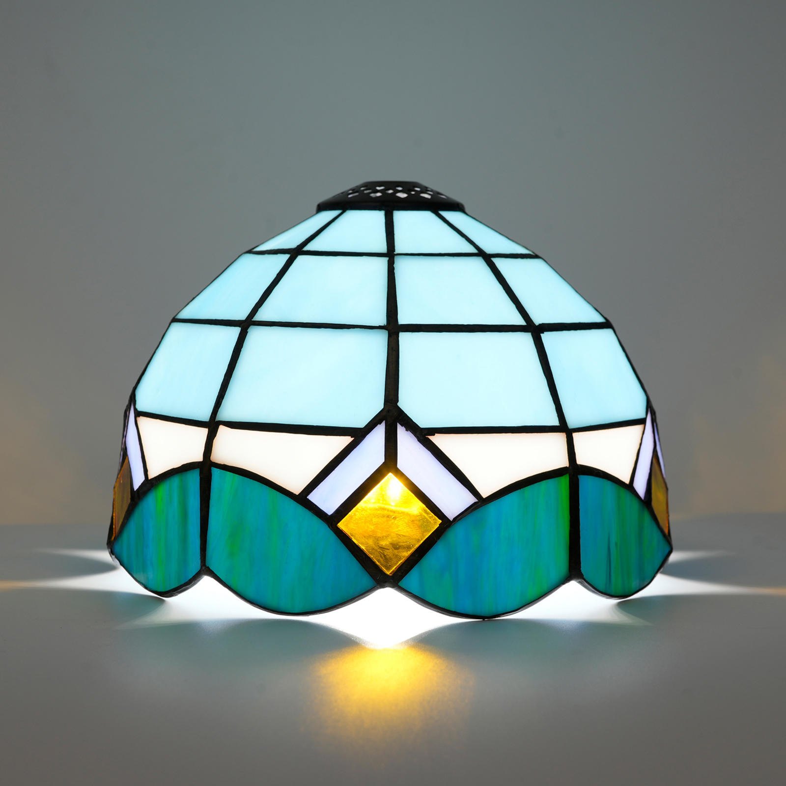 Inheriting the classic Tiffany craftsmanship, it is handcrafted by artisans. Carefully selected colored glasses in blue, white, gold and other colors are cut into unique patterns interwoven with geometry and curves. Wrapped in copper foil and welded, each piece of glass is closely connected. The subtle joints and unique welding textures endow the lampshade with an irreplaceable artistic mark. Small holes are hidden within, adding delicate layers to the flow of light and shadow, recreating the refinement and romance of the Victorian style.