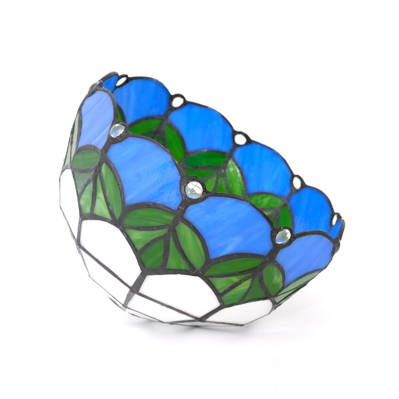 Inheriting the classic craftsmanship of Tiffany, each "little lotus leaf" is handcrafted by artisans. Selected colored glass is cut and polished, with the edges wrapped in fine copper foil, and then welded into shape. The interwoven shades of green are a vivid reproduction of the veins of lotus leaves. Pure and clear blue, like the gentle ripples of the lake water on a summer night. The handcrafted warmth endows the pattern with vivid vitality, allowing the "little lotus leaves" to unfurl on the lampshade and quietly concealing the natural poetry within the home. The large hole design reserves a passage for the flow of light and shadow, adding more vitality.