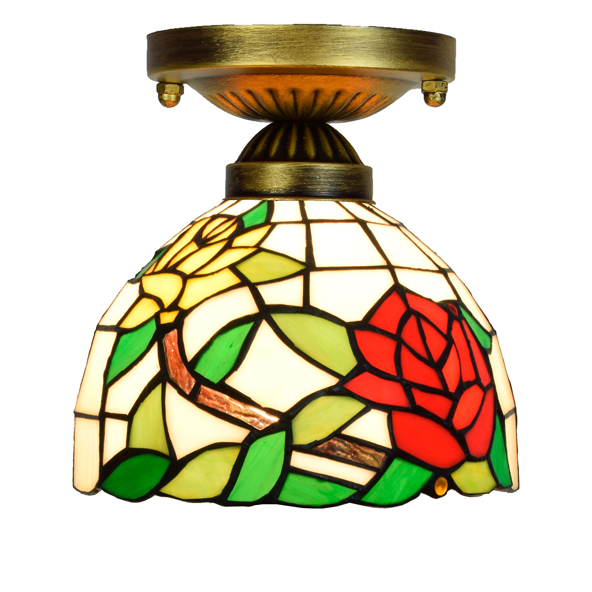 Blivuself Tiffany style Stained glass 8-inch red and yellow rose ceiling light European and American retro style, suitable for living room, dining room, bedroom, bar and other indoor home decoration 8-inch two-color rose big mouth - small ceiling light OFC8029