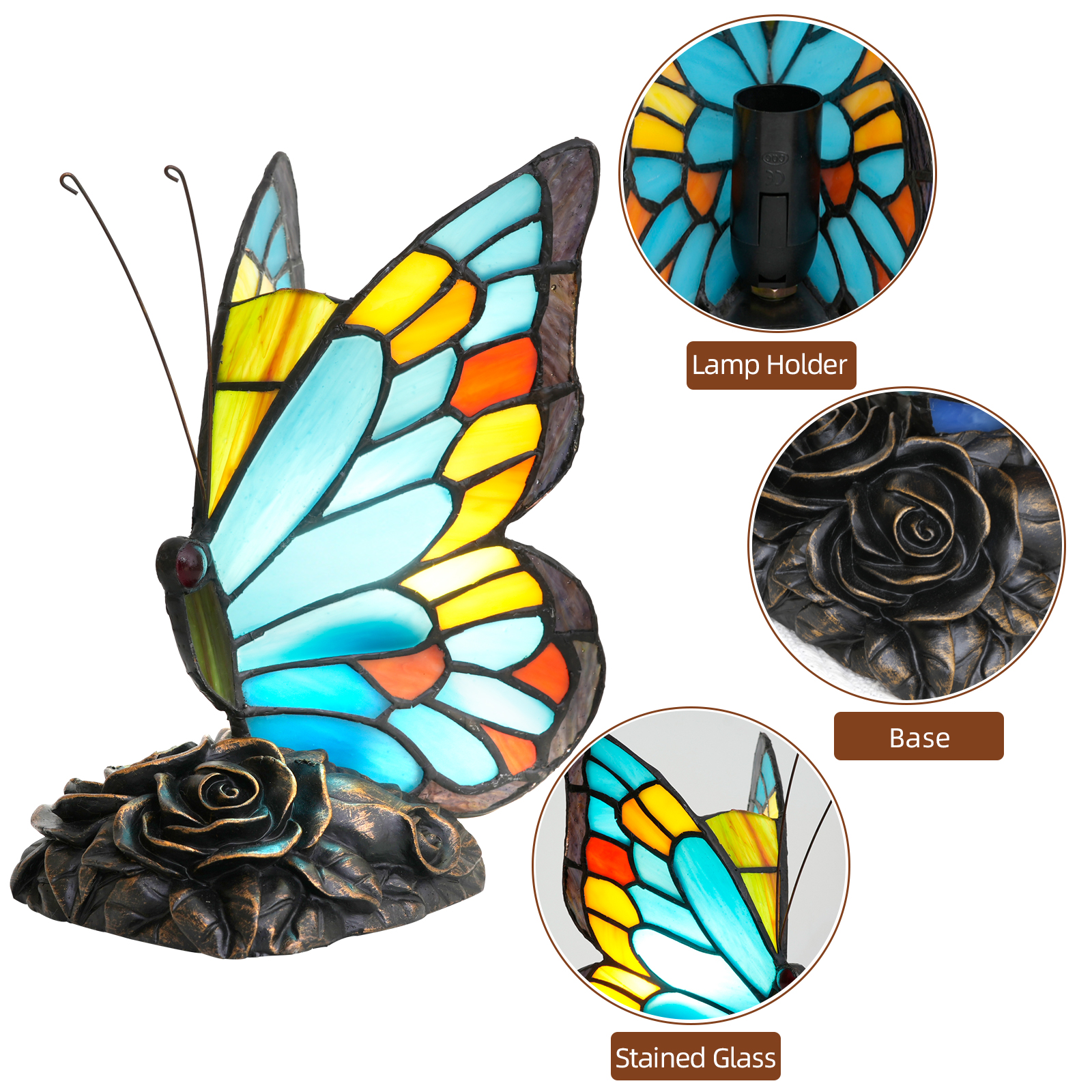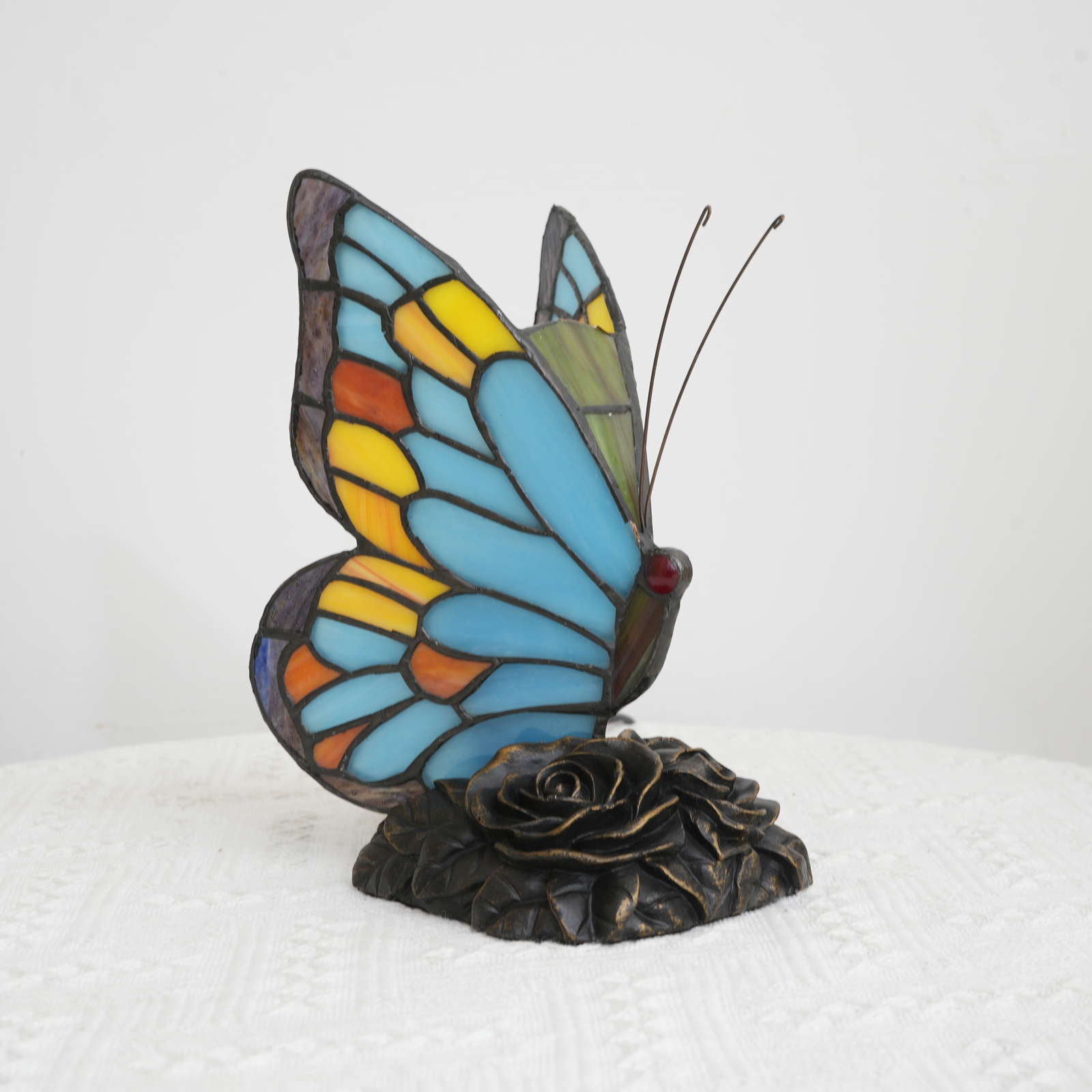 This mini desk lamp is 20.5CM (8 inches) tall and uses hand-painted colored glass as a pen to depict butterfly wings with a dominant blue color. Craftsmen cut blue, yellow, orange and other colors of glass, wrapped them with copper foil and welded them, allowing the colors of the butterfly wings to naturally blend - the serenity of deep blue and the clarity of light blue, combined with yellow and orange spots, as if the colors of the sky were condensed into the glass. The base is engraved with vintage roses, echoing the butterfly wings. With a 173CM (68inch) long line, it can flexibly adapt to small Spaces such as bedrooms and dormitories, concealing the delicacy of Tiffany craftsmanship in every detail.