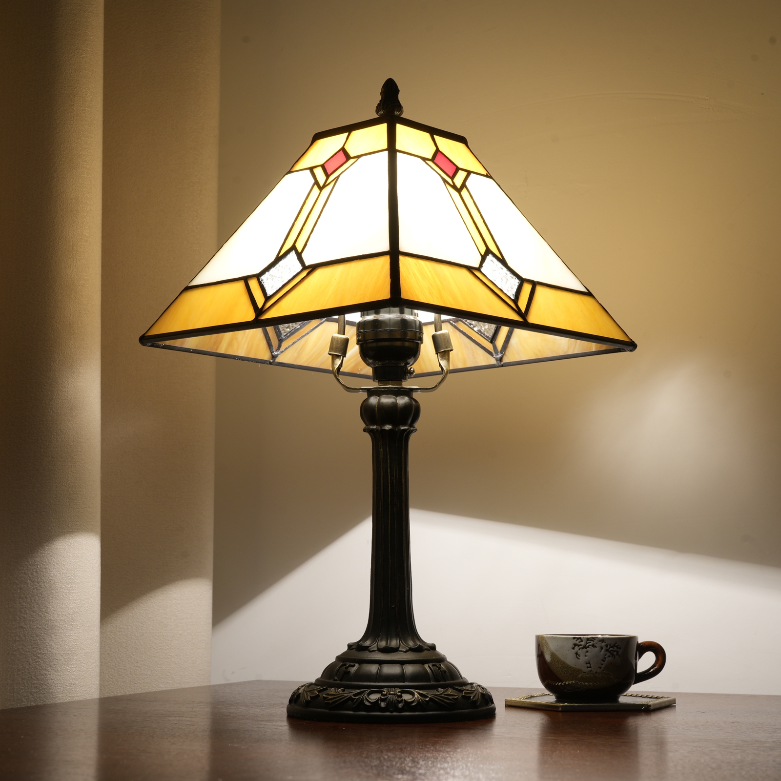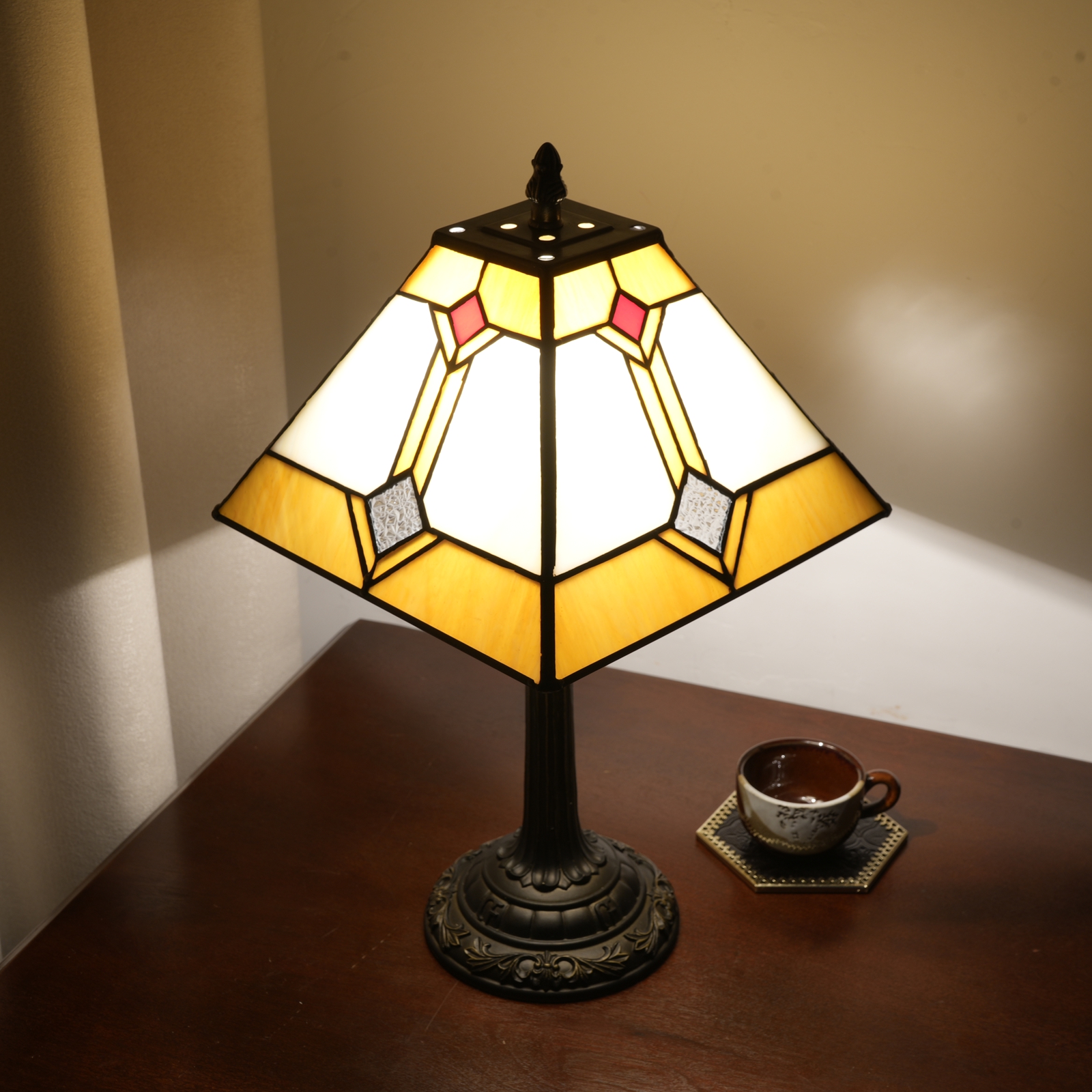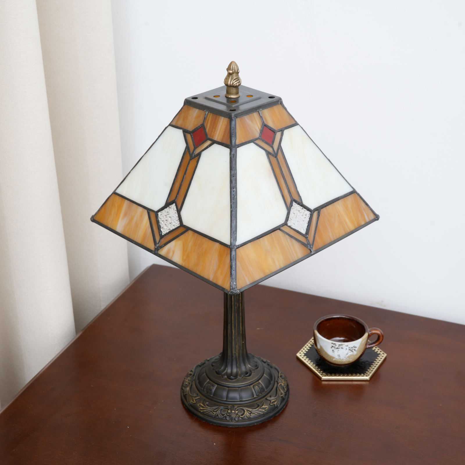 The lampshade of each table lamp is handcrafted by artisans. Carefully selected warm red colored glass, it undergoes multiple meticulous processes such as cutting, splicing and welding to ingeniously combine glass pieces of different colors. The 8-inch square size precisely presents a retro charm. The copper foil between the glass Outlines the lines, and the weld points are like unique artistic imprints, making each lampshade a one-of-a-kind piece. When the light penetrates, the warm red glow gently spreads, and the colored glass refracts rich layers of light and shadow, creating a warm and romantic retro atmosphere, as if slowly unfolding the beauty of the old times.