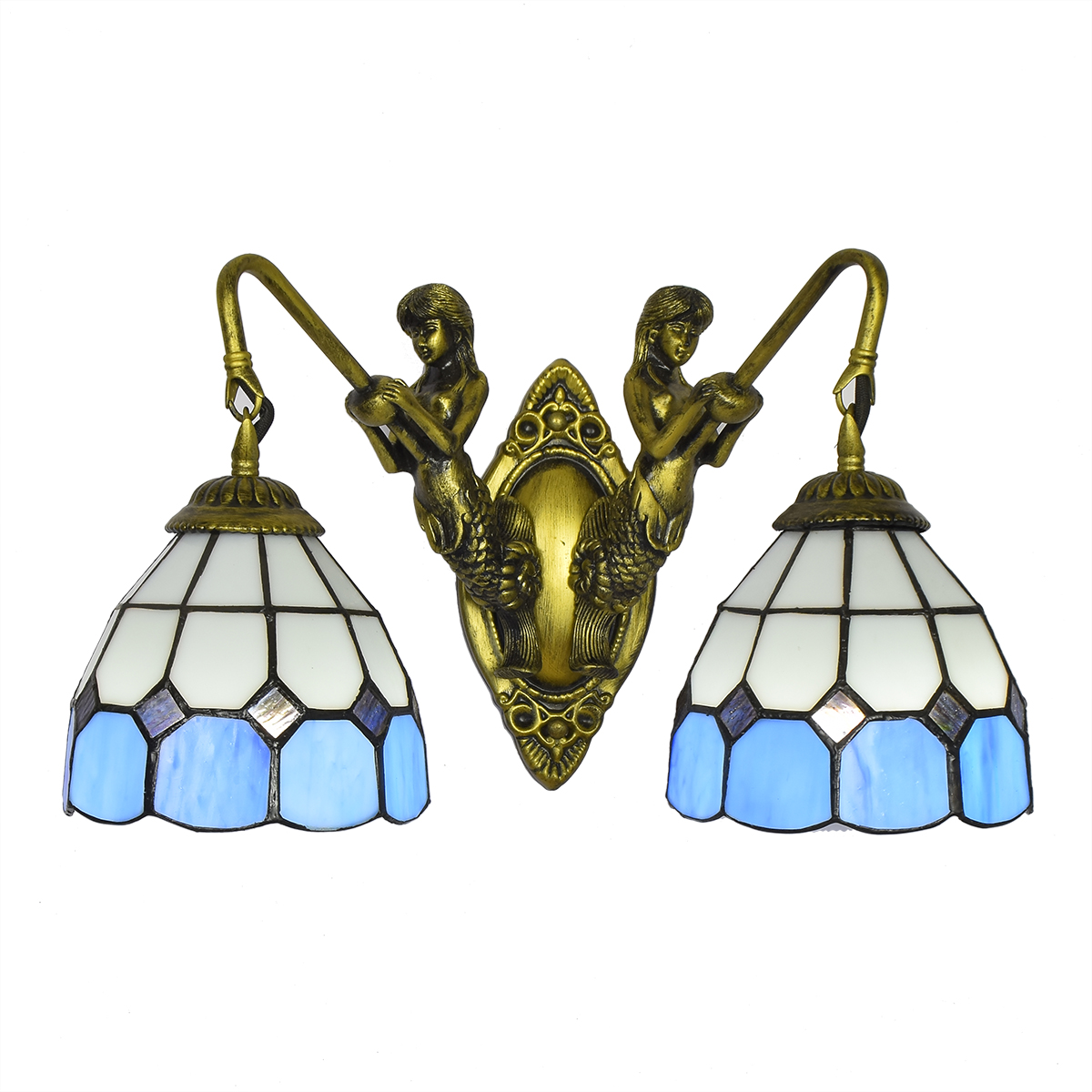 Blivuself Tiffany European Vintage Style Stained Glass 6-Inch Blue Lattice For Restaurant Bedroom Bed Wall Lamp Light Luxury Style Living Room Background Wall Passage Wall Lamp 6-Inch Blue And White Lattice - Double Head Mermaid Wall Lamp OFW0963