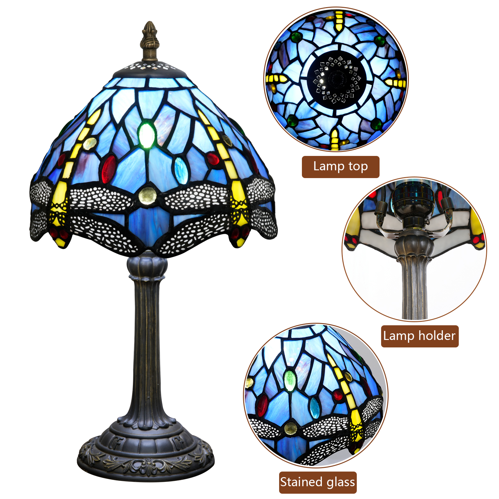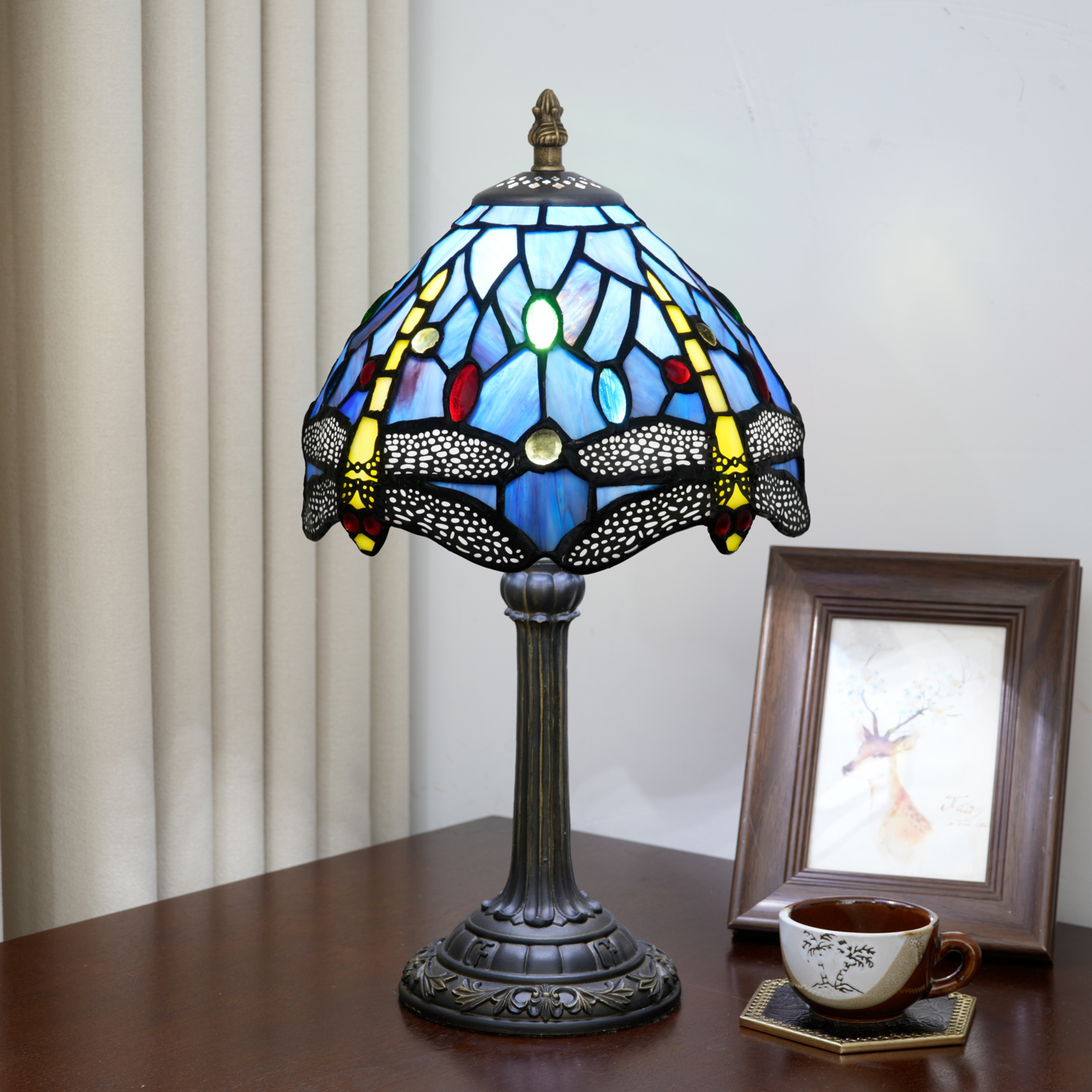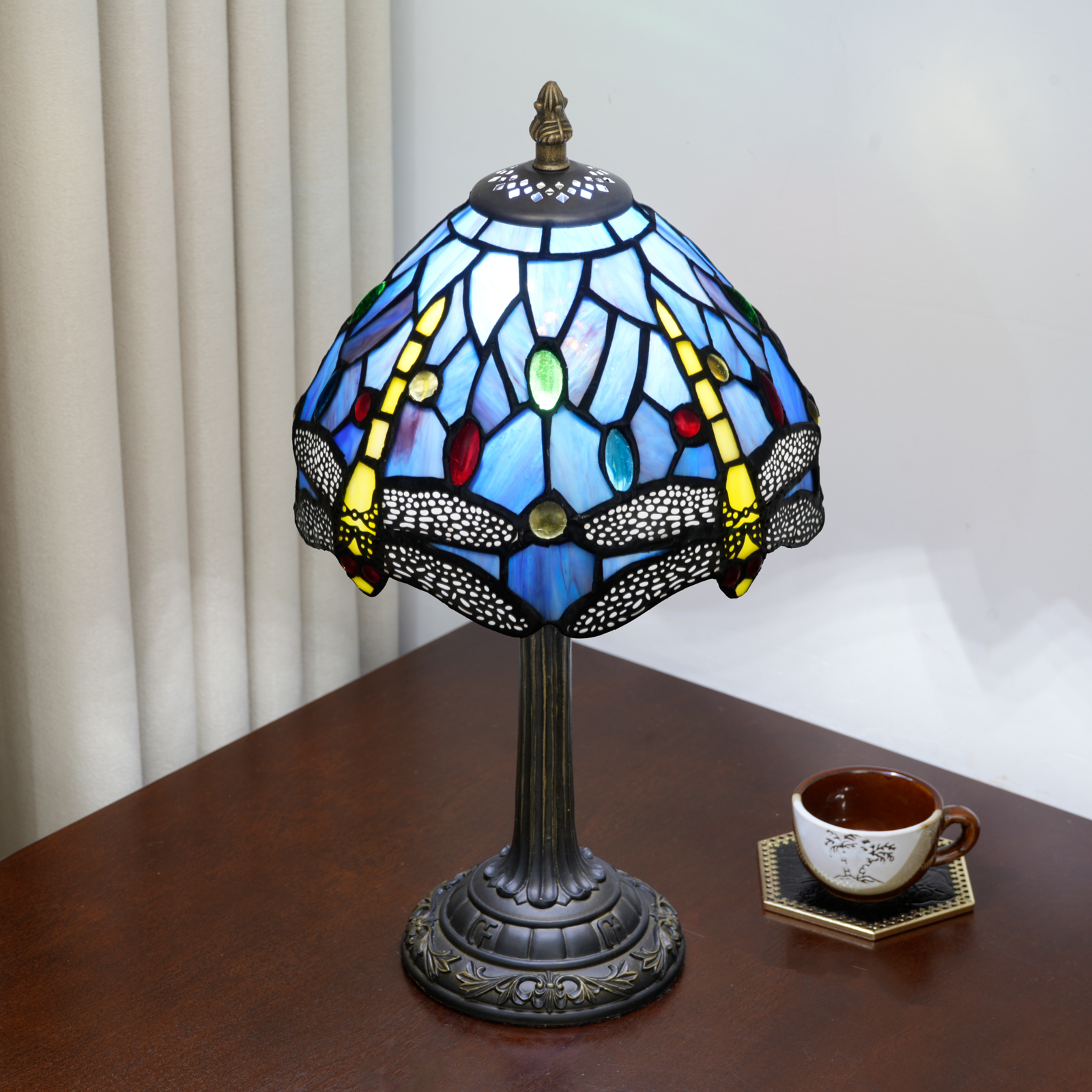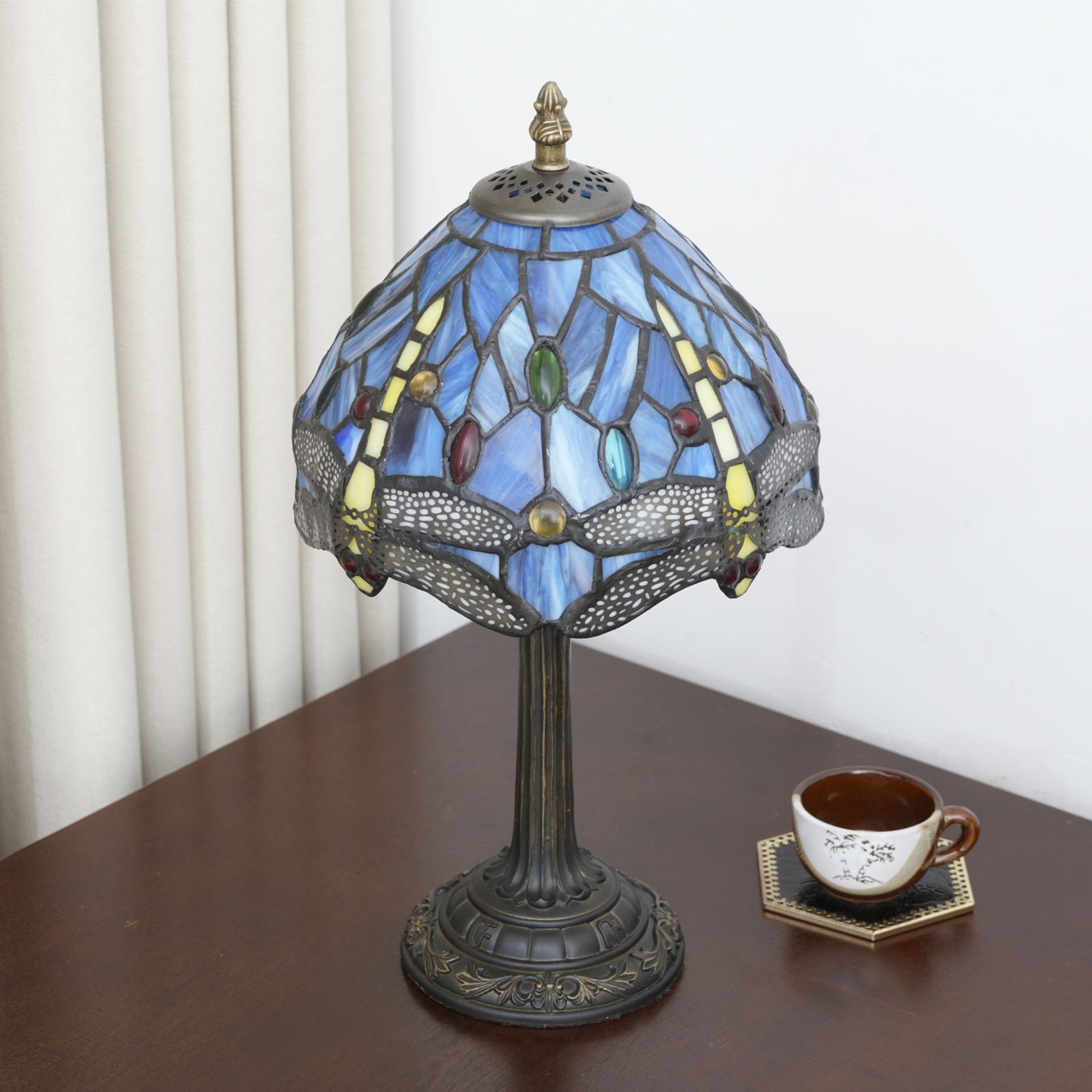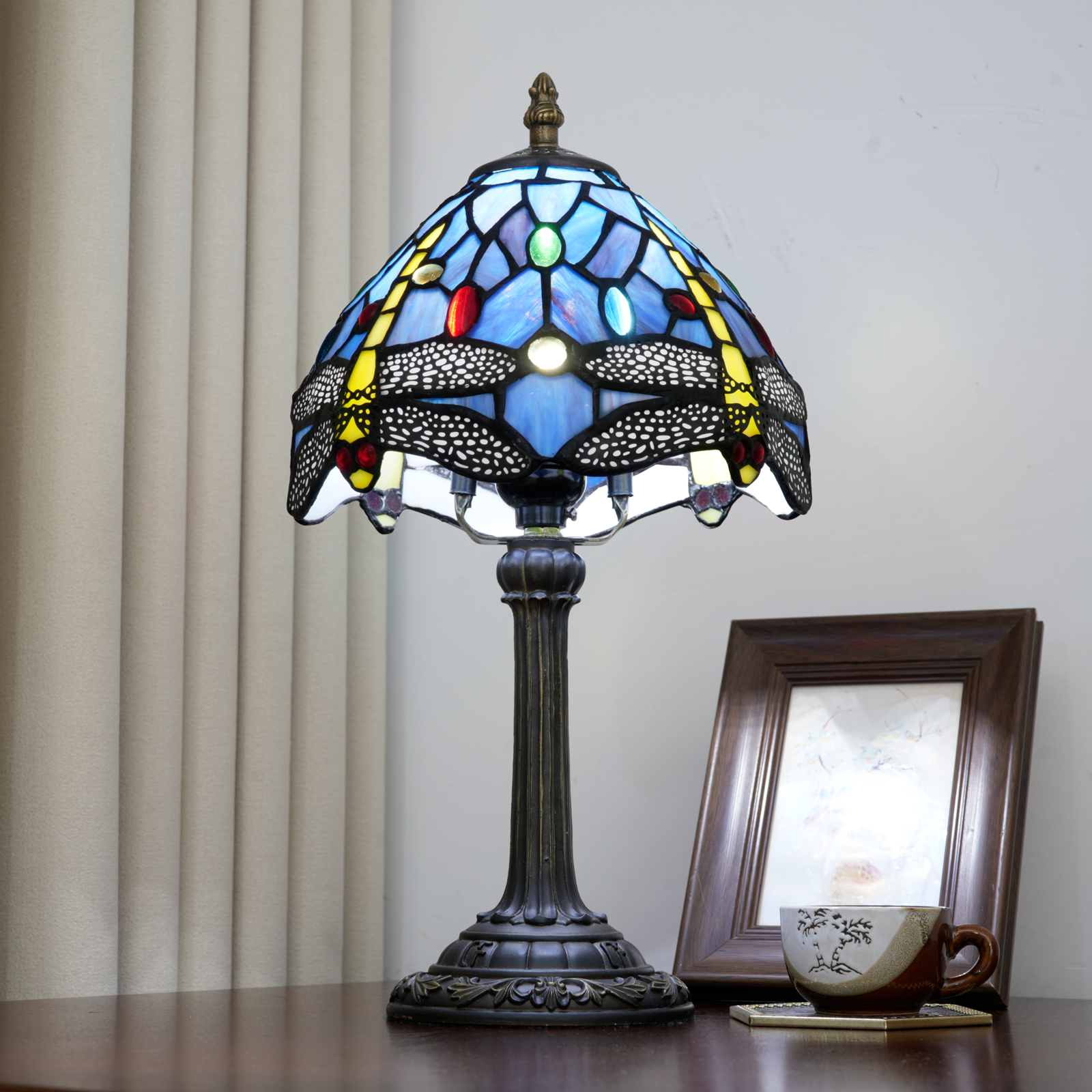 Let light and shadow infuse the home with an artistic soul! This 8-inch 449 Dragonfly desk lamp is inspired by the classic Tiffany style. It features a hand-inlaid colored glass lampshade, presenting a dynamic combination of a blue gradient background and a golden dragonfly. Decorated with red, blue, green and yellow glass beads, it seems to freeze the vitality of nature in the interplay of light and shadow. The resin base firmly supports the 14.4-inch elegant figure, and the 155cm long line design is suitable for various spatial layouts. The lampshade has a diameter of 8 inches. The light passing through the colored glass casts a soft and dreamy halo, adding a retro and romantic atmosphere to the living room, bedroom or study.