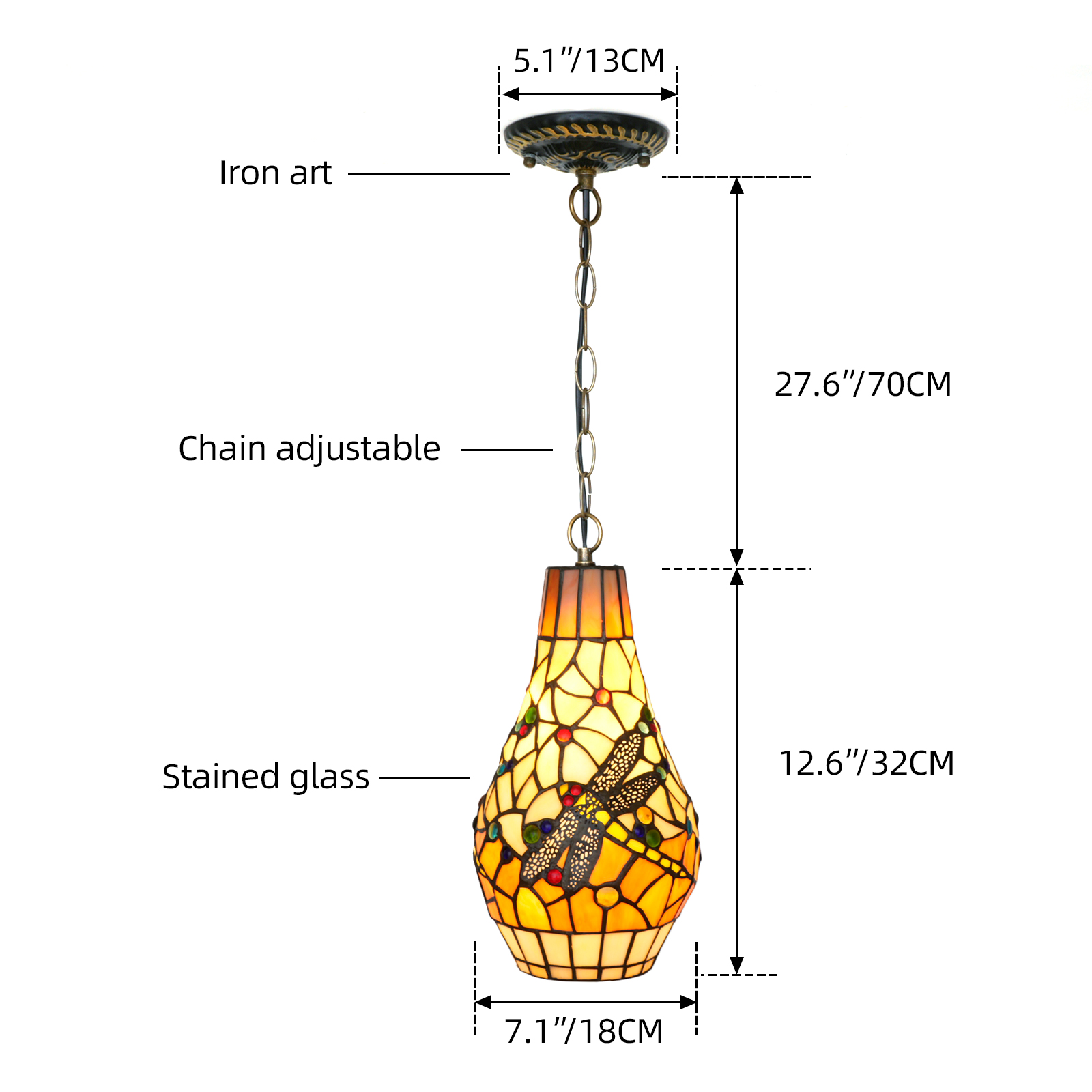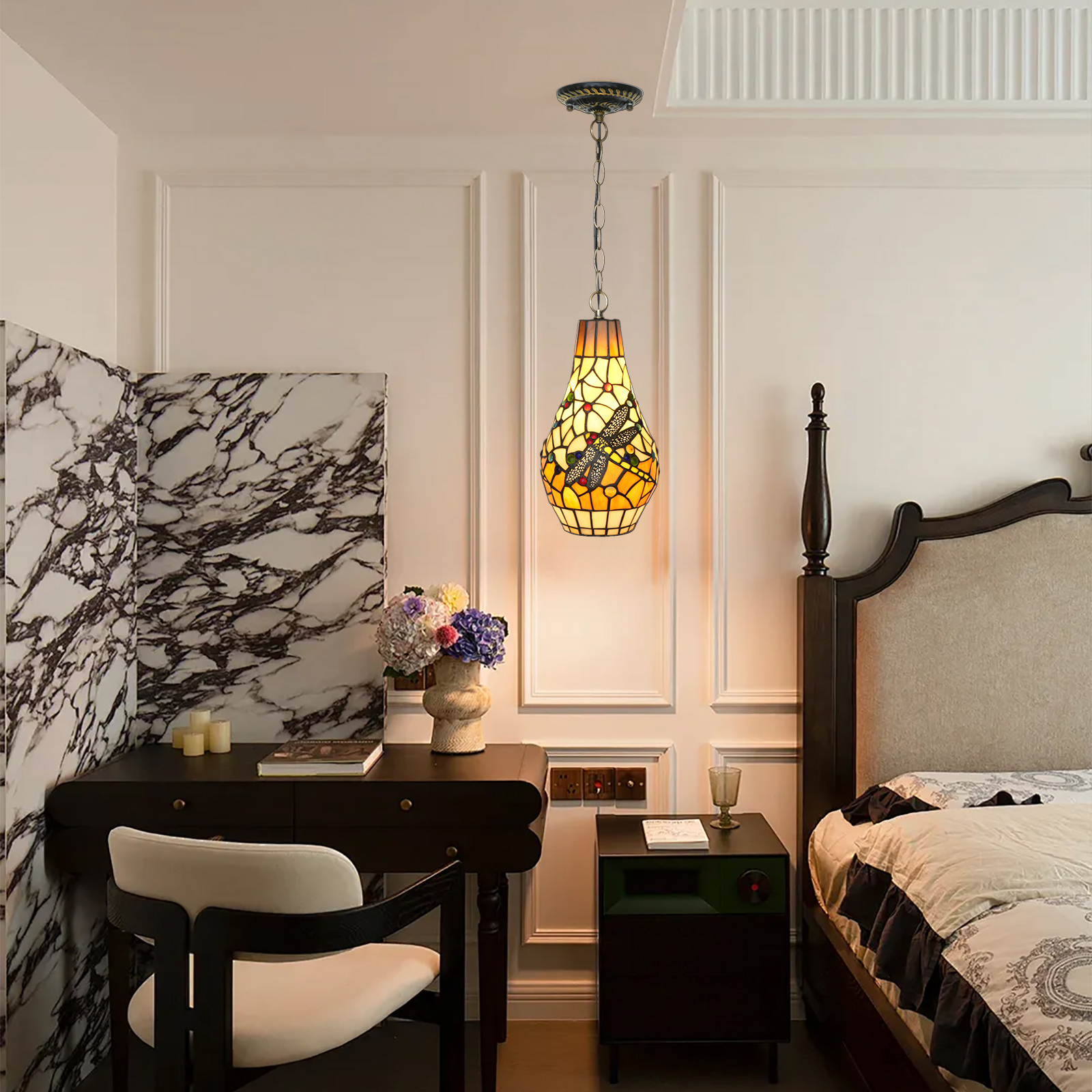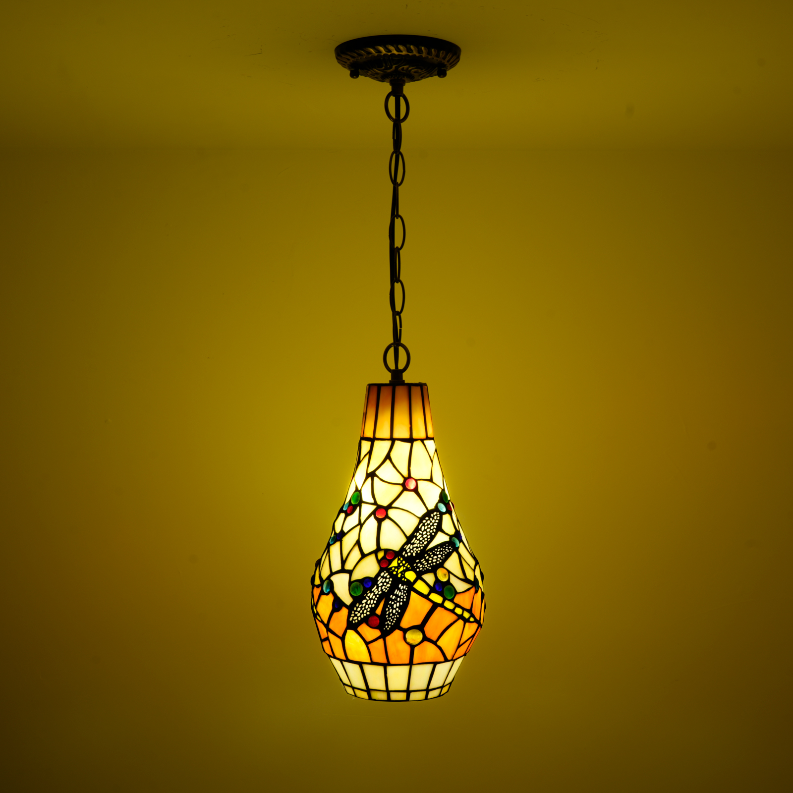 Painted glass lampshade Adopting Tiffany's classic stained glass splicing technique, the warm yellow main tone lays out a warm background color, with red, green, blue and other colorful dots scattered like stars. The dragonfly pattern is the absolute visual focus - the hollowed-out texture on the wings is so fine that it seems as if one can feel the tremor of the thin wings. Each piece of glass splicing fits tightly. When light passes through, the colors will spread out like ripples. It creates a dreamy feeling of "chopping up the sunlight and then gently piecing it together".