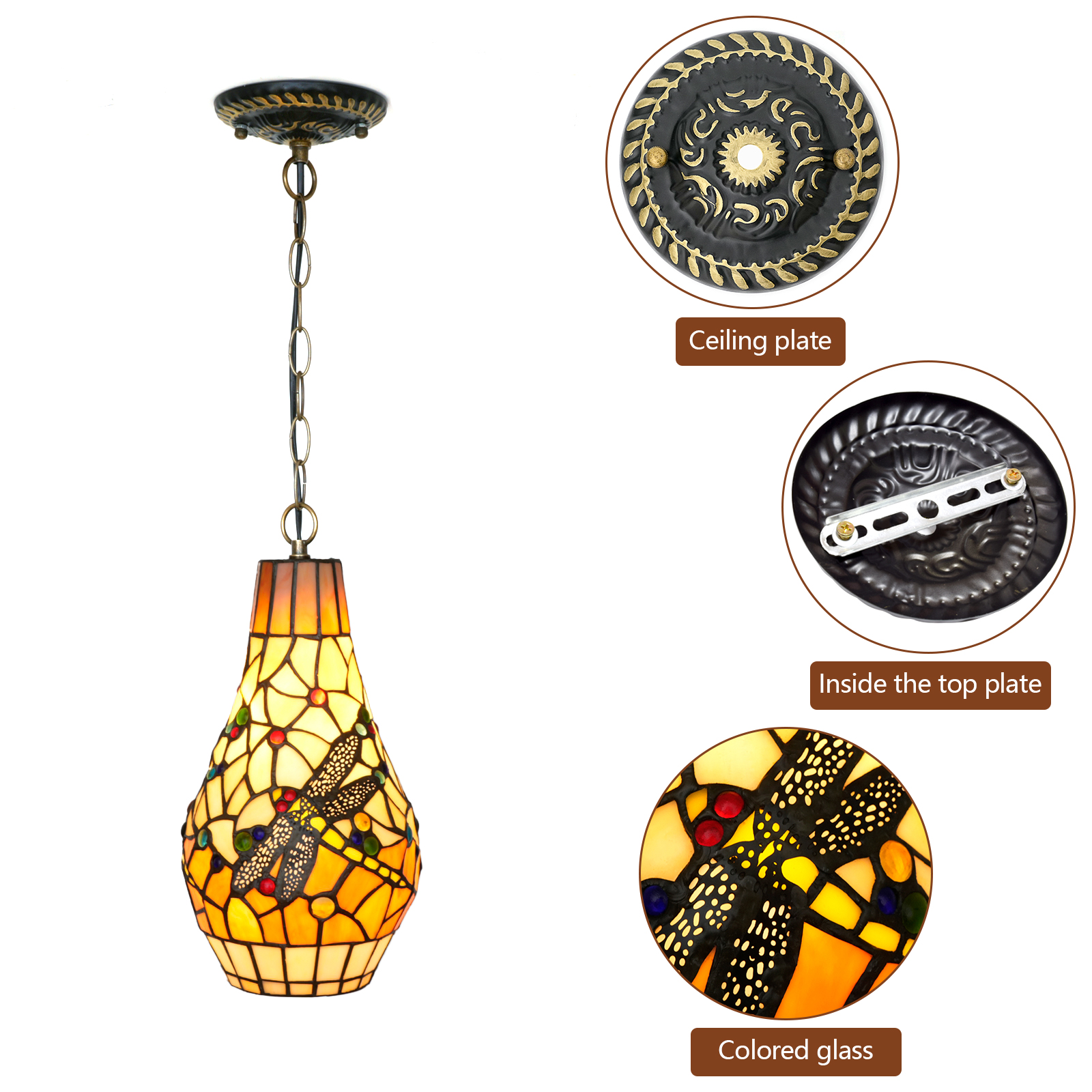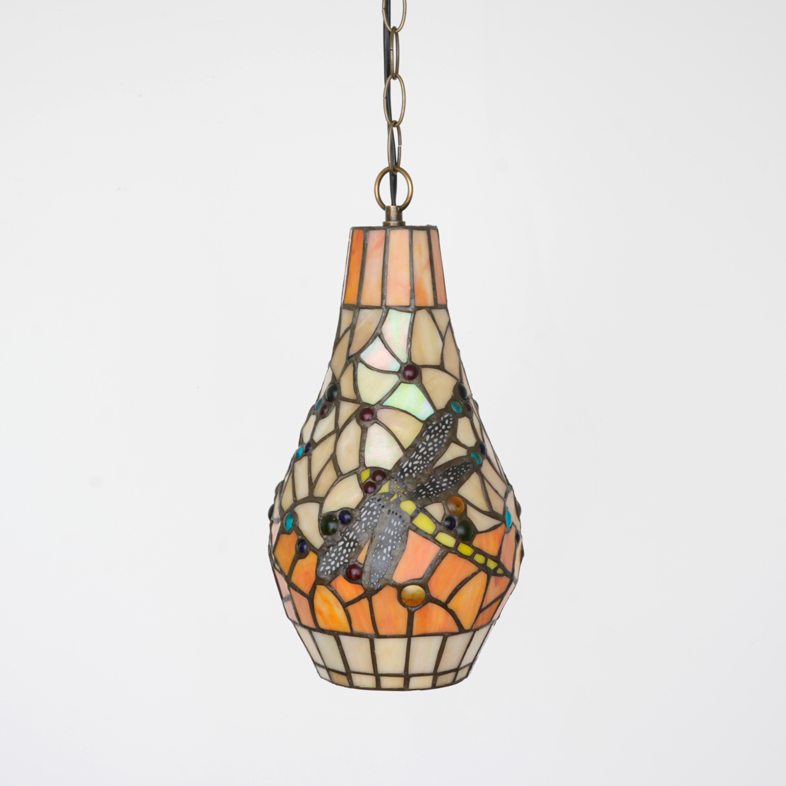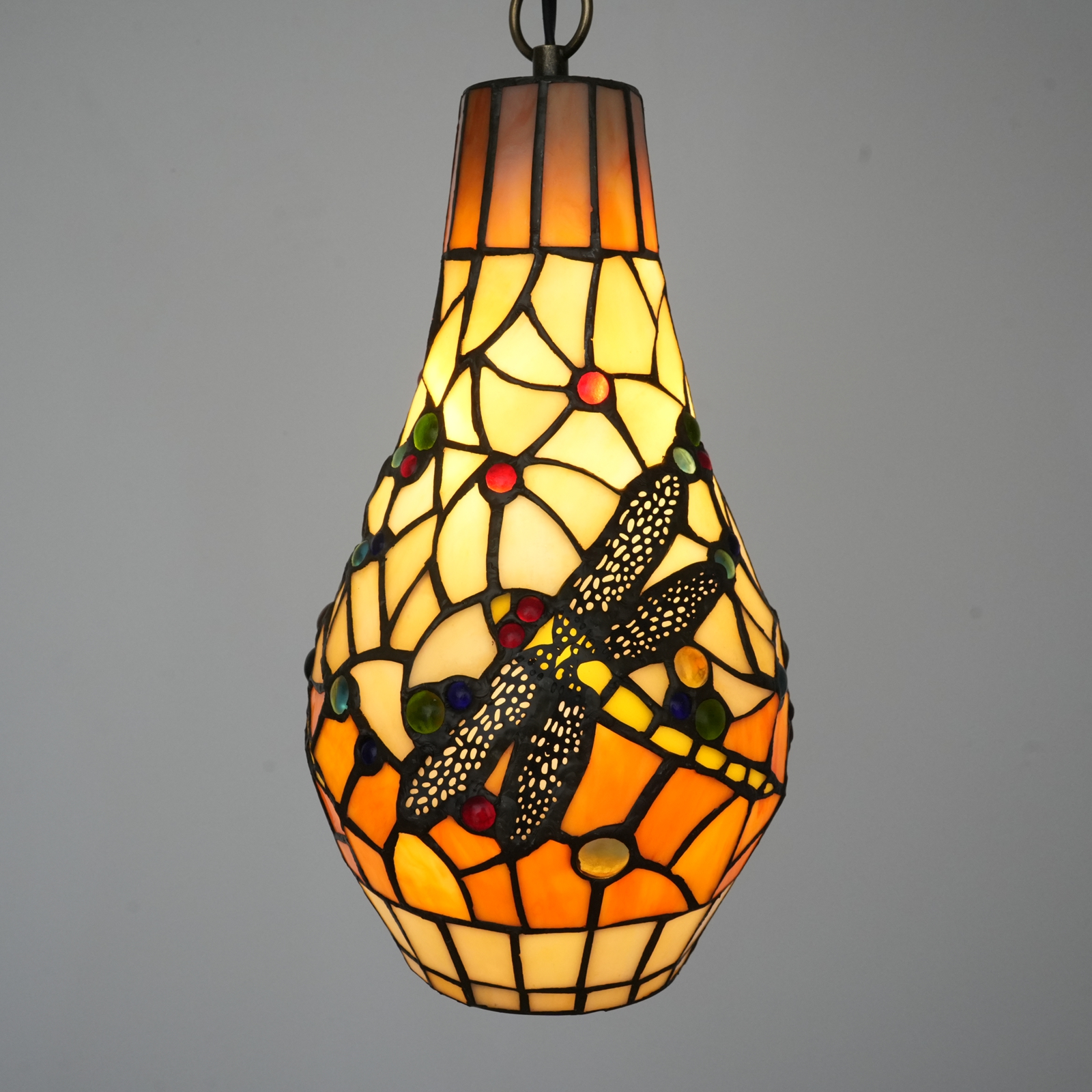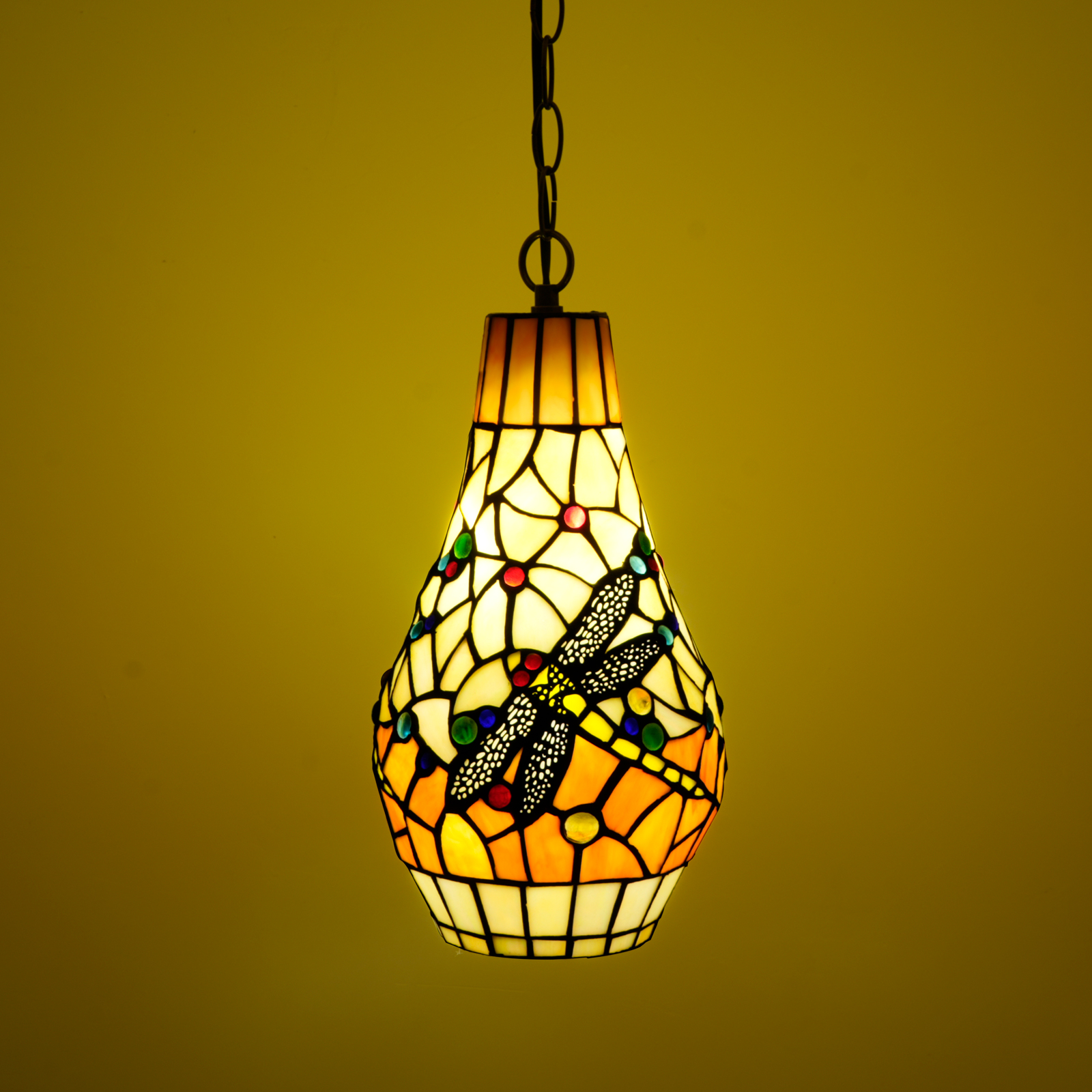 Painted glass lampshade Adopting Tiffany's classic stained glass splicing technique, the warm yellow main tone lays out a warm background color, with red, green, blue and other colorful dots scattered like stars. The dragonfly pattern is the absolute visual focus - the hollowed-out texture on the wings is so fine that it seems as if one can feel the tremor of the thin wings. Each piece of glass splicing fits tightly. When light passes through, the colors will spread out like ripples. It creates a dreamy feeling of "chopping up the sunlight and then gently piecing it together".