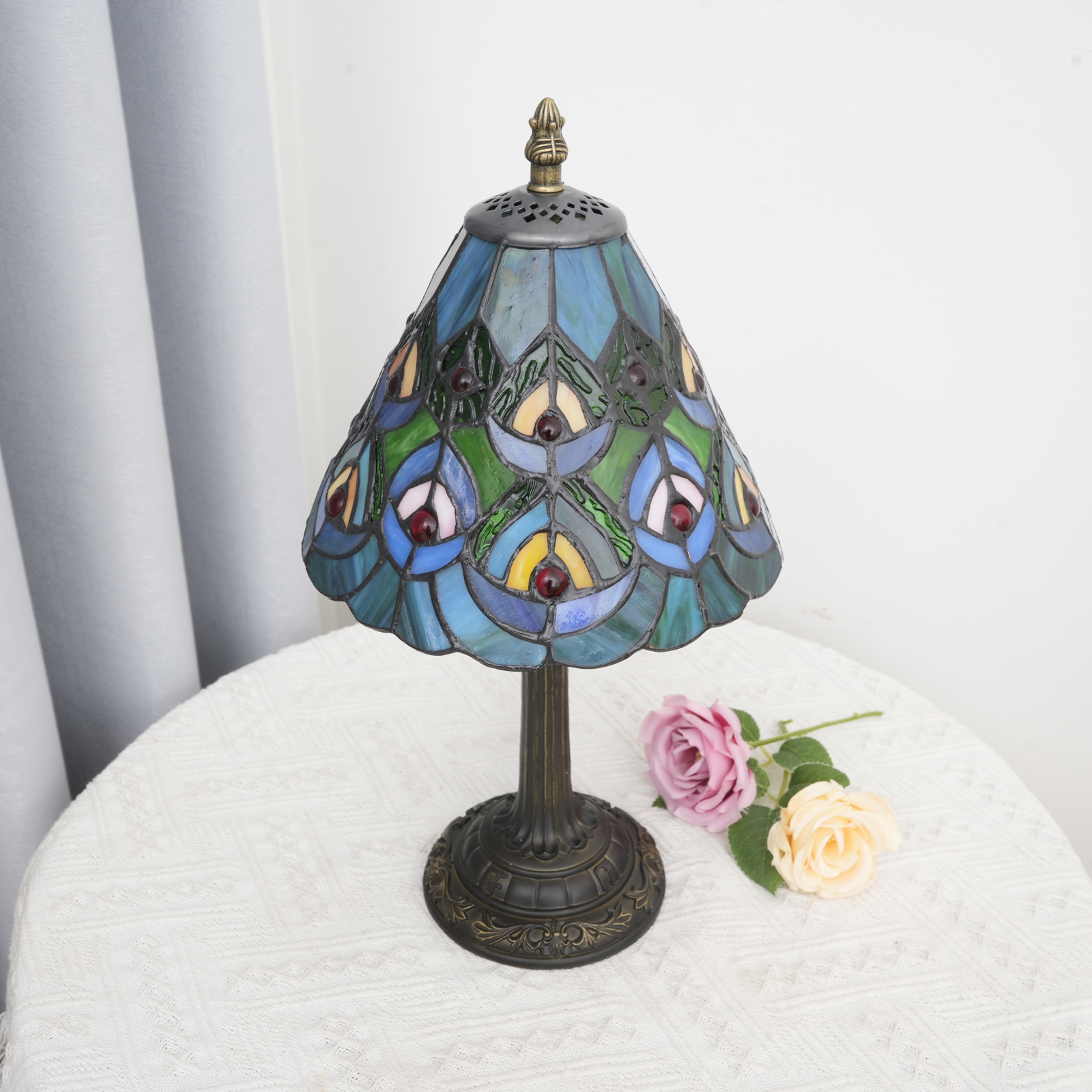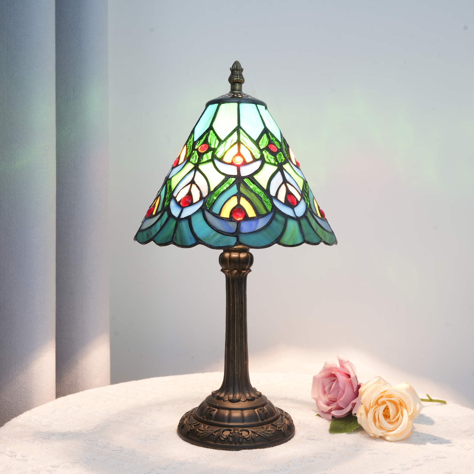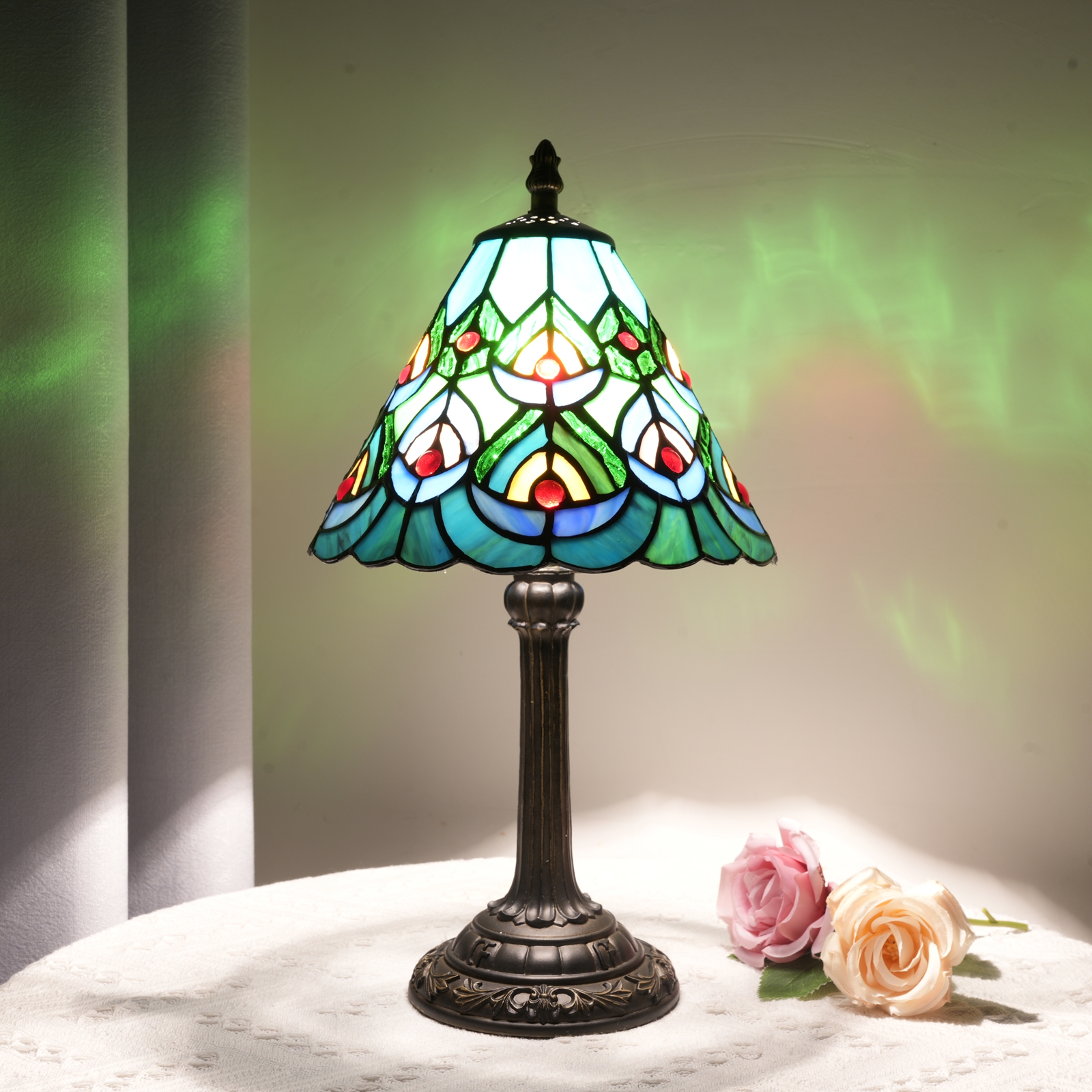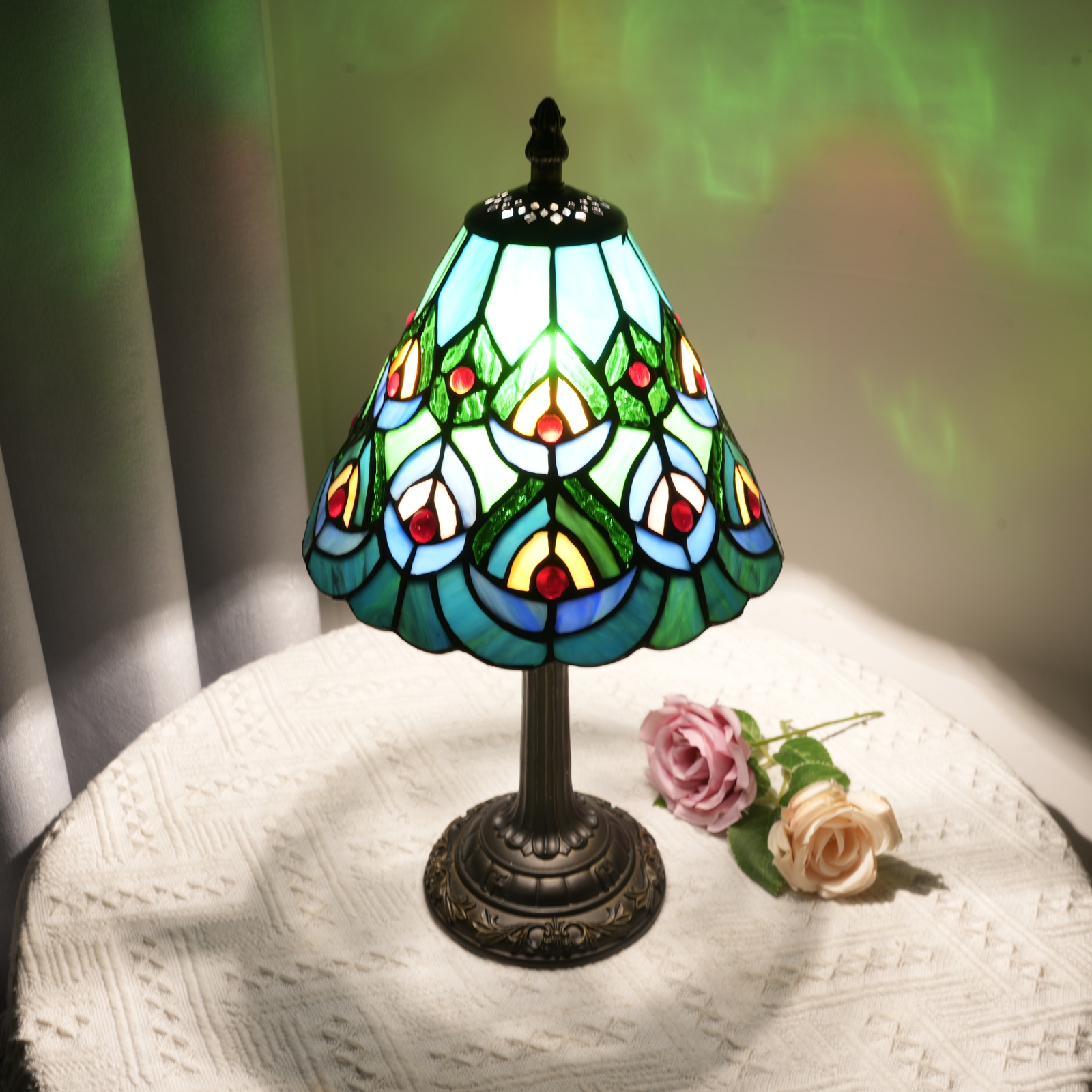 Its lampshade is made of colored stained glass combined with traditional lead wire welding technology, with peacock feathers as the core pattern: the blue and green gradient glass simulates the layering of peacock tail feathers, and the red and yellow transparent decorative color blocks highlight the details of the feather eyes. Some of the glass also incorporates a frosted texture, which not only retains the transparency of Tiffany glass but also makes the light and shadow more soft. When lit up, the colored glass will blend the light into colorful spots, which fall on the table or wall, as if bringing the atmosphere of a retro art gallery into the room.