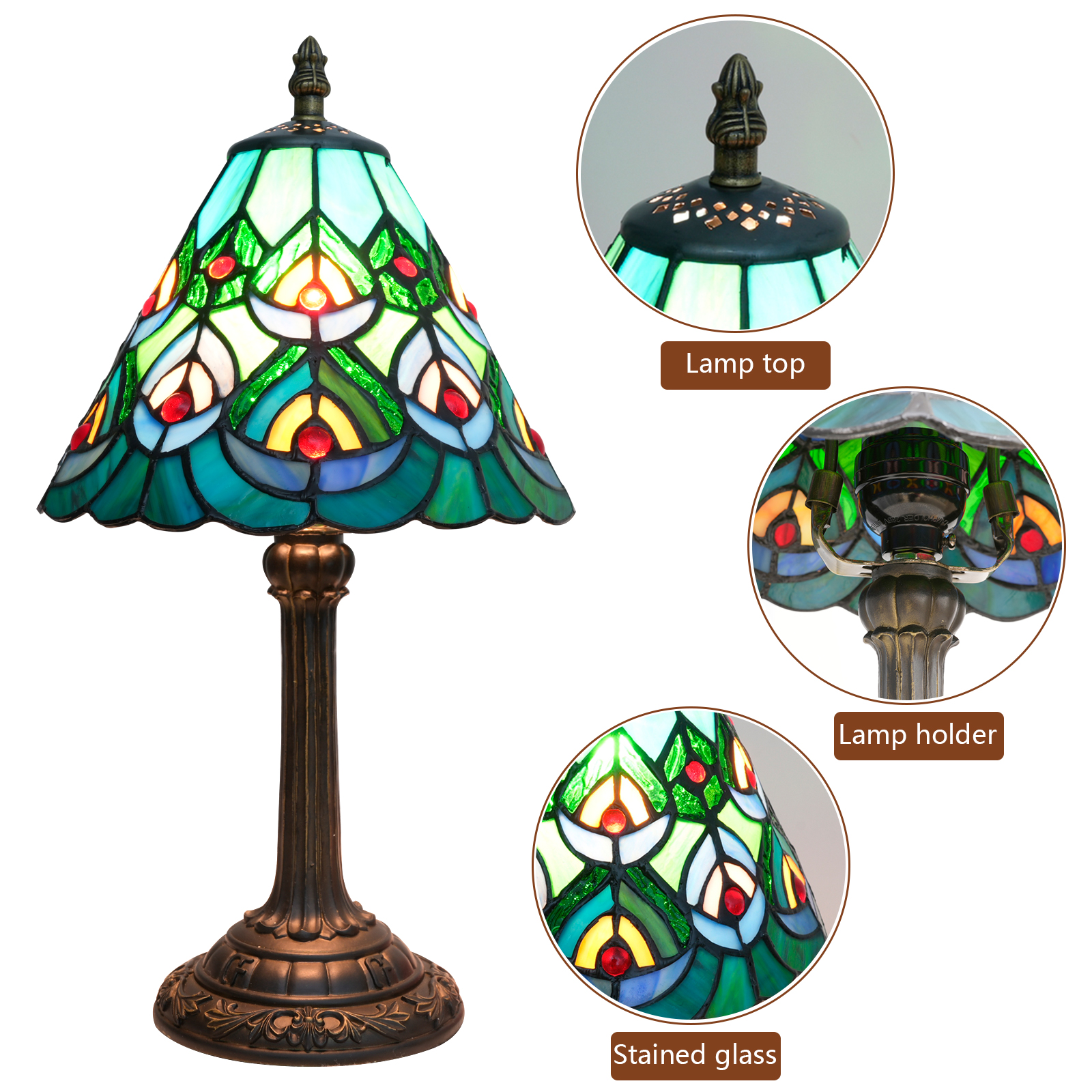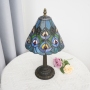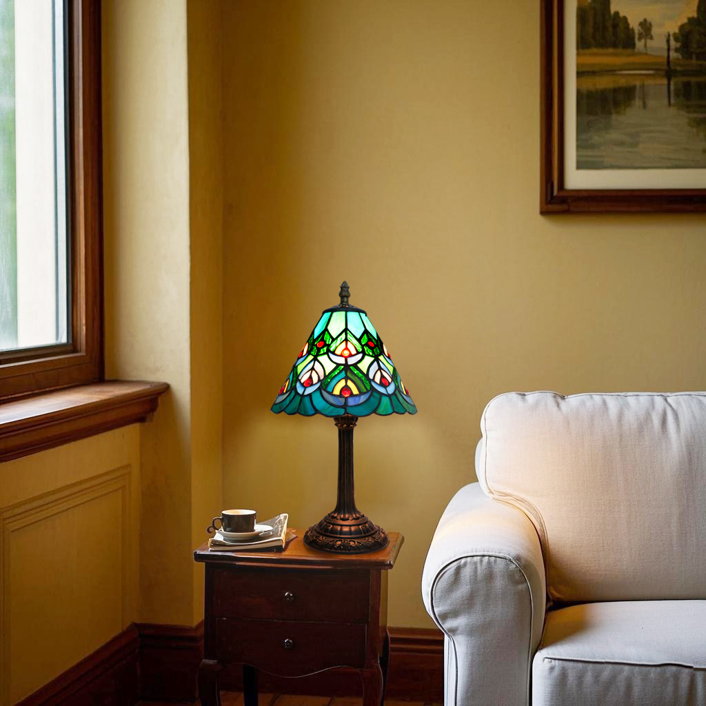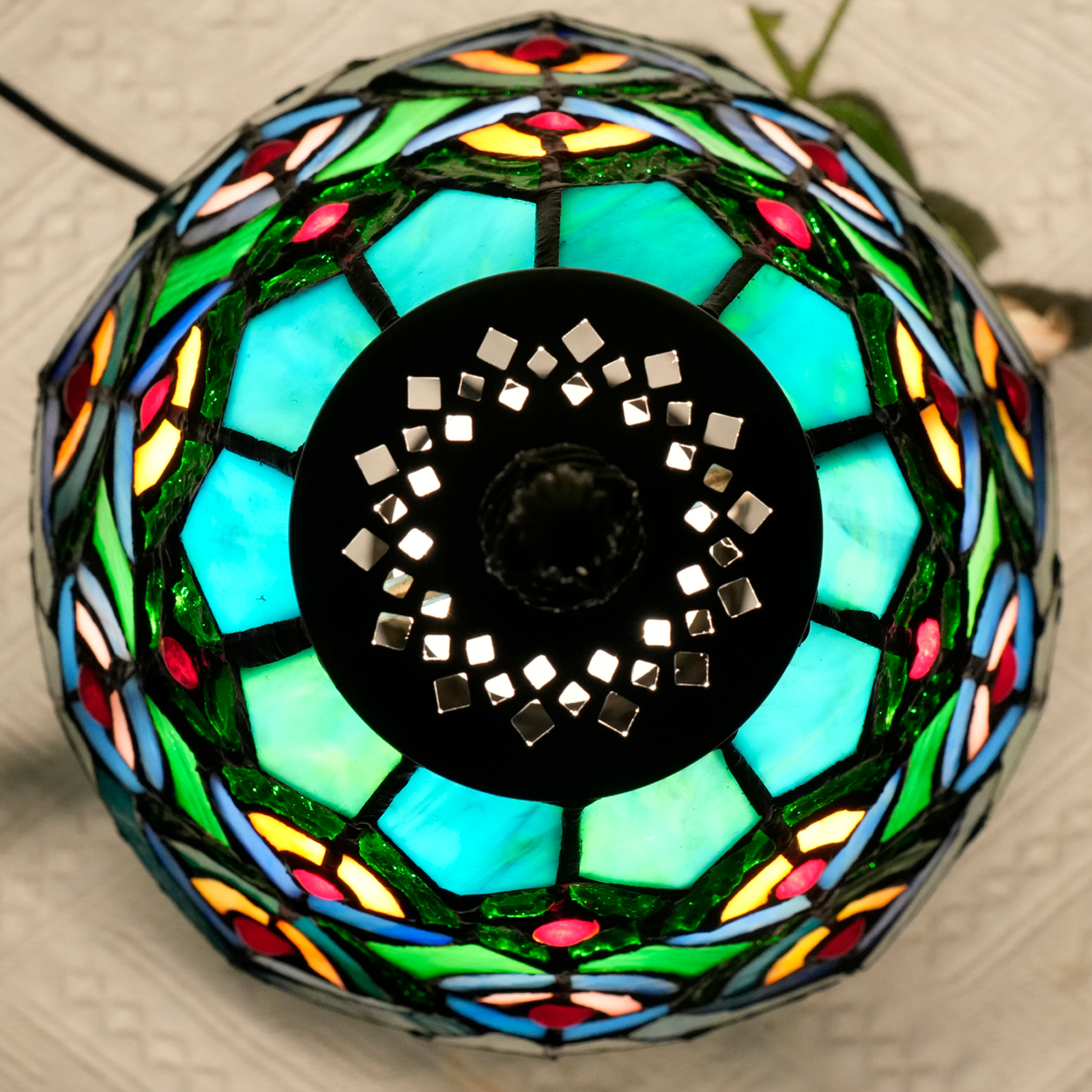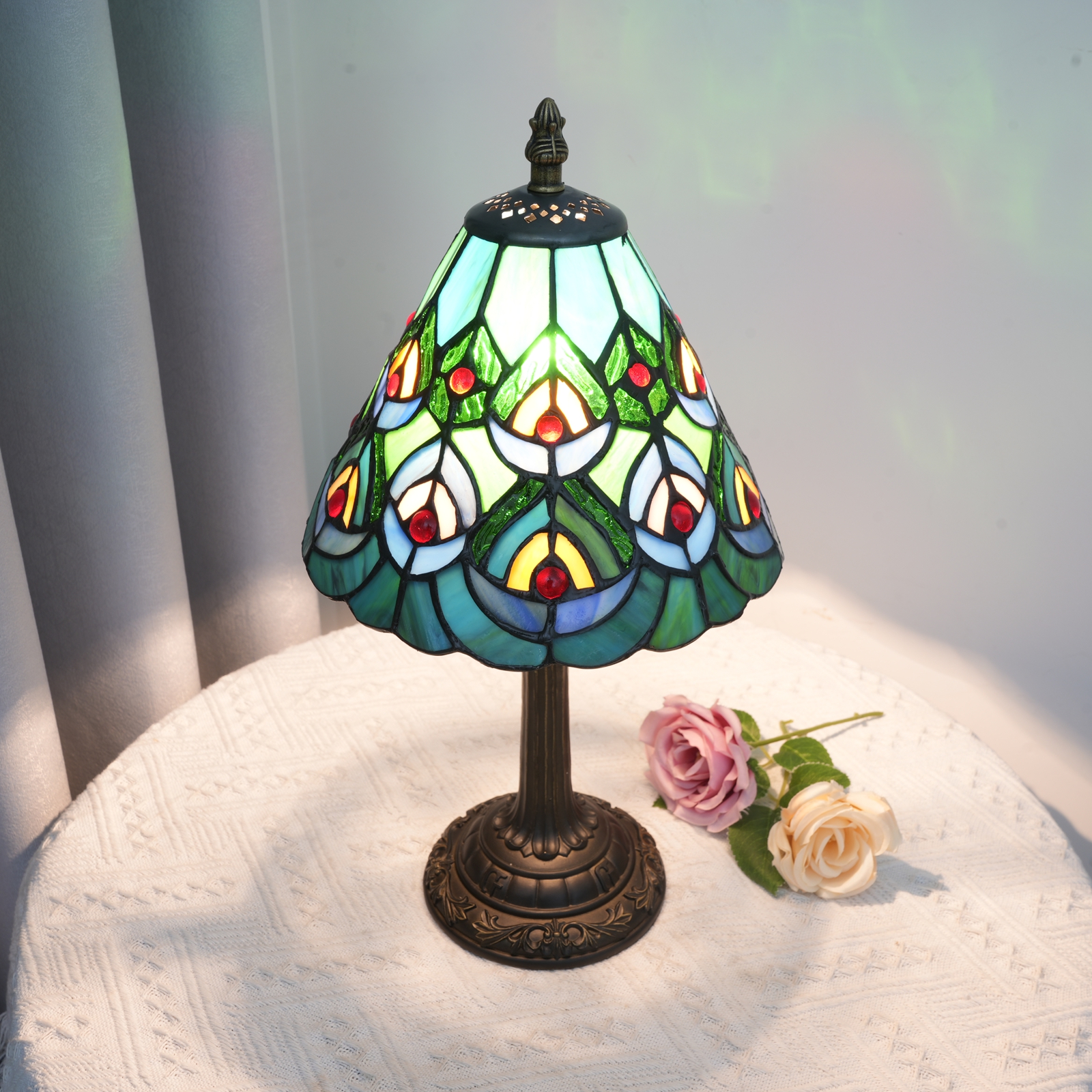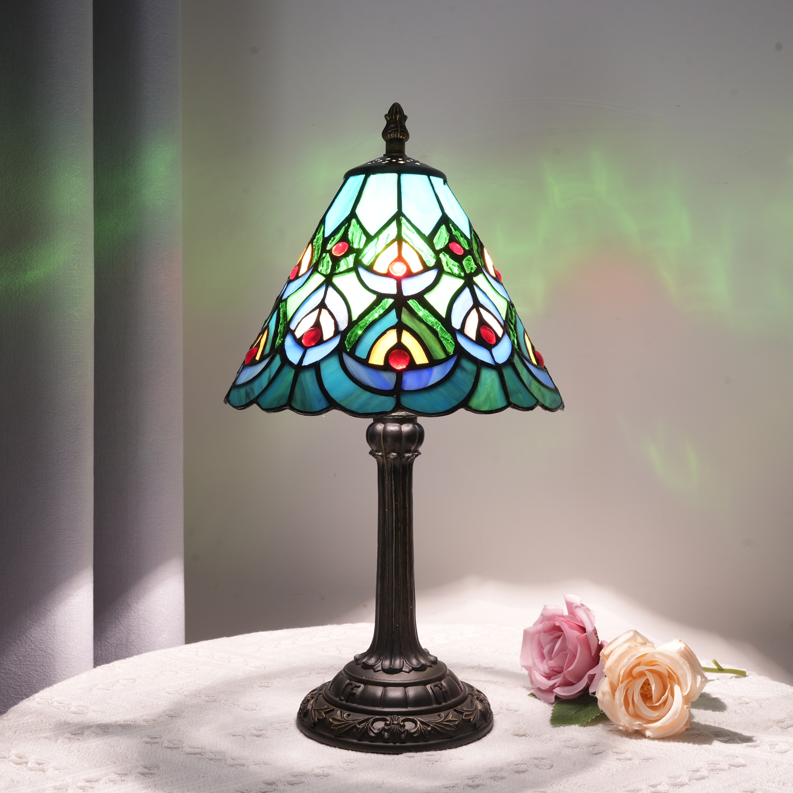 Its lampshade is made of colored stained glass combined with traditional lead wire welding technology, with peacock feathers as the core pattern: the blue and green gradient glass simulates the layering of peacock tail feathers, and the red and yellow transparent decorative color blocks highlight the details of the feather eyes. Some of the glass also incorporates a frosted texture, which not only retains the transparency of Tiffany glass but also makes the light and shadow more soft. When lit up, the colored glass will blend the light into colorful spots, which fall on the table or wall, as if bringing the atmosphere of a retro art gallery into the room.