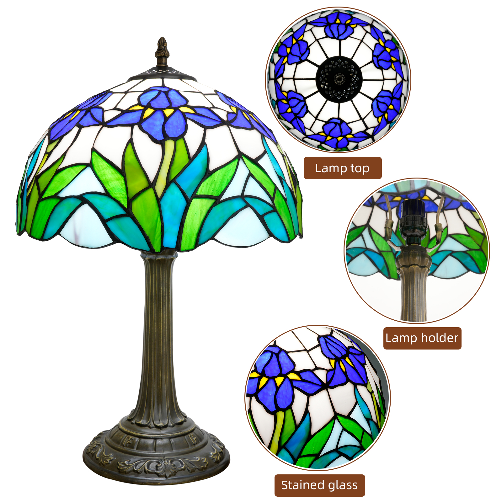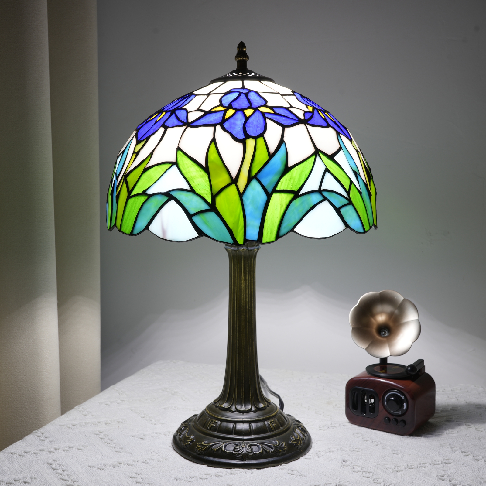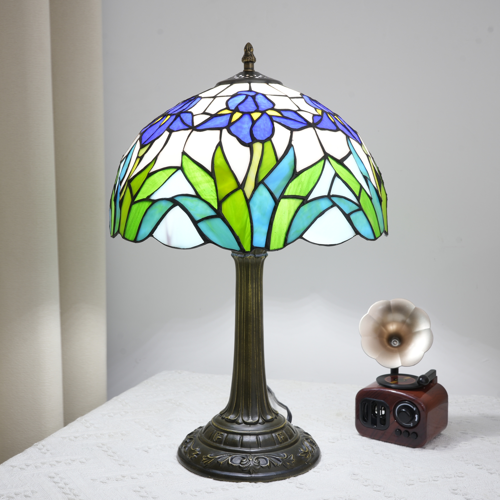 When the faint morning light glides over the arc of the lustrous petals, and when the warm light from the copper-colored lamp posts spreads into the corners at night - this 12-inch Tiffany lamp with blue and white iris petals is a vessel that "breaks art into fragments of life": It holds the romance of a century-old glass-making technique, wraps around the natural poetry of the iris, and conceals the warmth of vintage furniture, making each time the lamp is turned on a gentle encounter with aesthetics.