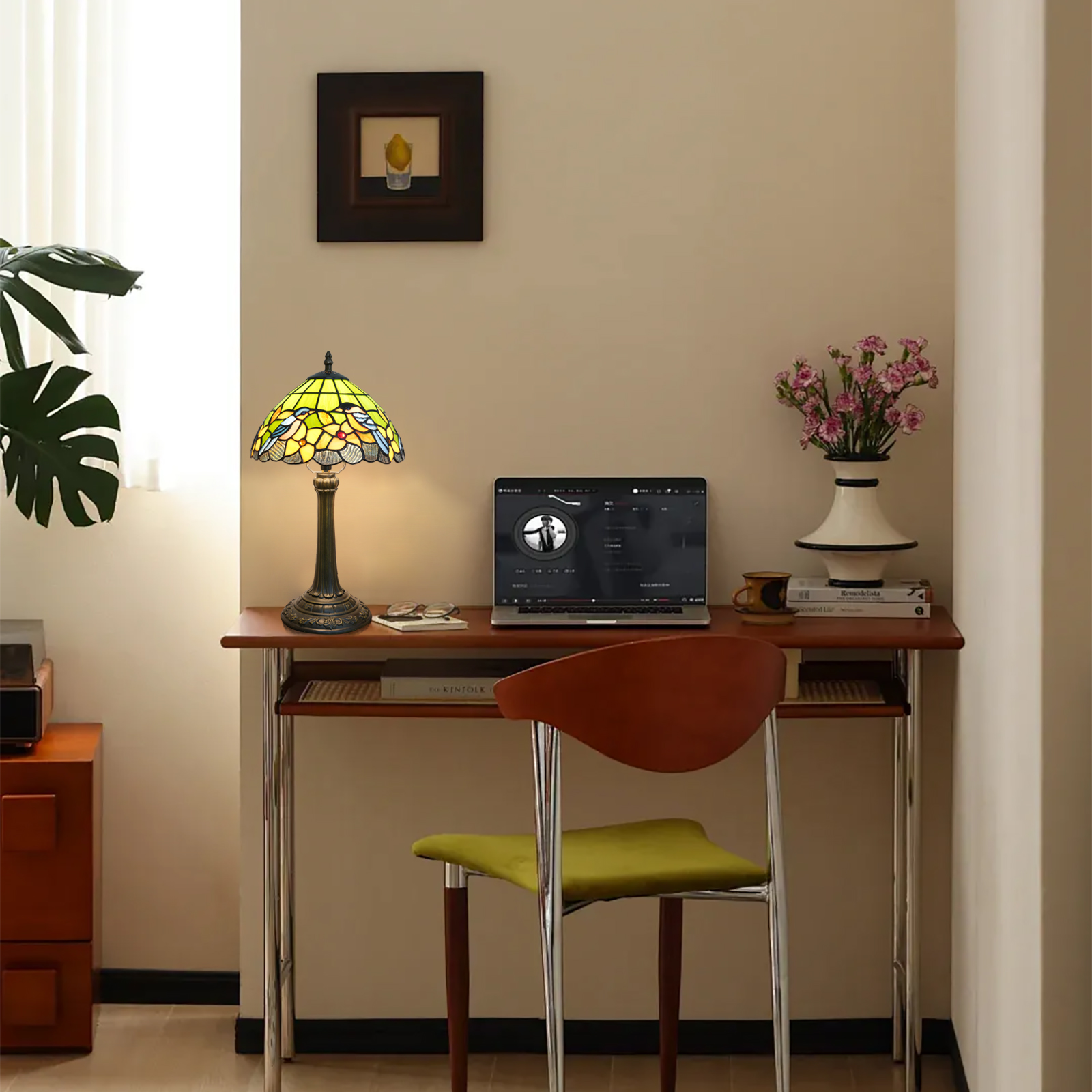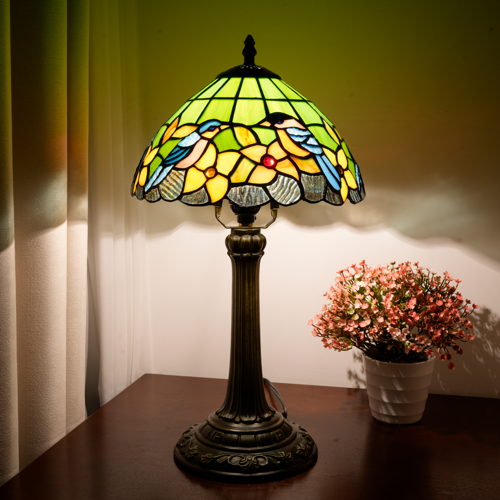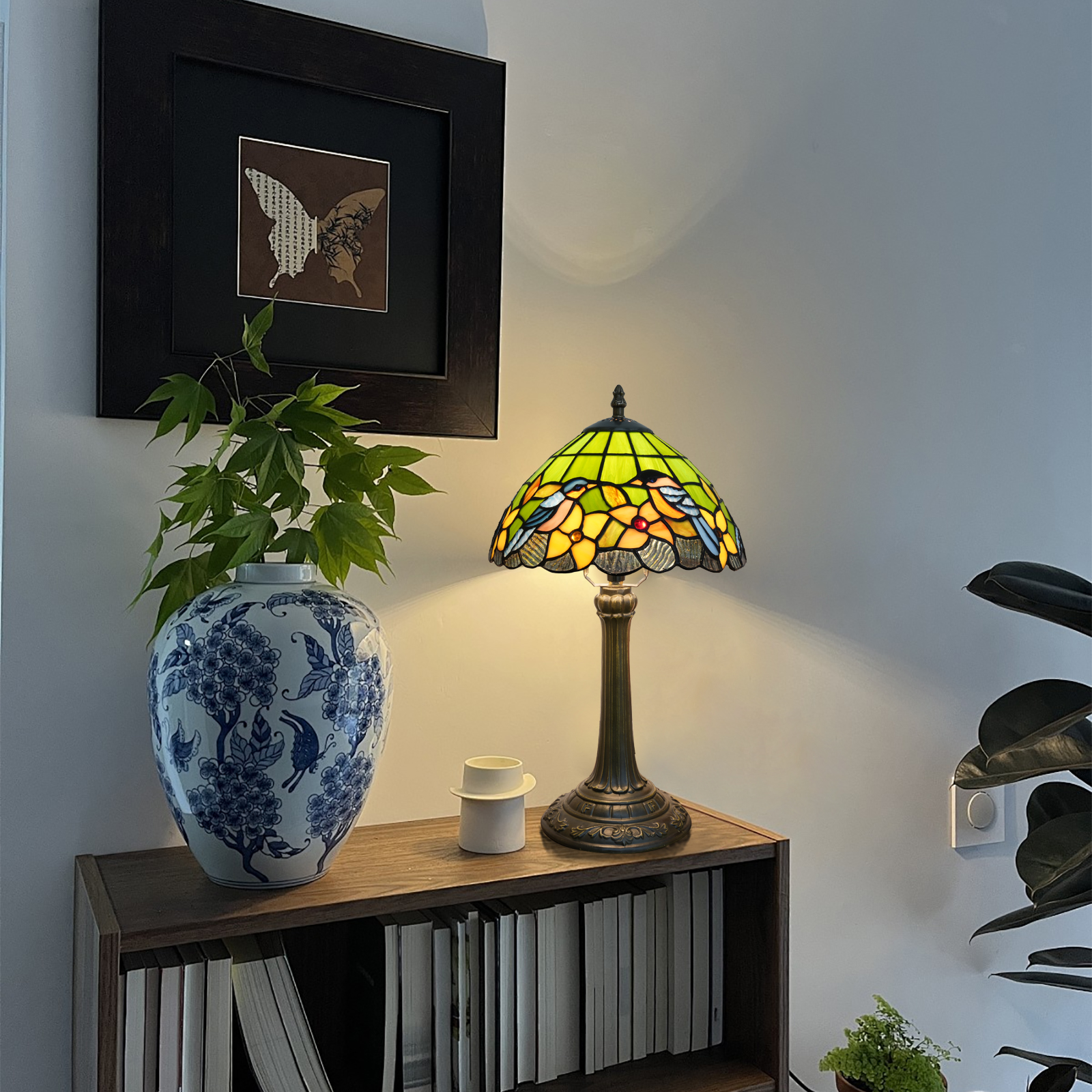 One lamp, one beam of light, one artistic sentiment. This Tiffany-style flower and bird painted glass table lamp is crafted with meticulous craftsmanship to create classics, interpreted with dynamic design to express aesthetics, and protected with practical functions for life. Let it become your artistic companion in the home space, experiencing the poetry and beauty of life in the flowing light, making every ordinary day filled with the warmth of art.