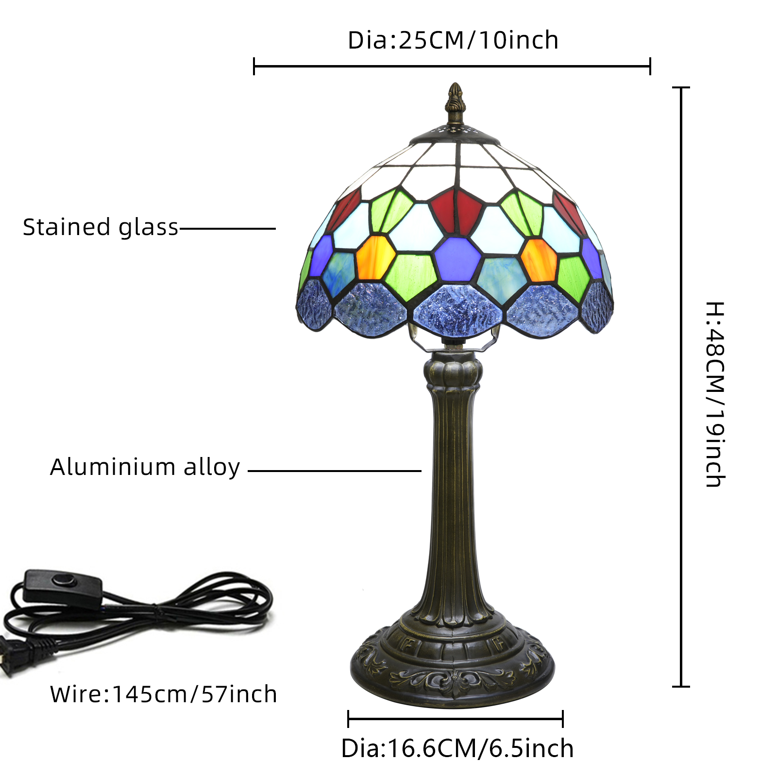 High-quality materials, safe and durable: The lamp base is made of aluminum alloy, which is sturdy and durable, and is not prone to deformation or rust. The colored glass lampshade is resistant to high temperatures and does not break easily, and has a long service life. The power cord is 145CM long, the wire body is soft and wear-resistant, and it is paired with a convenient on-off switch. You can easily control the lamp switch with your hand, making it convenient and safe to use.