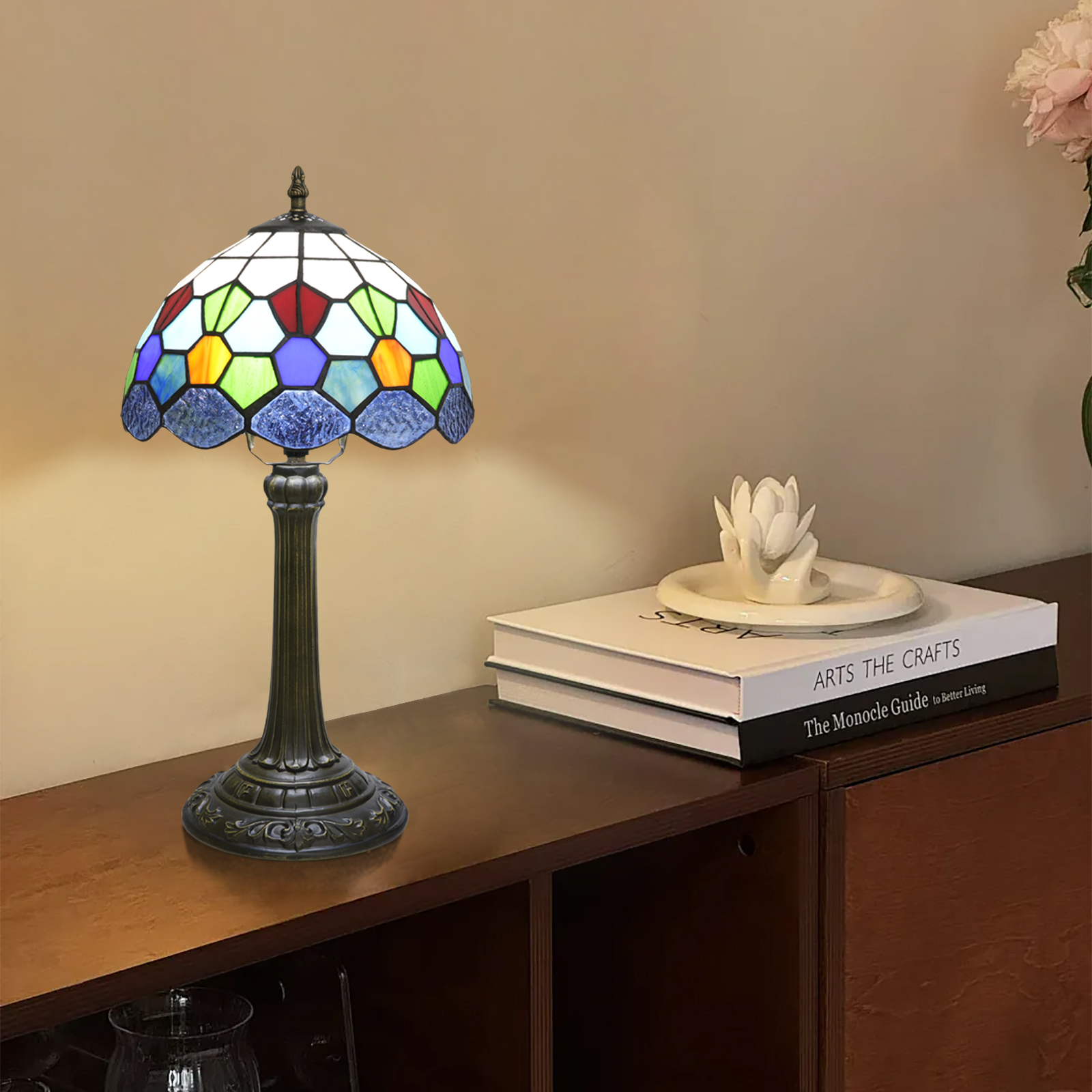 This Tiffany-style diamond-patterned colored glass desk lamp is the crystallization of craftsmanship and aesthetics, a collision of retro and modern. With the craftsmanship of hand-carving, it perfectly combines the colorful nature of colored glass and the regularity of diamond patterns, telling the romance of retro art with light and shadow, and interpreting the quality of home life with texture.