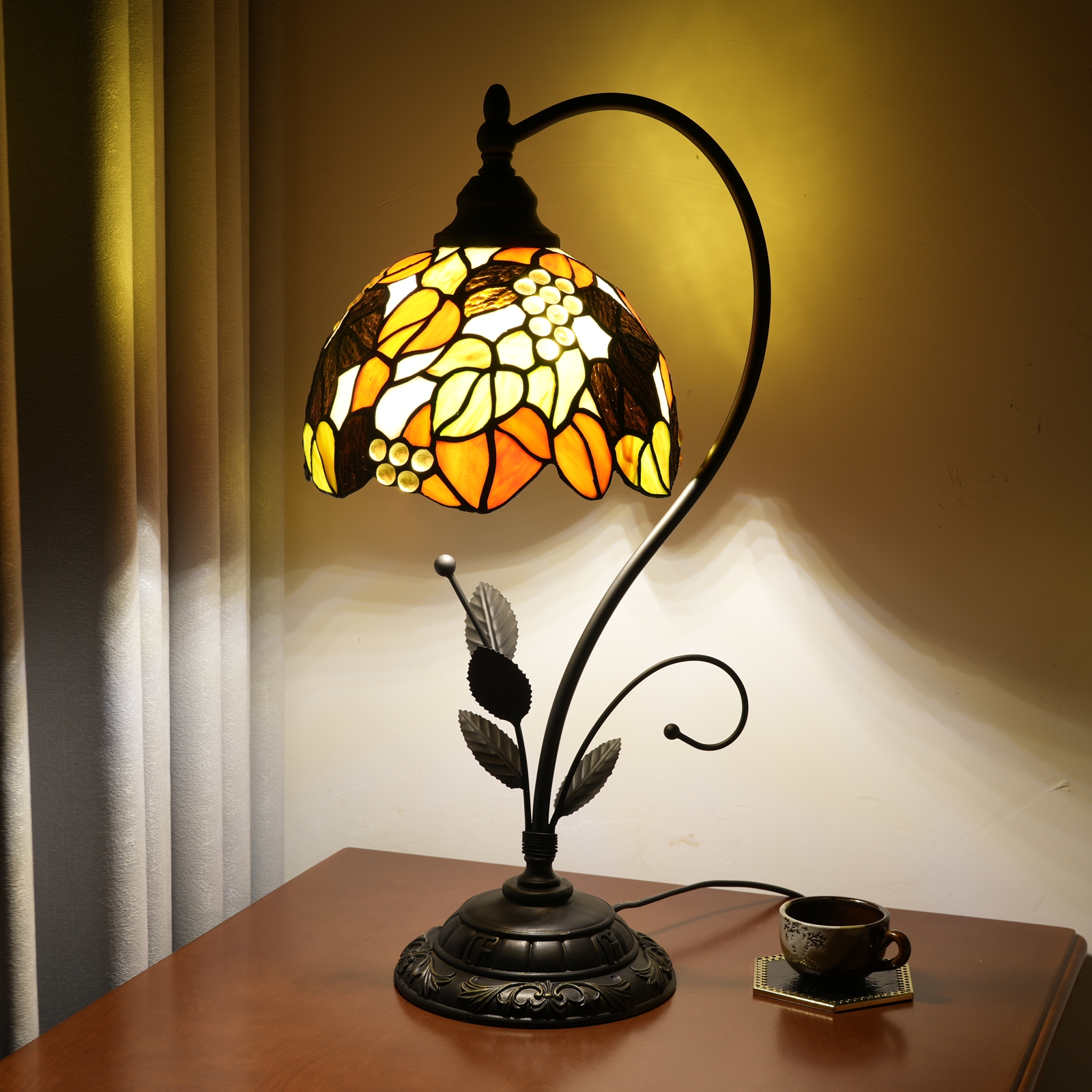 When the lights are turned on, the colored glass filters and refracts the light, making the patterns of maple leaves and grapes more vivid in the light. The warm yellow light shines through the glass onto the space, creating a cozy and quiet atmosphere, as if capturing the beauty of autumn and the vitality of nature in a small space. Whether placed on the bedside of the bedroom, the desk of the study, or the side table of the living room, it can become the visual focus of the space, making each lighting on a lamp a gentle encounter with nature and art.